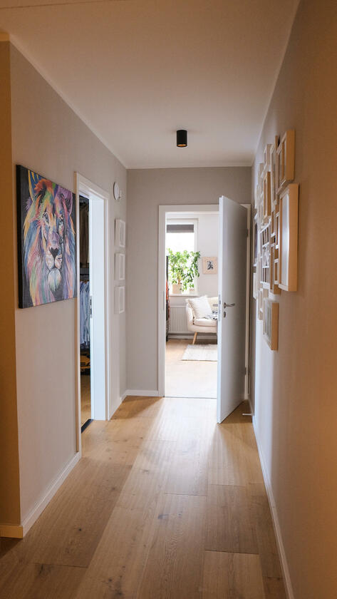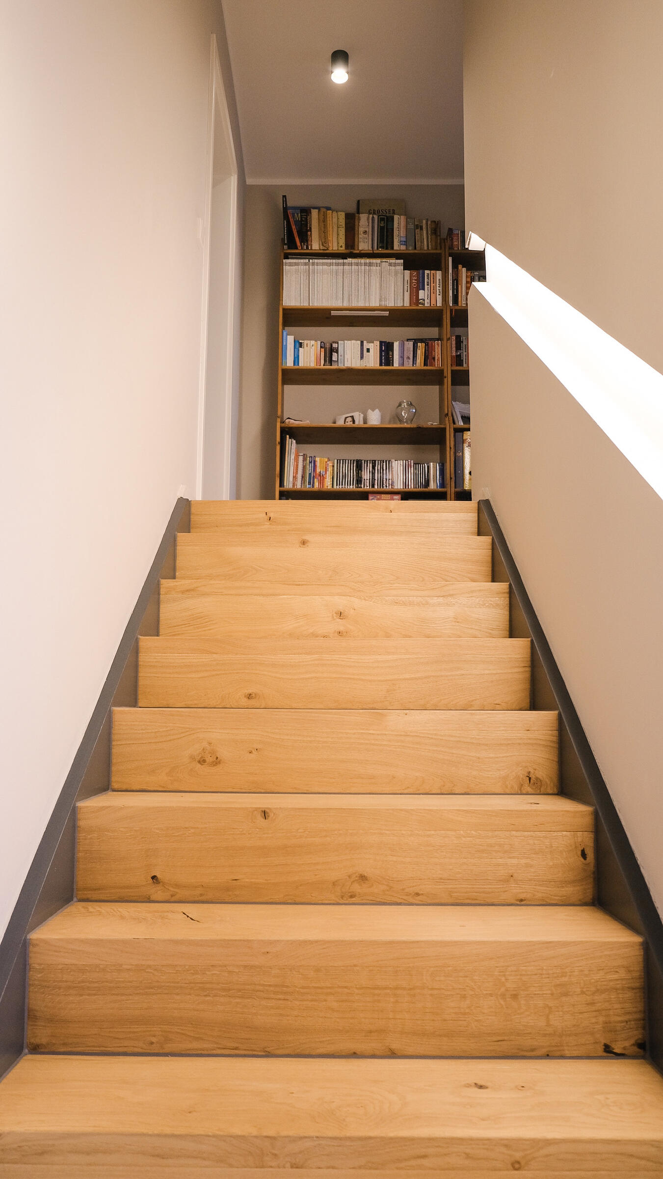 Über eine Holztreppe mit Eichenstufen gelangt man ins Obergeschoss, welches sich nach Osten in Elternteil und nach Westen in Gäste- und „Kinder“-teil trennt. Auf der rechten (Osten) Seite befindet sich ein kleines Büro und das Elternschlafzimmer mit en Suite-Bad, welches mit einer freistehenden Badewanne, einem Doppelwaschtisch, Bidet und Toilette und einer großzügigen, begehbaren Dusche komplett ausgestattet ist.