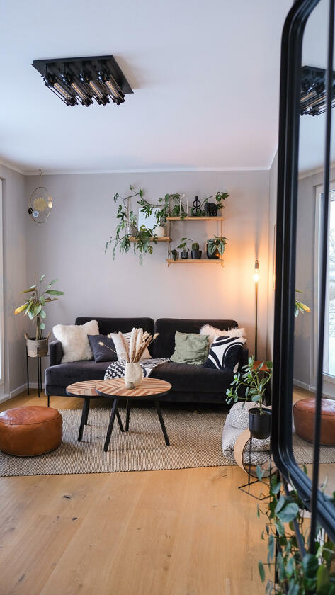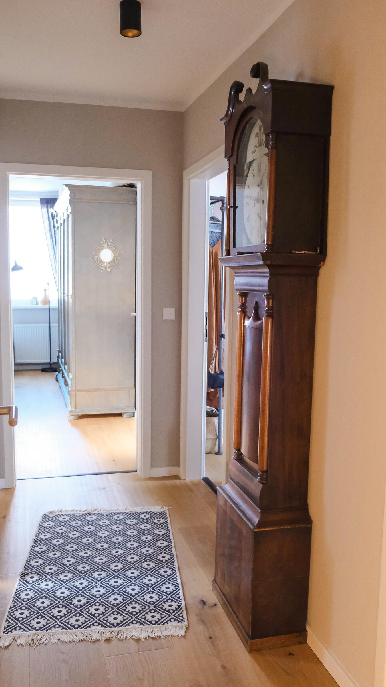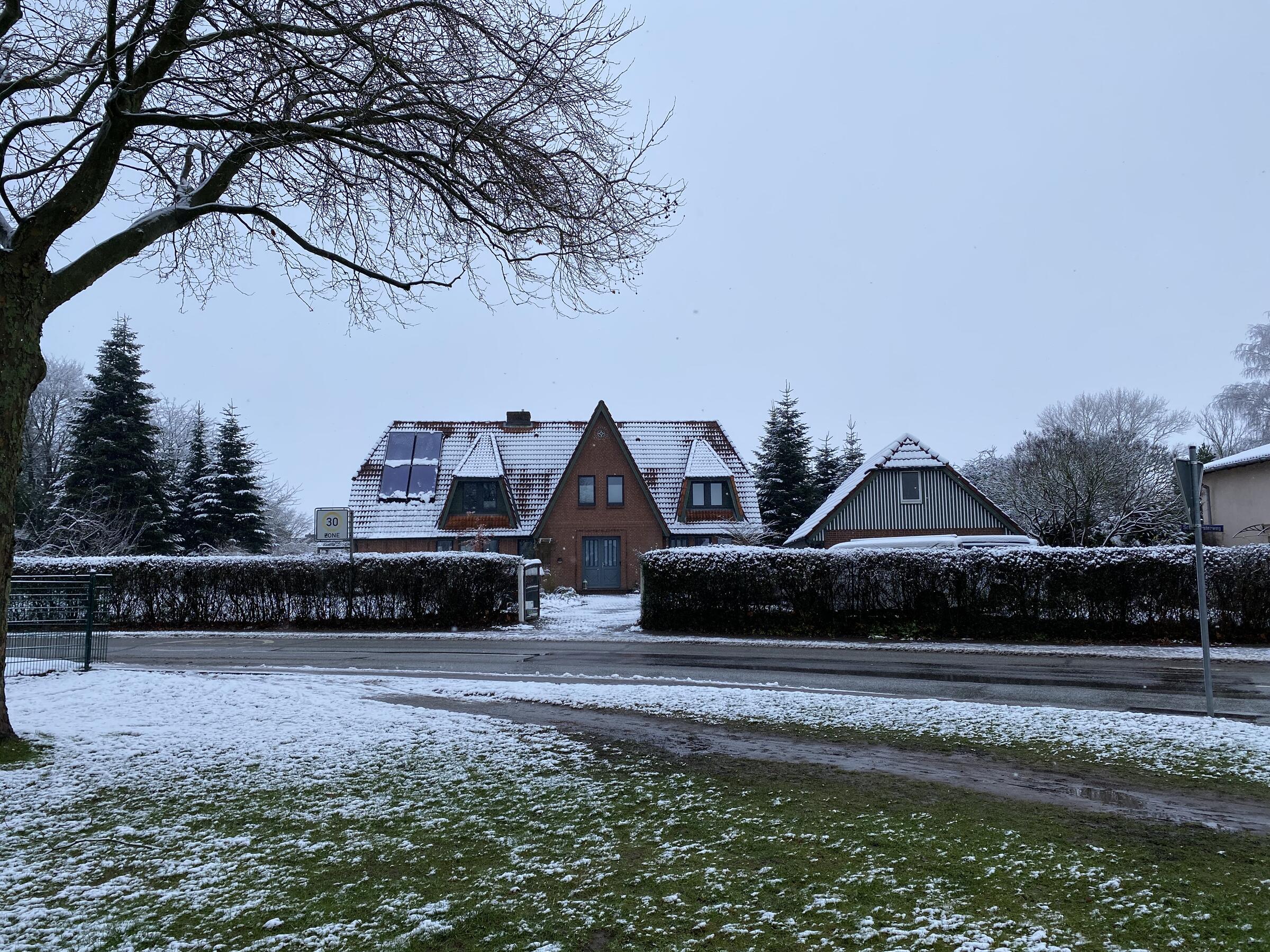 Unser freistehendes Einfamilienhaus mit seinem charakteristischen Spitzgiebel wurde im Jahr 2020 mit viel Liebe kernsaniert und modernisiert. Im Erdgeschoss wurden die Räume geöffnet und ein 270°-Kamin als Blickfang zwischen Ess- und Wohnzimmer platziert. Im Wohnbereich des Untergeschosses befindet sich, mit Ausnahme des graugefliesten Eingangsbereichs, der Gästetoilette und des Hauswirtschaftraumes, geöltes Eichenparkett in einer sehr besonderen Optik. Direkt an das Wohn- und Esszimmer grenzt die anthrazitfarbene, offene Küche mit einer großen Kochinsel im Zentrum. Eine Abstellkammer, ein Hauswirtschaftsraum bzw. Speisekammer, eine ausgefallen tapezierte Gästetoilette, sowie der Zugang zur Praxis und zum Keller sind ebenfalls im Erdgeschoss verortet. Rundherum befinden sich zahlreiche Fenster, die die Räume lichtdurchfluten und sich zum Garten und der Feldrandlage bodentief und groß dimensioniert öffnen, um den Blick über die nordwestlich gelegenen Wiesen und Hügel freizugeben. Hinter der doppelflügeligen Eingangstür bilden Flur und die Diele den großzügigen Eingangsbereich, der von einer modernen, schwarzen Lofttür getrennt wird und viel Platz für eventuelle Technik bietet.