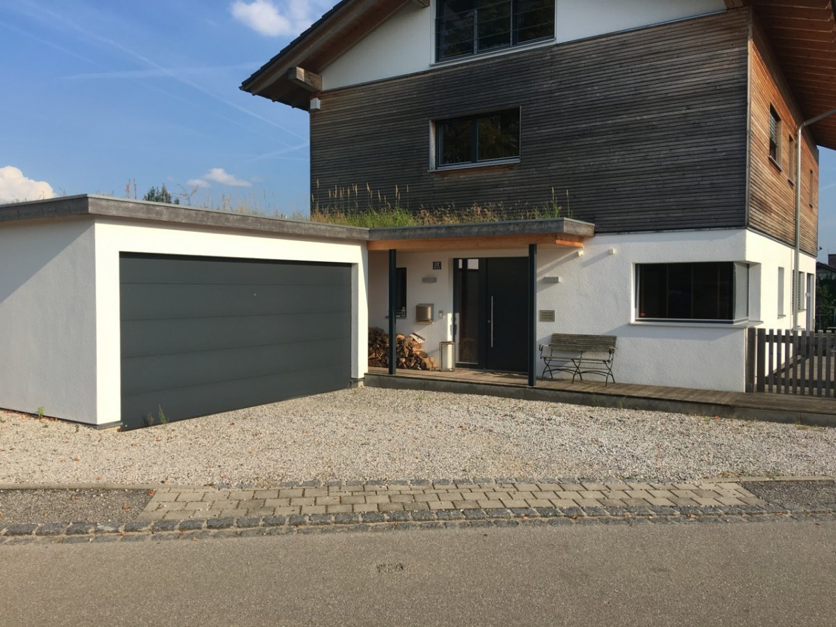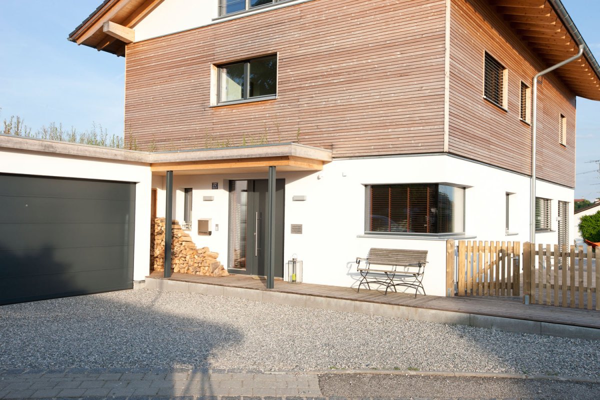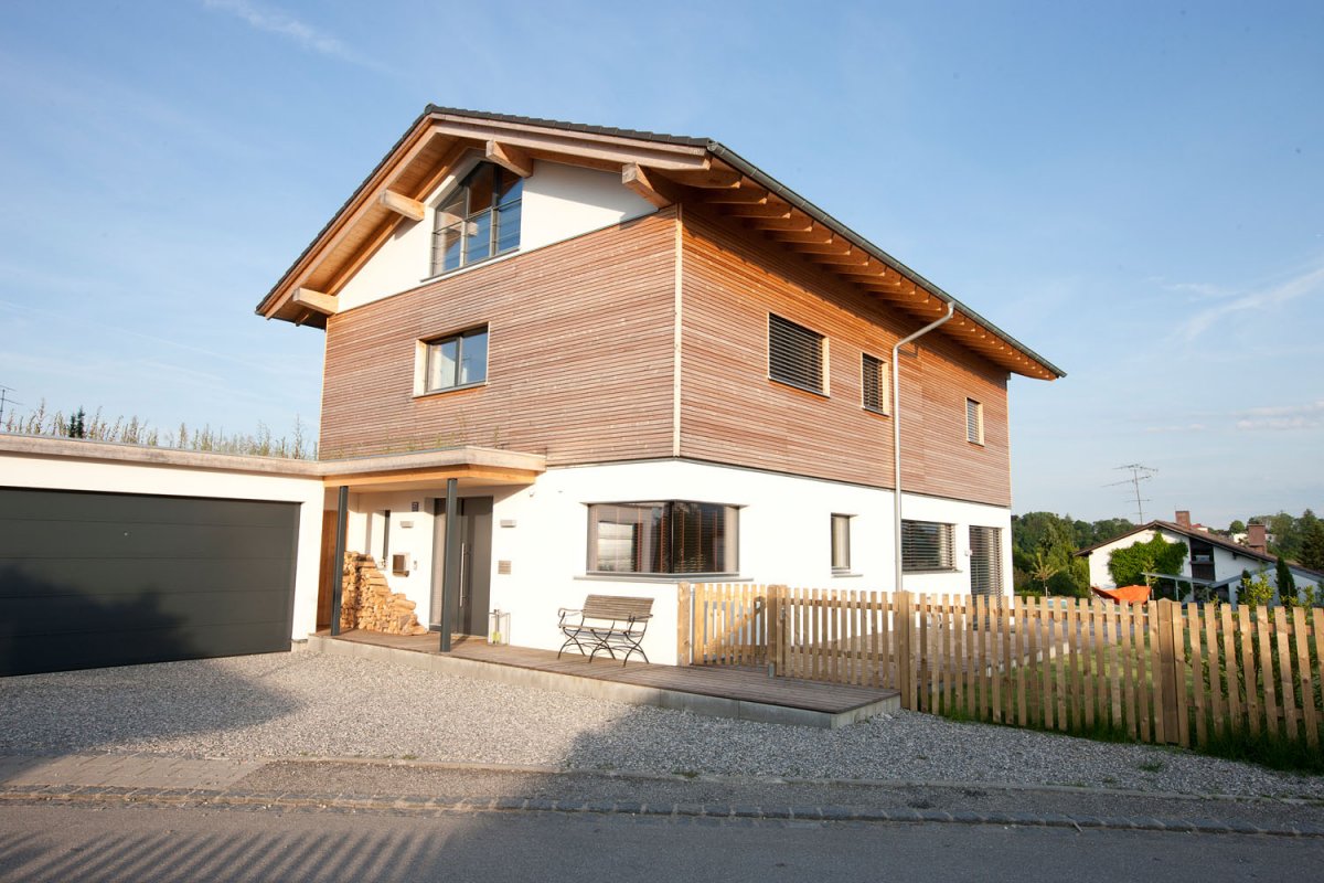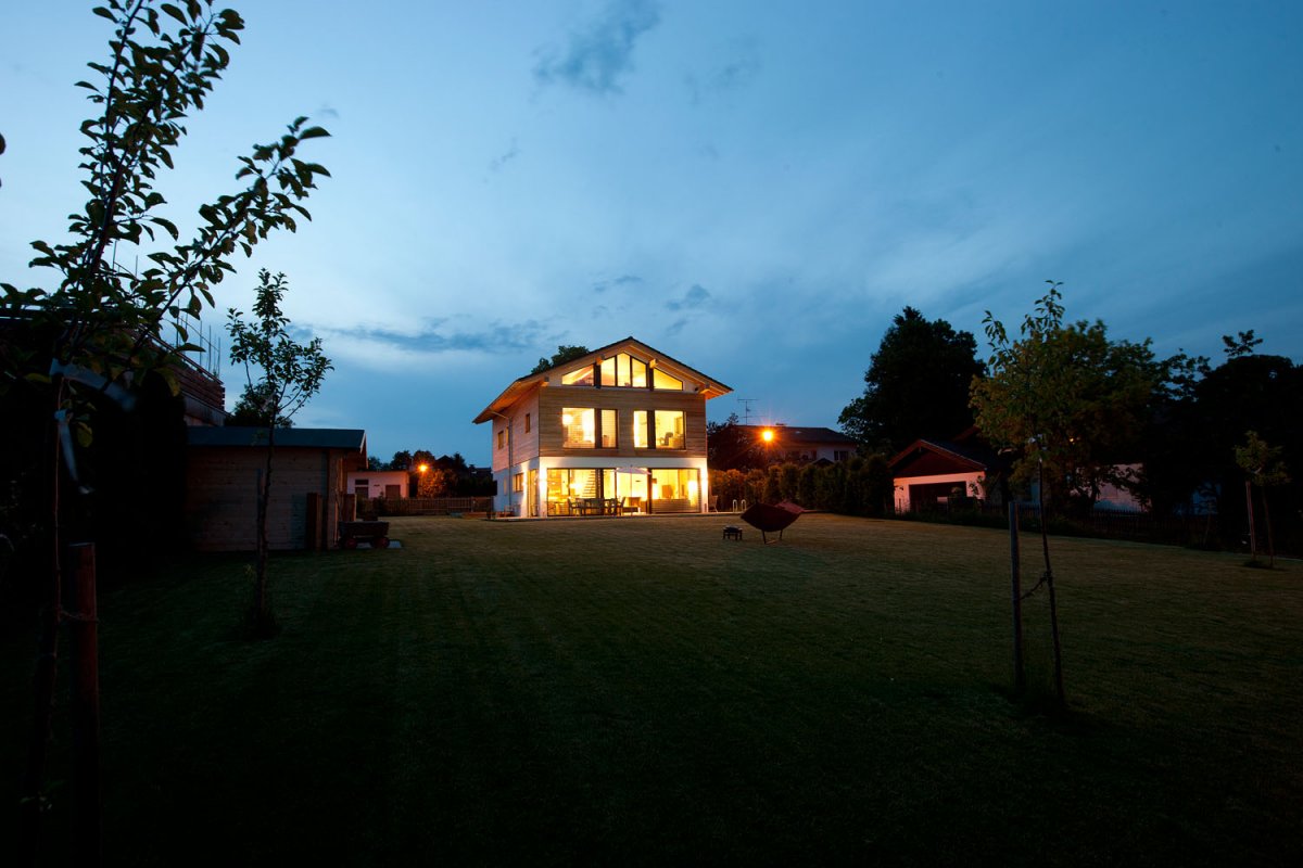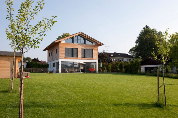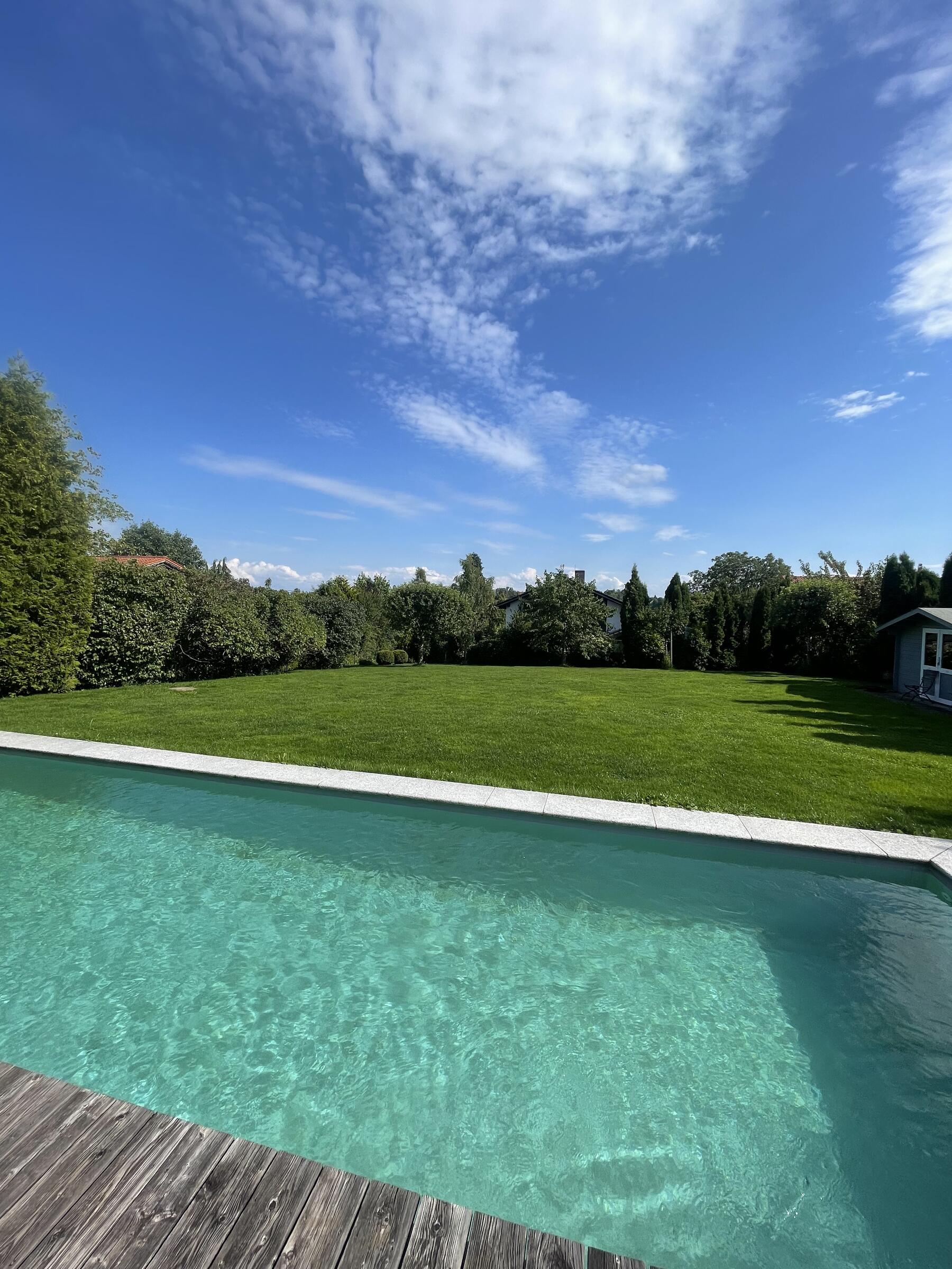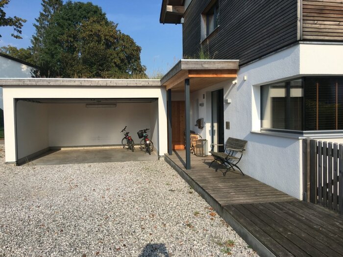 Das fantastisch gelegene Einfamilienhaus mit seinem großen, umgebenden Garten und umlaufender Holzterrasse, liegt im Münchner Süden. Der beheizbare Außenpool grenzt direkt an die Sonnenterrasse und verbindet die weitläufige, gepflegte Rasenfläche mit dem Haus. Die lichtdurchfluteten Räume sind in einem modernen Stil eingerichtet und weisen zeitgemäße Designelemente auf. Die amerikanische Küche samt Küchenblock, der edle Nussbaumboden und die offene, einen freien Blick ermöglichende Bauweise, lässt die im Erdgeschoß befindlichen Räume sehr elegant und großzügig wirken. Die Holzbauweise findet Ihre Fortsetzung in der freischwingenden Treppe zum Obergeschoß. Offene Stahlträger, ein Kamin im Wohnbereich und die großen Fenster geben dem Haus einen individuellen Charakter der individuell, wohnlich und einladend wirkt. Das Niedrigenergiehaus besitzt ein schönes, hell gefliestes Badezimmer mit Waschtisch, Dusche und Badewanne. Im Untergeschoss stehen Kellerräume auf Anfrage zur Verfügung.