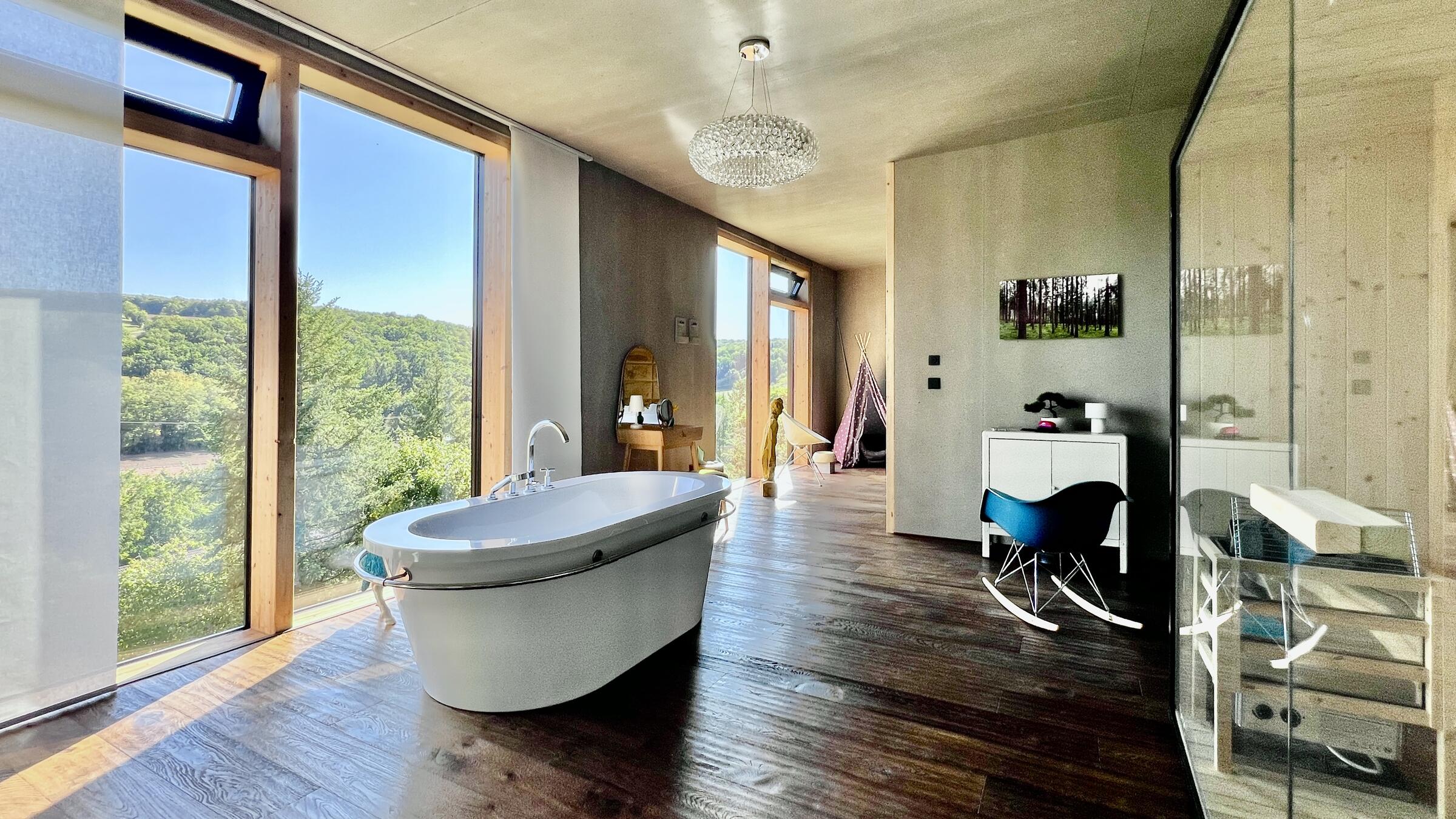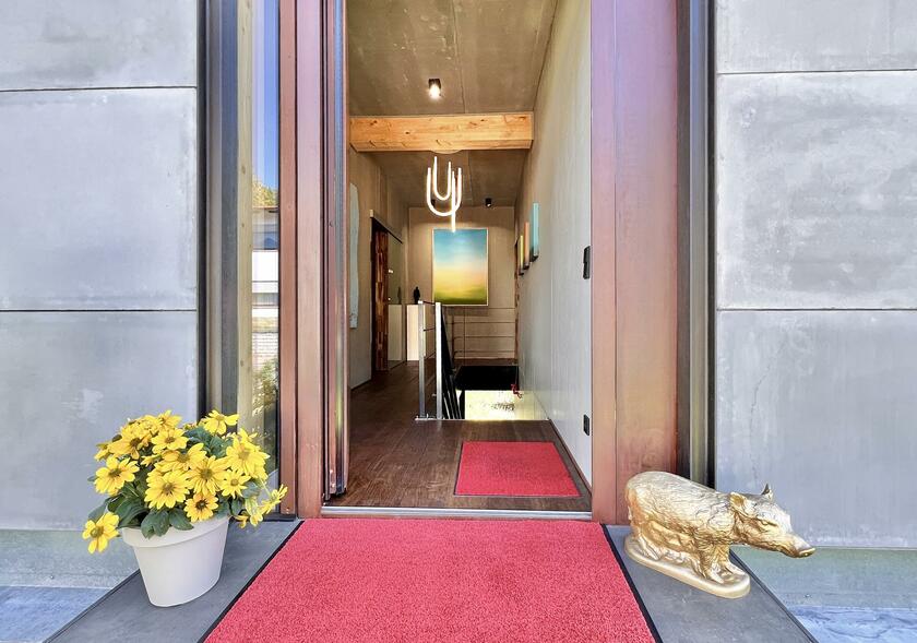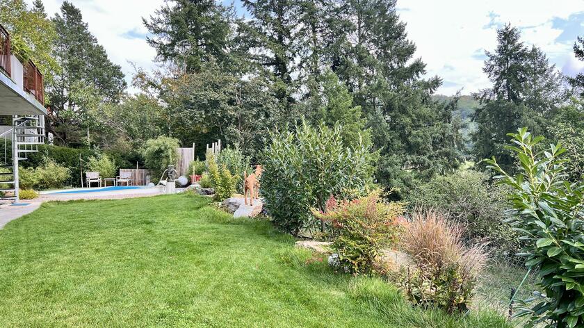 Unser modernes Architektenhaus vereint puristisches Design mit großzügiger Raumgestaltung und einzigartiger Lage, eingebettet in eine ruhige, unverbaubare Naturlandschaft. Bereits die Außenfassade beeindruckt als klares Betonhaus mit markanter Cortenstahleingangstür. Im Inneren setzen sich die Sichtbetonwände fort und schaffen in Verbindung mit edlen Eichenholzböden eine klare, zeitlose Ästhetik. Der offen gestaltete Wohnbereich verbindet Kochen, Essen und Wohnen auf einer Ebene und schafft eine helle, kommunikative Atmosphäre. Im Obergeschoss erwartet Sie eine exklusive Schlaf- und Badsuite mit Sauna, ein großes und künstlerisch gestaltetes Gäste-WC sowie eine mit Kunst ausgestattete Diele mit markanter Stahltreppe. Großflächige Panoramafenster, die nach Süden ausgerichtet sind, geben den Blick in die Natur frei und durchfluten die Räume ganztägig mit Licht. Für atmosphärische Aufnahmen sorgt ein Kamin im Wohnbereich, der eine warme und zugleich stilvolle Stimmung erzeugt. Zur Ausstattung zählen ein Swimmingpool im Außenbereich, sowie ein Billardzimmer mit Musikecke und eine Kaffeebar im großzügigen und offenen Wohnbereich. Ergänzt wird das Ensemble durch ein separates Nebengebäude, das der Crew als Arbeits- und Aufenthaltsbereich zur Verfügung steht. Ein liebevoll angelegter kleiner Weinberg sowie ein weitläufiges Gartengrundstück schaffen eine atmosphärische Umgebung und eröffnen zusätzliche, vielseitige Dreh- und Fotomotive. Großzügige Parkmöglichkeiten direkt am Haus sowie zusätzliche Stellflächen am angrenzenden Wendehammer garantieren eine bequeme Logistik ohne Durchgangsverkehr. Der Standort zeichnet sich zudem durch eine absolut ruhige Lage mit nur wenig Bebauung im angrenzenden nachbarschaftlichen Bereich aus – ideale Voraussetzungen für konzentriertes Arbeiten am Set.