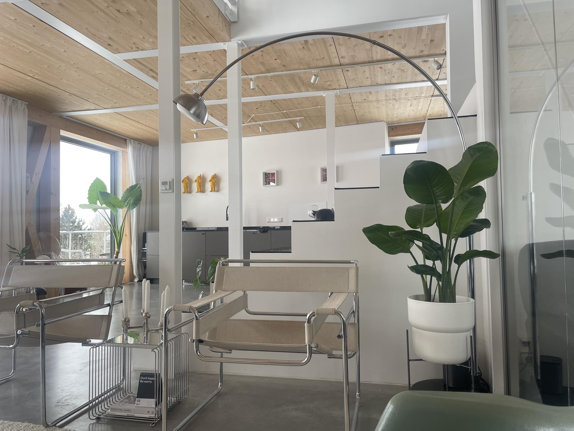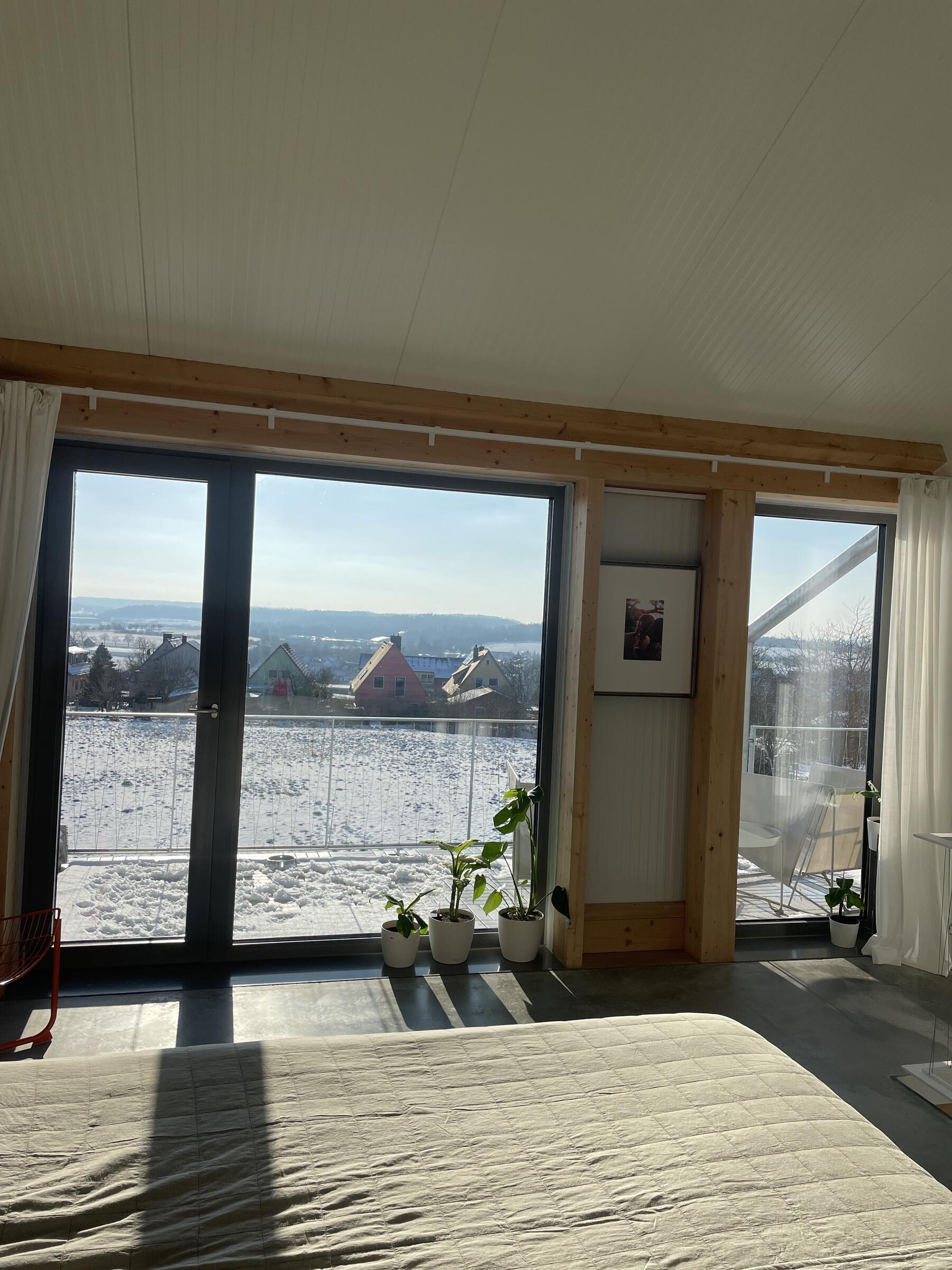 Unser in Holzständerbauweise nachhaltig errichtetes Haus befindet sich in einem Neubaugebiet, am Ende einer wenig befahrenen Sackgasse. Die Räume sind hell und zeitgemäß eingerichtet. Durch die großen Fenster fällt viel Tageslicht in die Räume. Die Fenster können mit weißen Vorhängen verdunkelt werden. Die Böden im Haus bestehen aus grauem Estrich mit individuellem Muster. Der Boden im Badezimmer besteht aus achatgrauem Gußboden. Die Räume dürfen nach Absprache umgestaltet werden. Auf unserem Grundstück stehen 4 Pkw-Parkplätze zur Verfügung. Weitere Parkplätze gibt es auf der Straße vor unserem Haus.