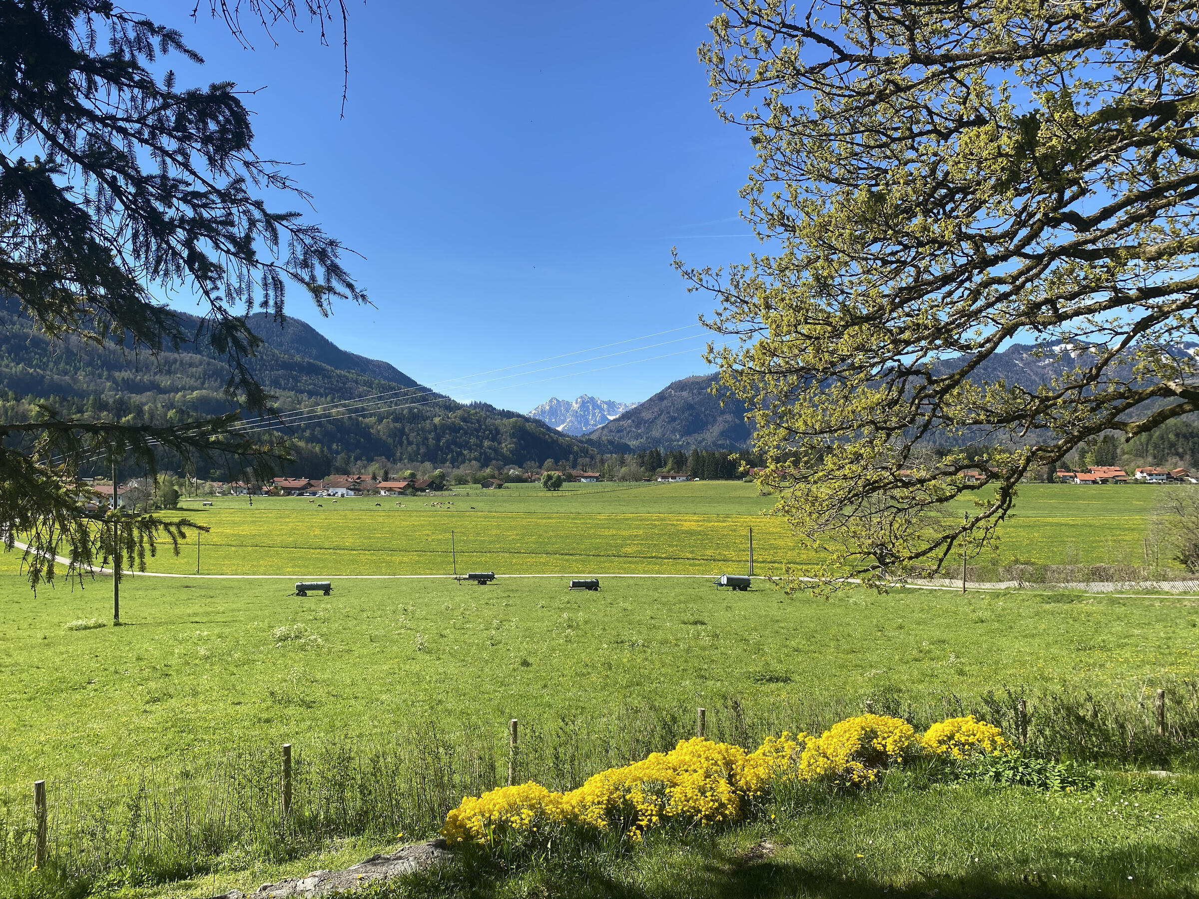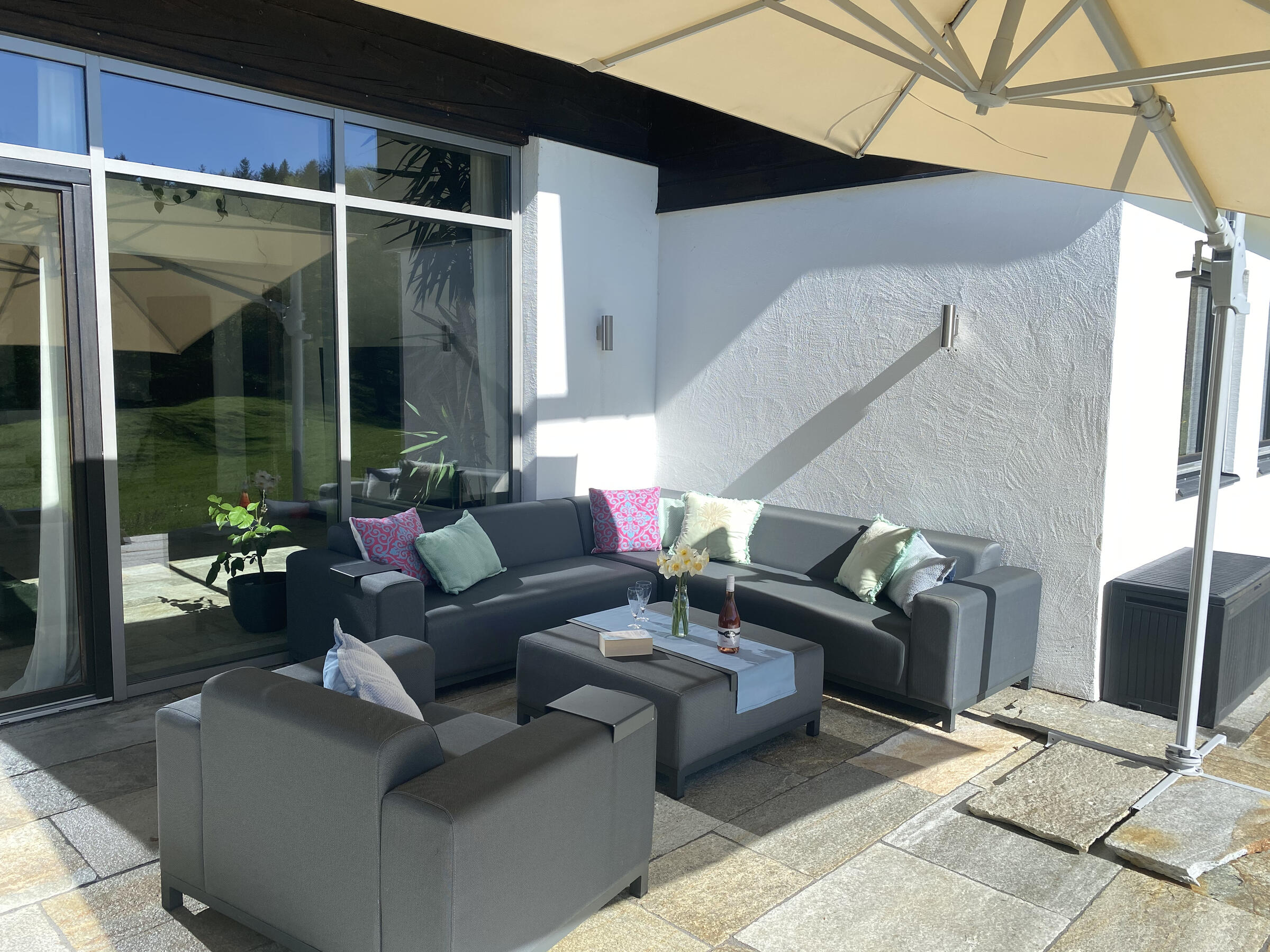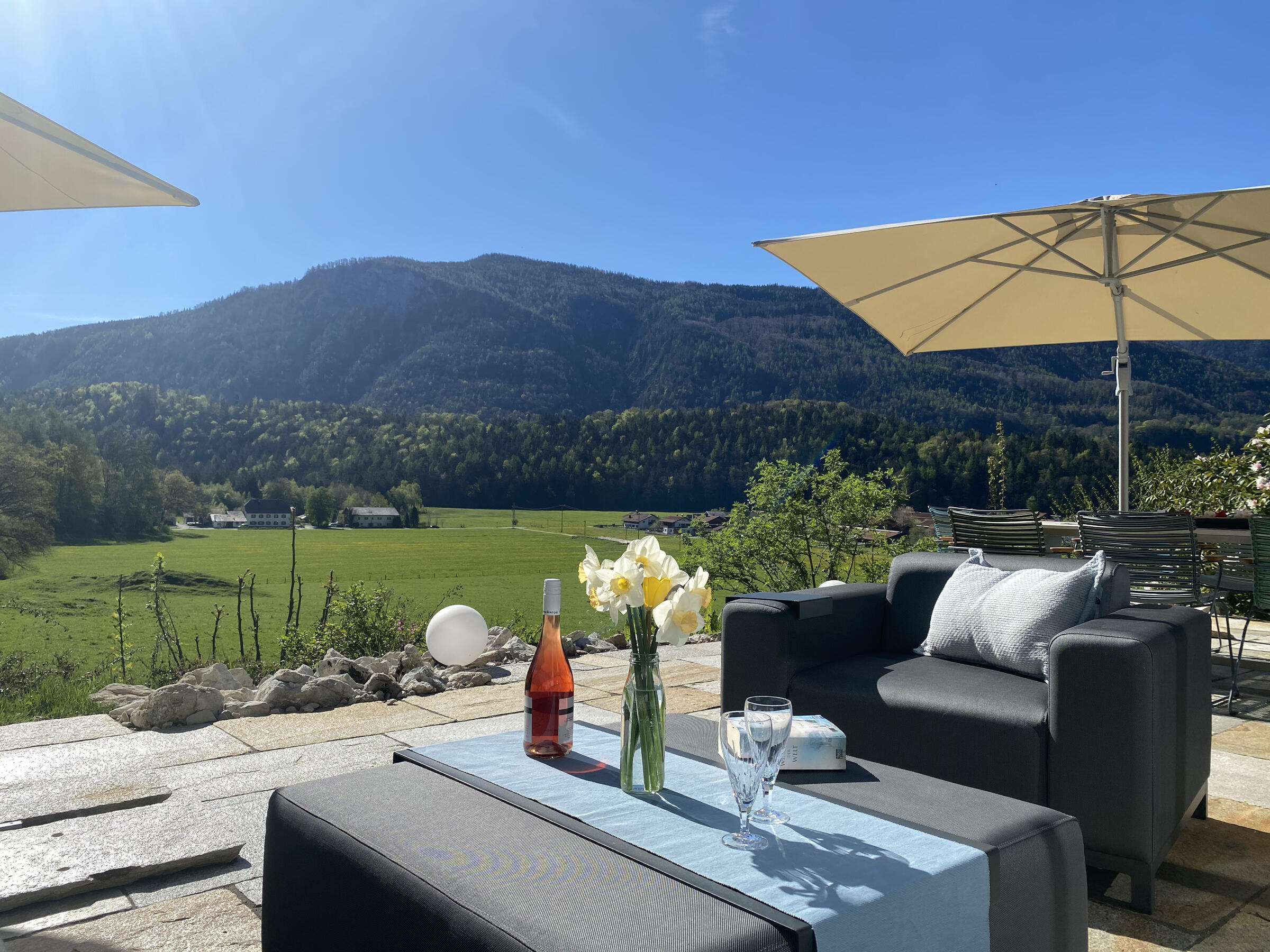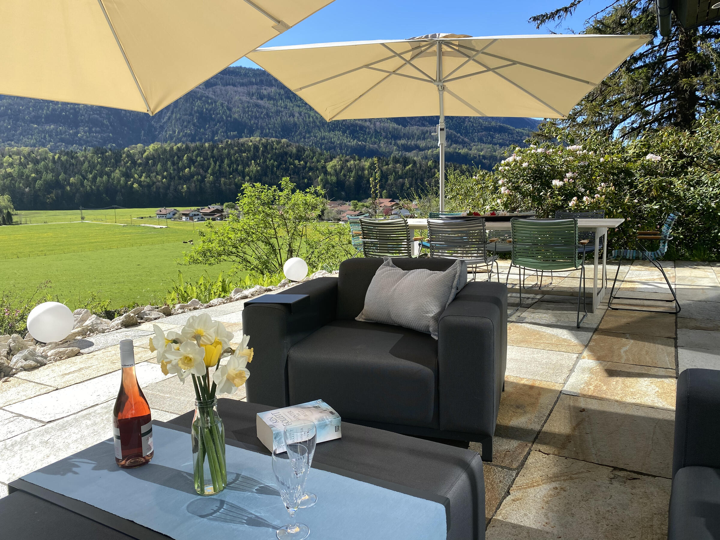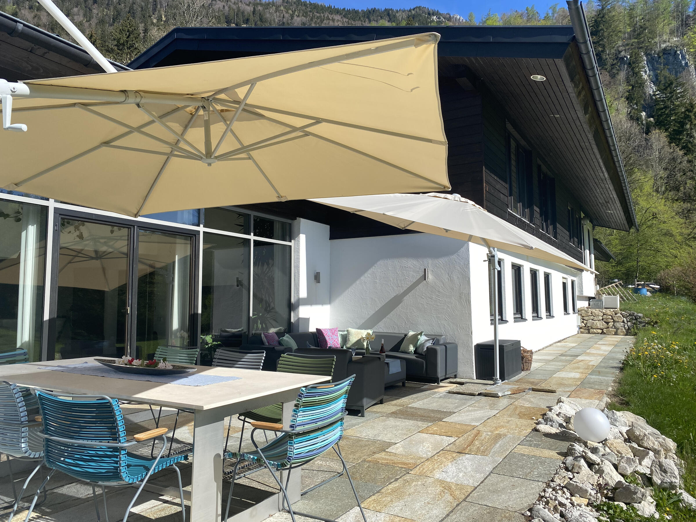Der Garten ist abfallend am Hang und hat im Süden einen wunderbaren Blick auf den wilden Kaiser, das Schlechinger Achental und den Breitenstein. Im Osten und im Westen sind zwei gemütliche Terrassen vorhanden. Im Innenhof ist für drei bis sieben Fahrzeuge Platz.