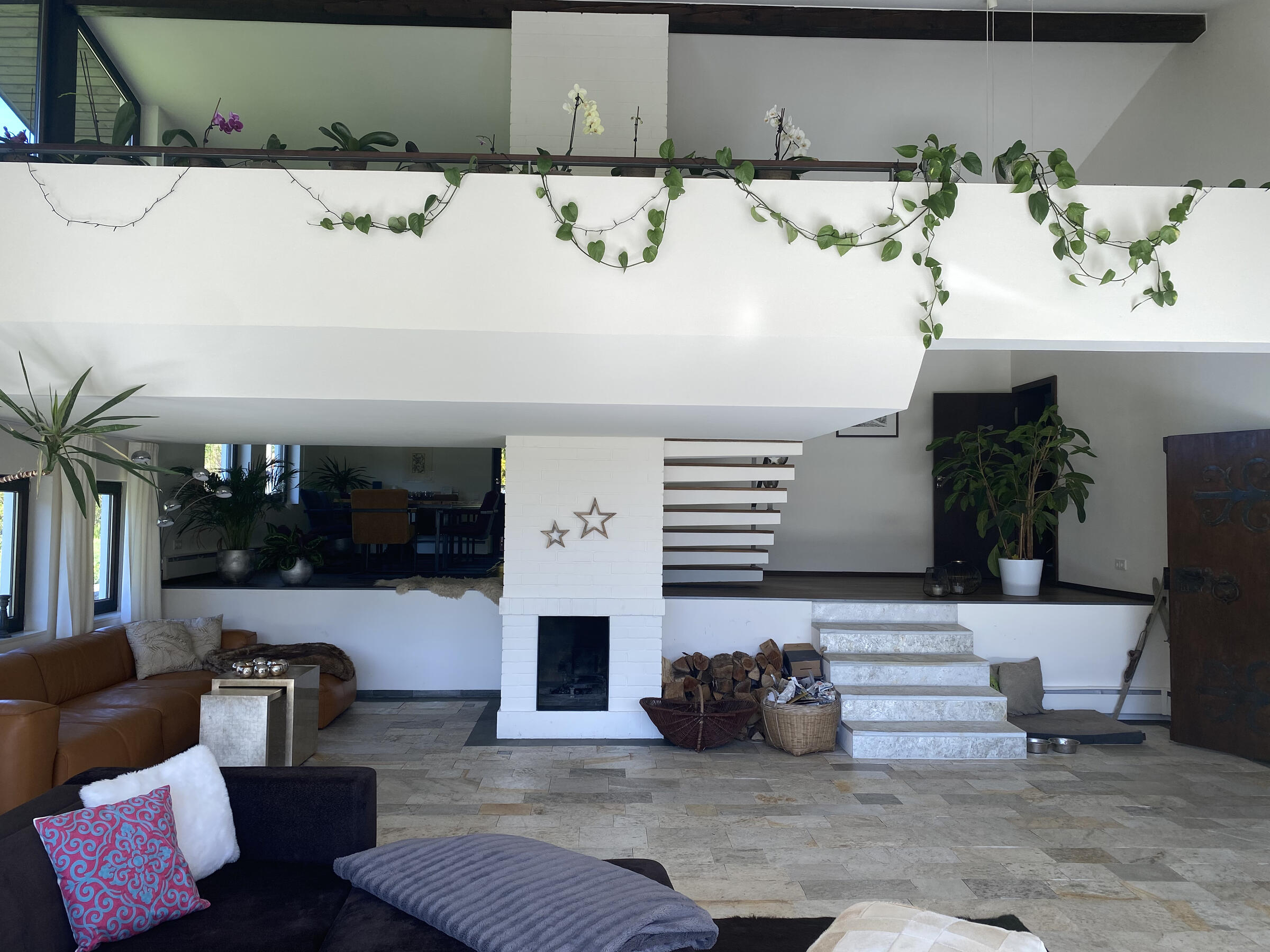 Am Fuße der Hochplatte im idyllischen Chiemgau liegt mein hübsches Hanghaus. Das Haus wurde im Jahr 1976 als Architektenhaus gebaut und im Jahr 2008 komplett und aufwendig renoviert. Der Wohnraum ist sehr offen gestaltet mit hohen Räumen, hochwertigen Möbeln und vielen Fensterflächen. Dadurch ist es im Wohnbereich mit Wohnzimmer, Küche, Esszimmer und Galerie sehr hell und lichtdurchflutet. Von der Galerie aus, kann man im Winter, wenn die Bäume keine Blätter tragen, ebenfalls bis zum wilden Kaiser sehen. Außerdem ist ein offener Kamin vorhanden. Im ersten Obergeschoss befindet sich das Ankleidezimmer mit großem Bad, das Schlafzimmer sowie ein Büro. Im Souterrain befinden sich zwei Gästezimmer sowie ein Gästebad und eine gemütliche Telefonecke.