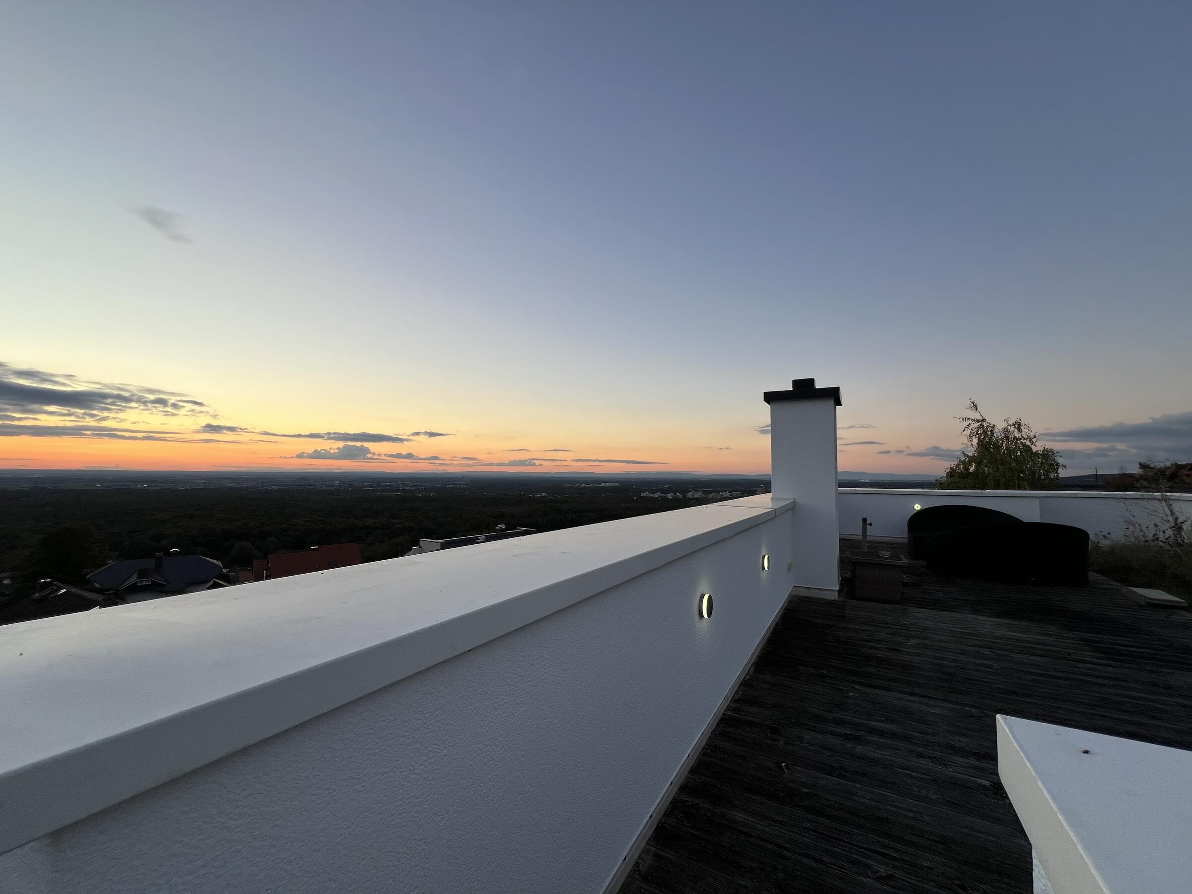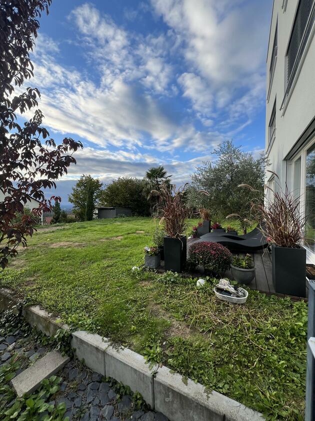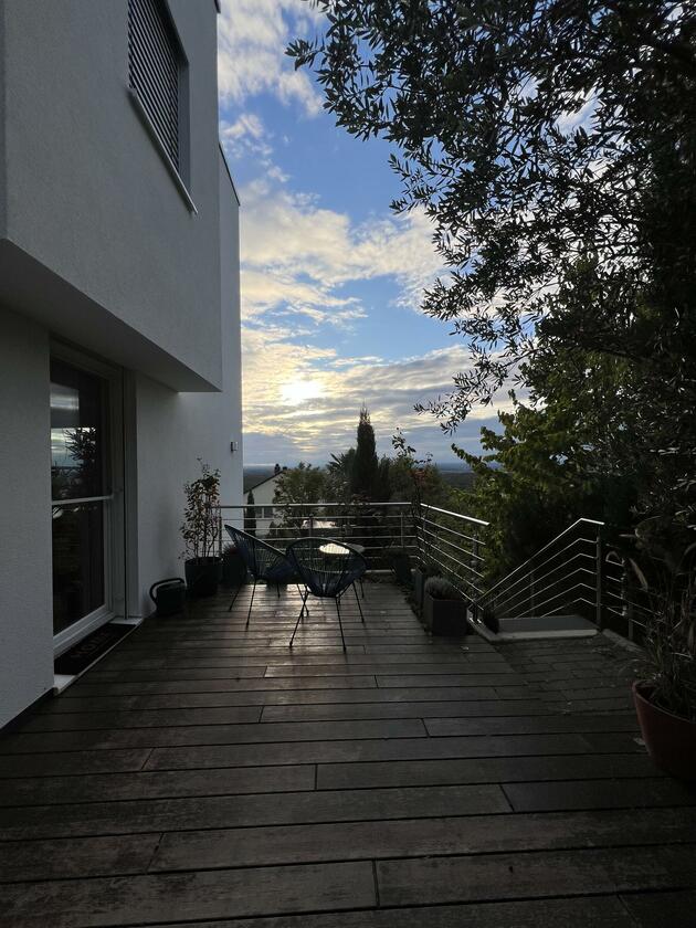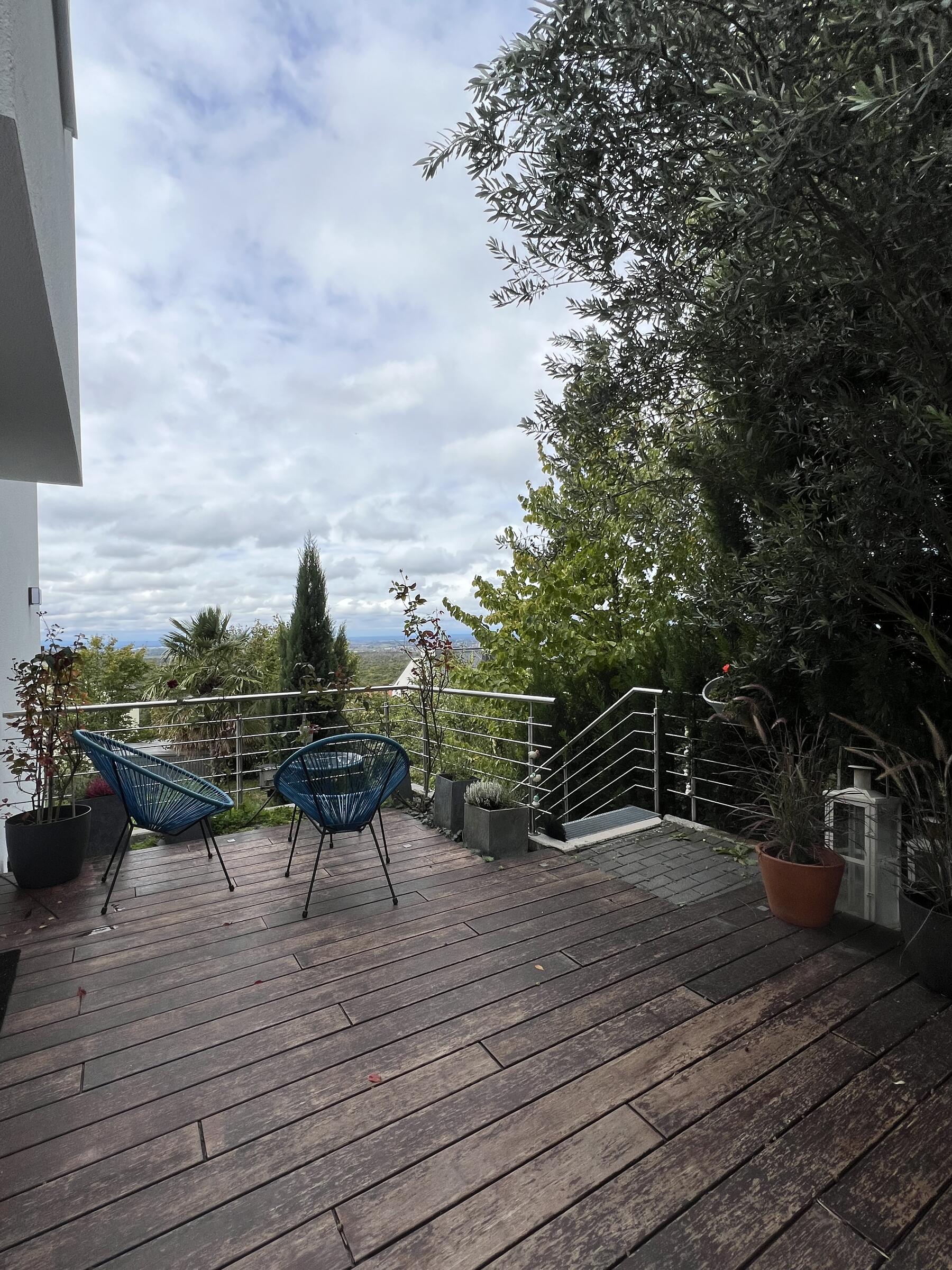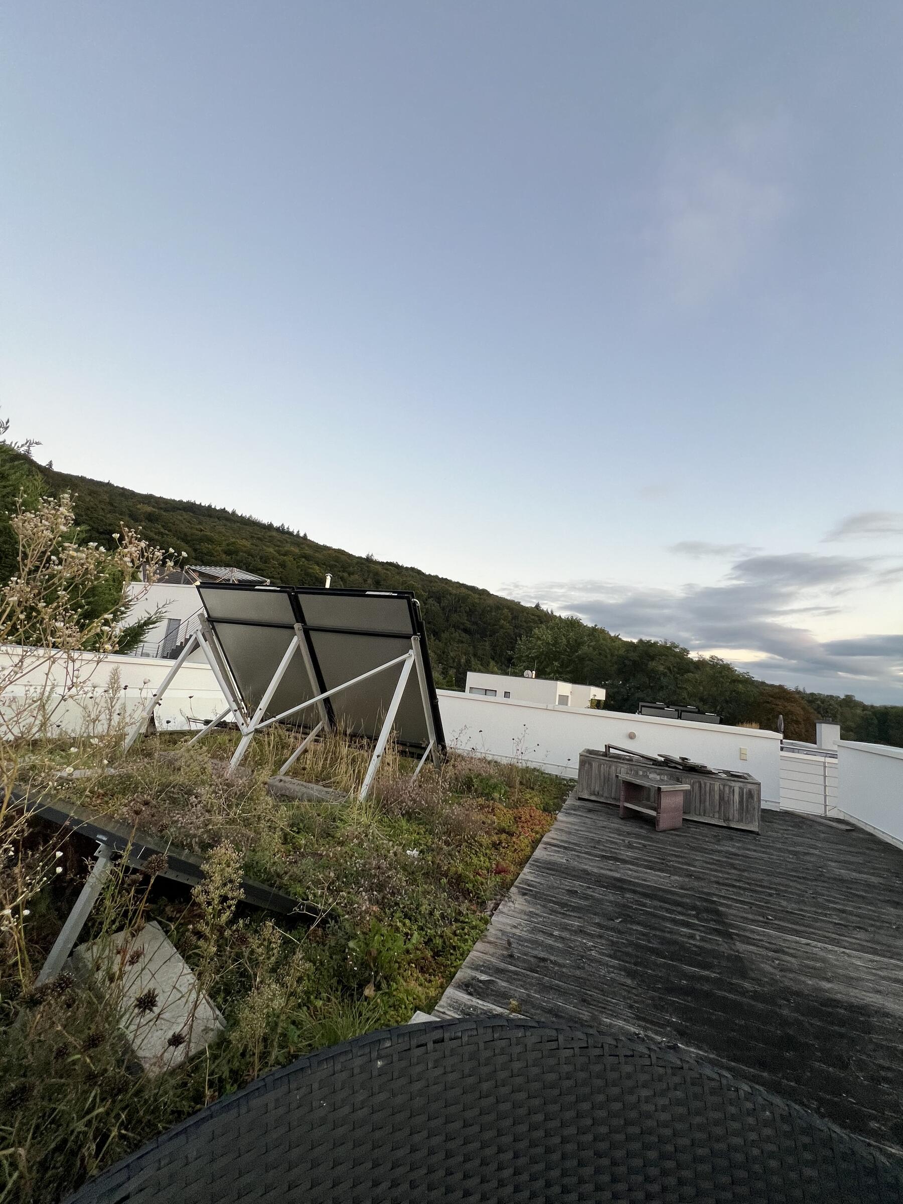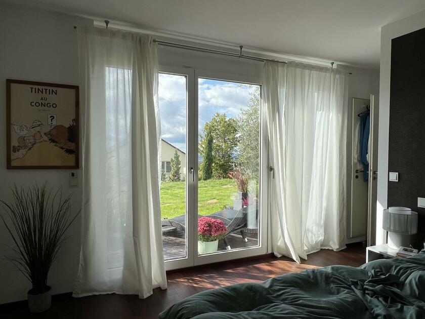 Unser modernes Haus befindet sich in einer ruhigen Wohngegend, eingebettet in eine unberührte Hanglage. Die Räume des Hauses sind offen und hell gestaltet. Durch die bodentiefen Fenster fällt viel Tageslicht in die Räume. Im Erdgeschoss befindet sich ein luxuriöses Schlafzimmer mit direktem Zugang zum Garten, ein Ankleideraum, sowie ein hochwertiges Badezimmer en suite. Im 1. OG befinden sich eine moderne Küche samt Tresen, ein Essbereich und ein einladendes Wohnzimmer.