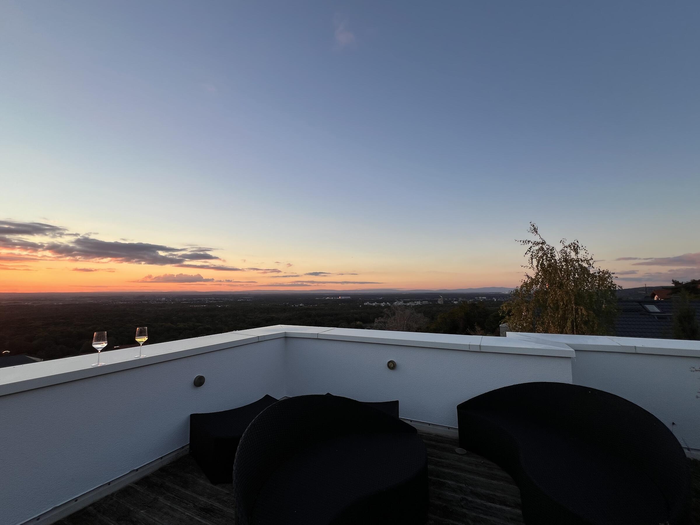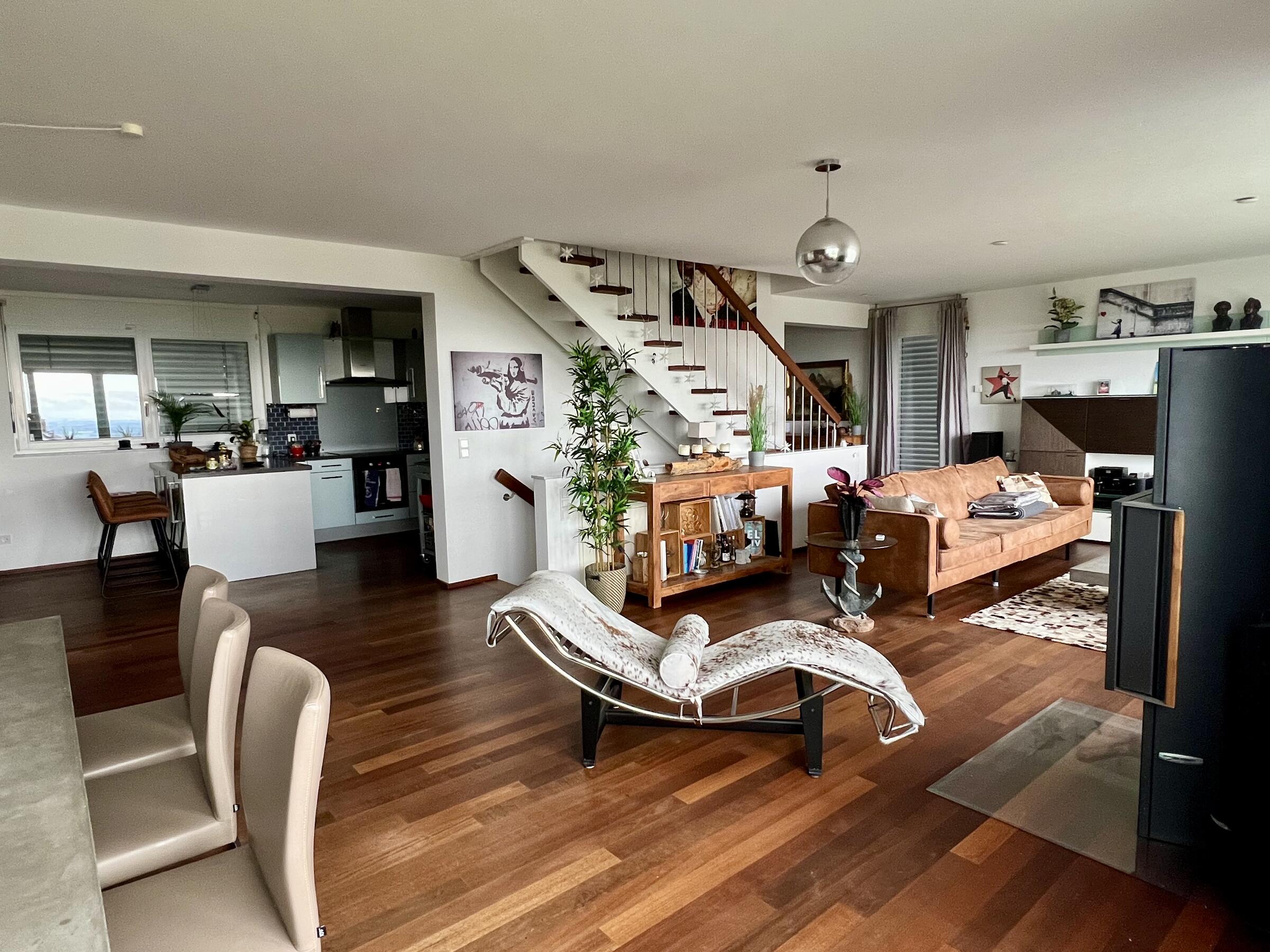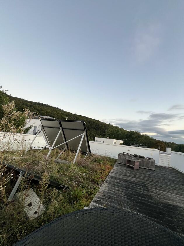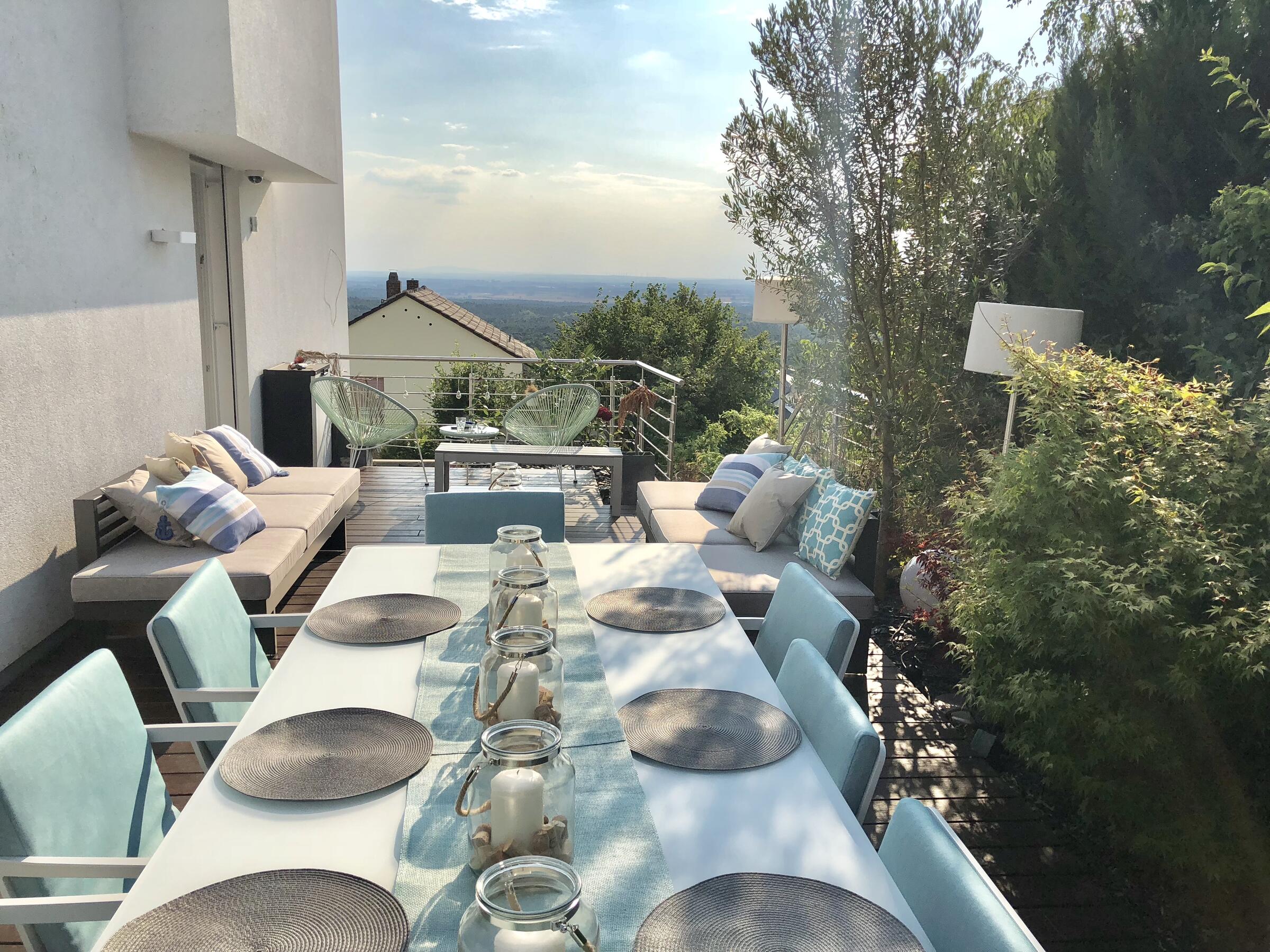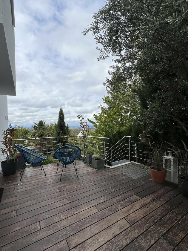 Unser modernes Haus befindet sich in einer ruhigen Wohngegend, eingebettet in eine unberührte Hanglage. Die Räume des Hauses sind offen und hell gestaltet. Durch die bodentiefen Fenster fällt viel Tageslicht in die Räume. Im Erdgeschoss befindet sich ein luxuriöses Schlafzimmer mit direktem Zugang zum Garten, ein Ankleideraum, sowie ein hochwertiges Badezimmer en suite. Im 1. OG befinden sich eine moderne Küche samt Tresen, ein Essbereich und ein einladendes Wohnzimmer.