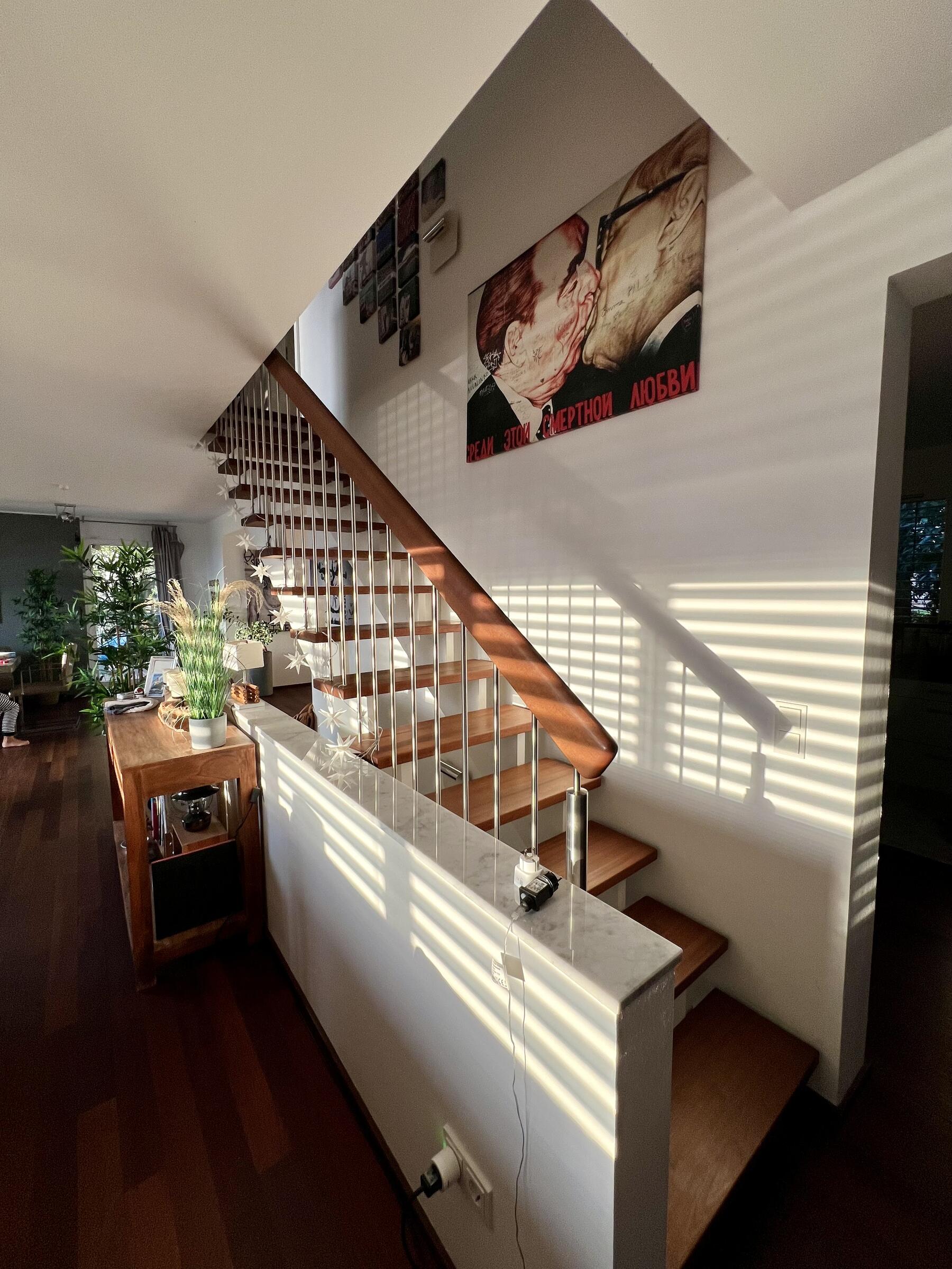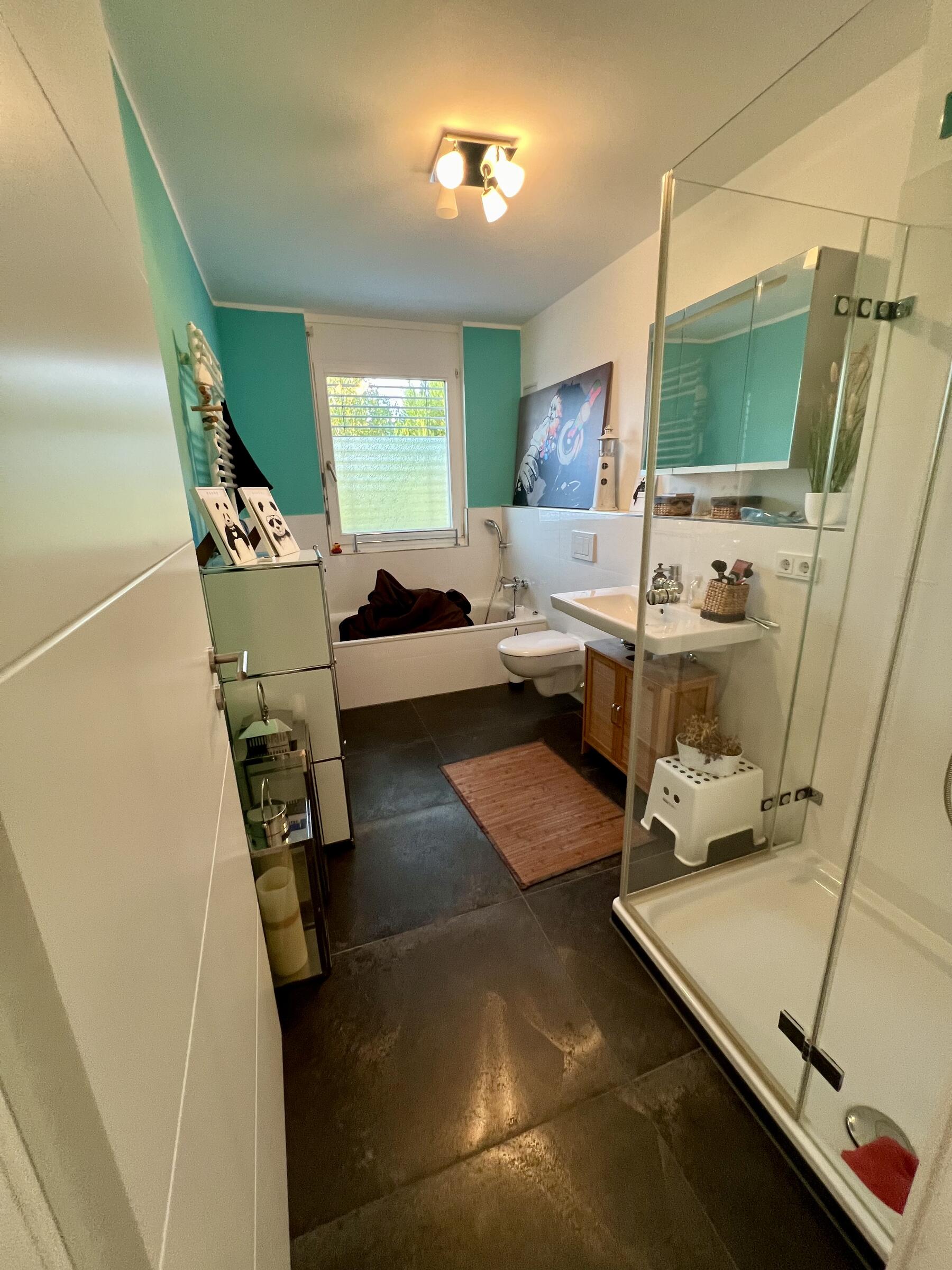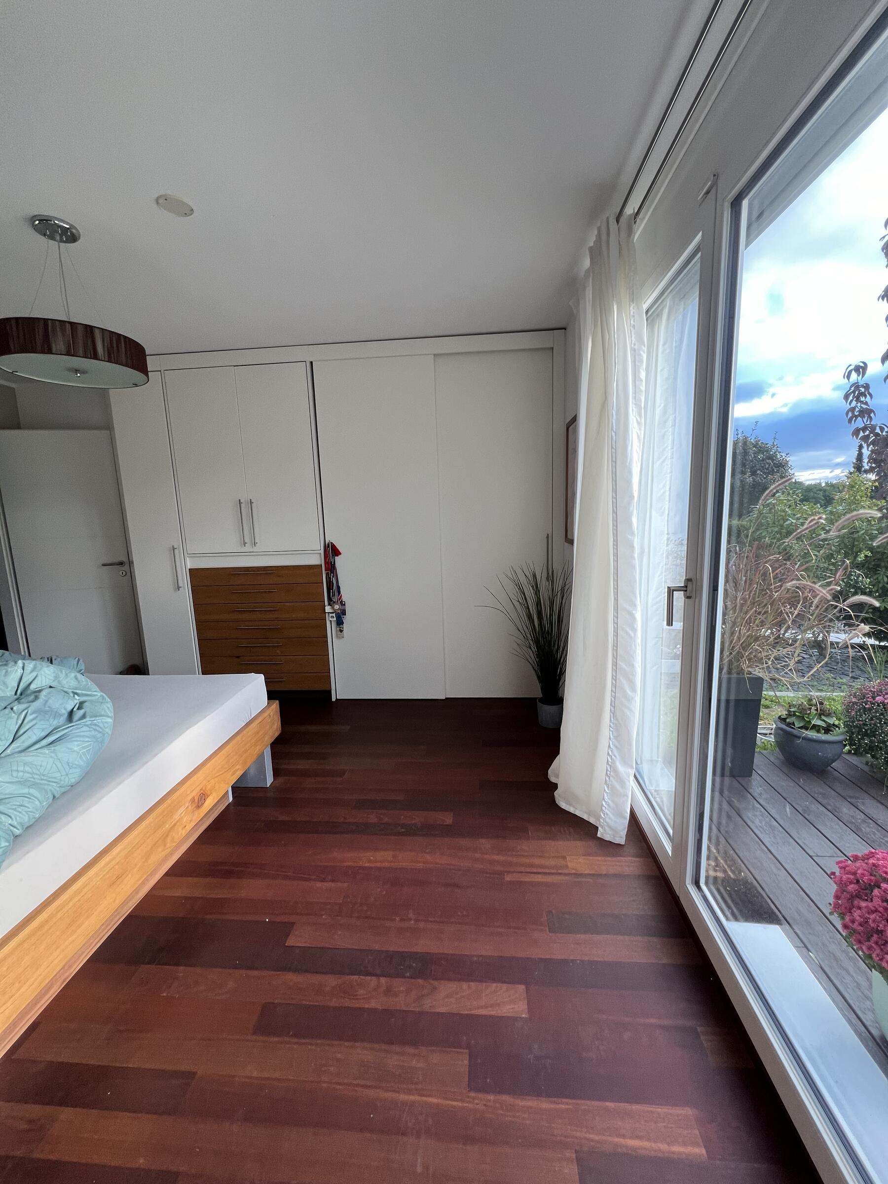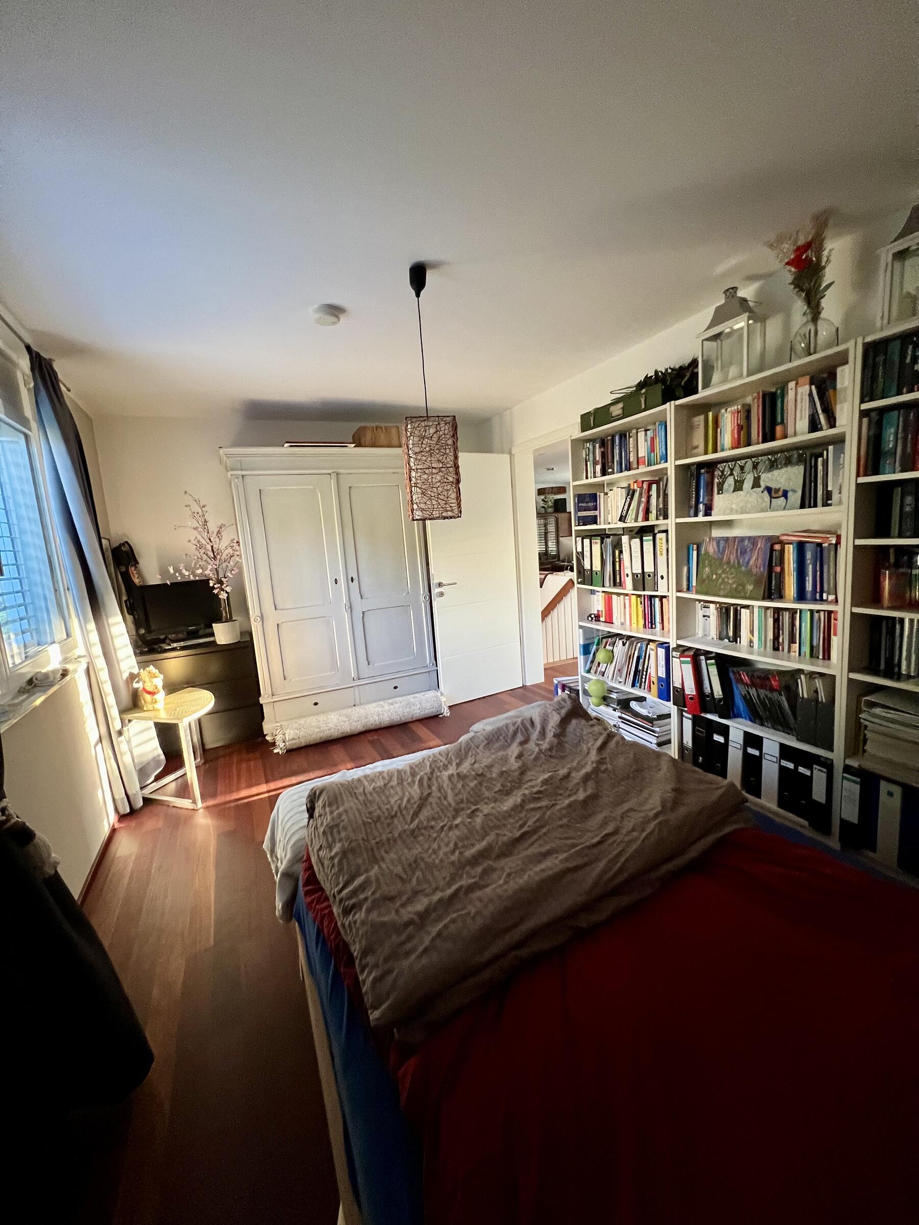 Im 2. OG befinden sich ein Arbeitszimmer, ein Kinderzimmer, ein Gästezimmer sowie ein Sportraum. Im Außenbereich stehen unser Garten, der sowohl vom Schlafzimmer als auch vom Badezimmer direkt zugänglich ist, und die Terrasse, erreichbar vom Wohnzimmer, zur Verfügung. Die zwei Gartenbereiche sind durch eine Außentreppe miteinander verbunden. Nach Absprache dürfen die Räume unseres Hauses umgestaltet werden. Ebenfalls können 3 Pkw-Stellplätze genutzt werden.