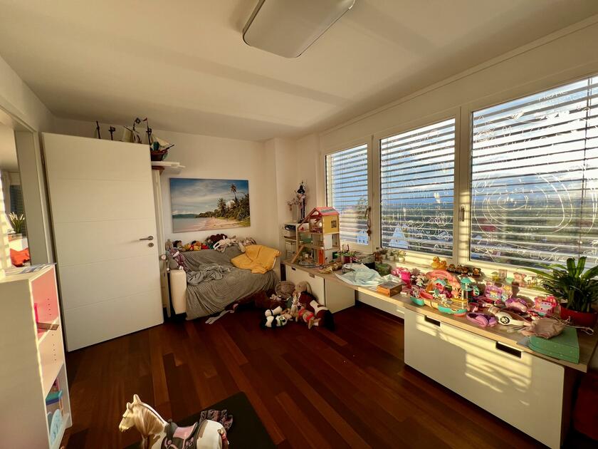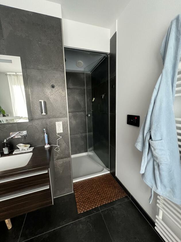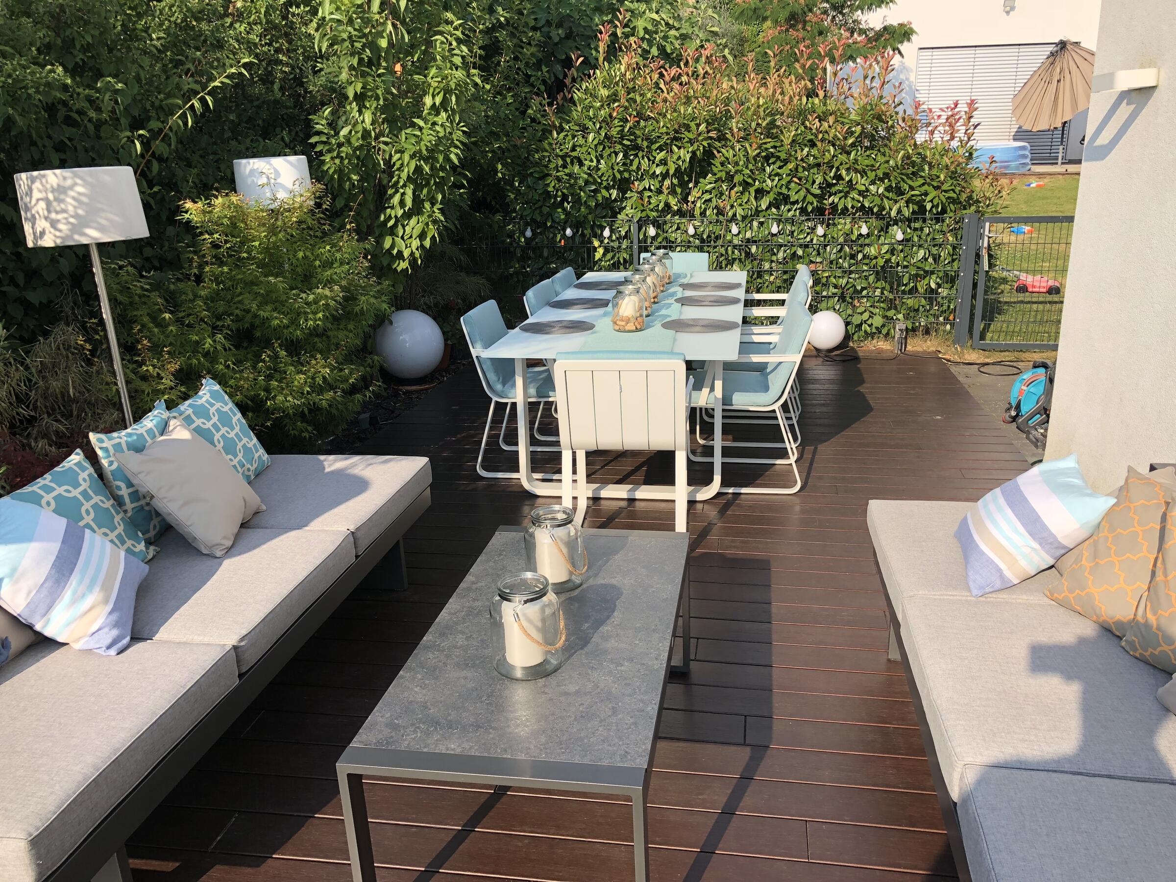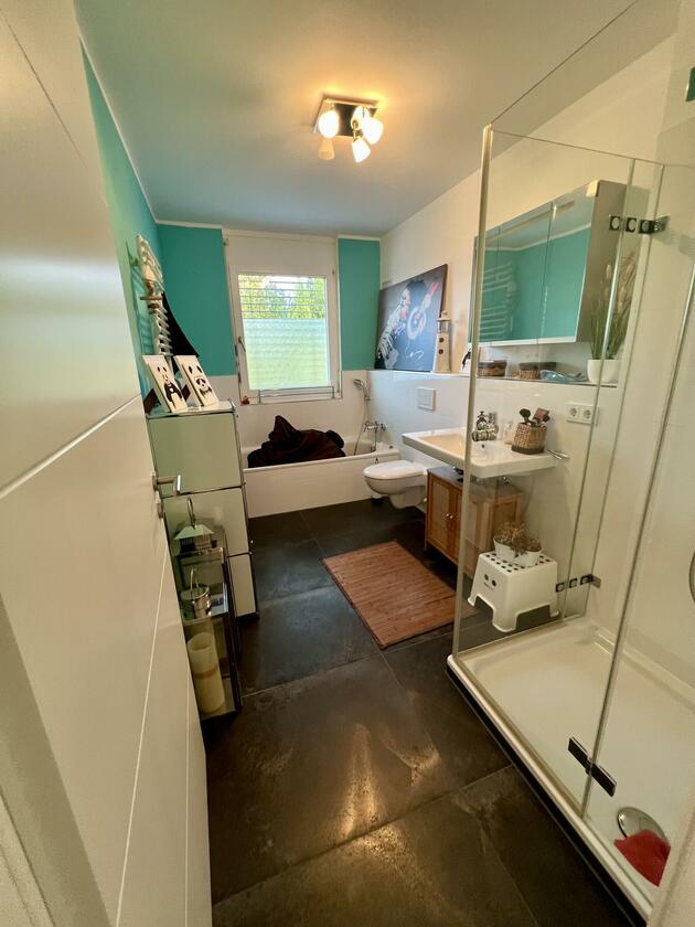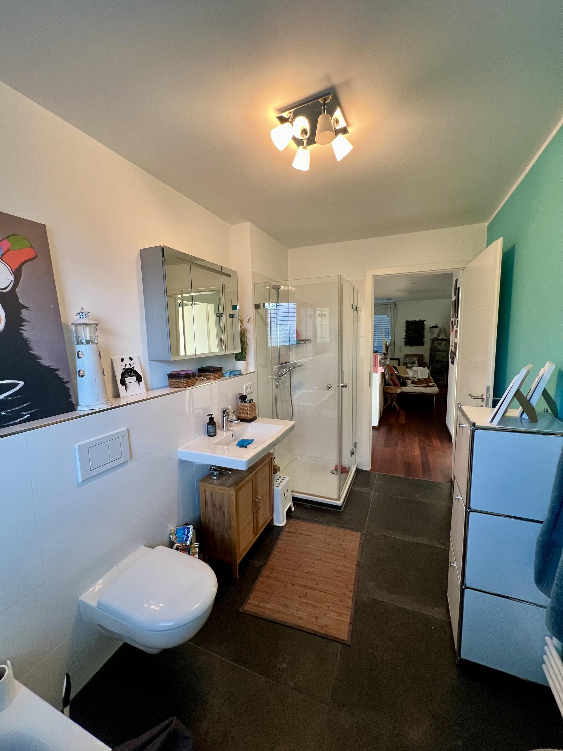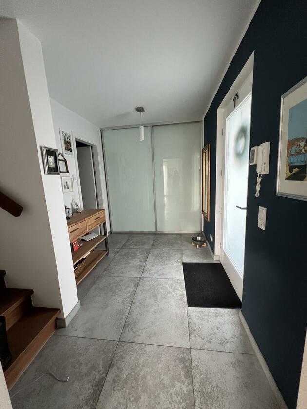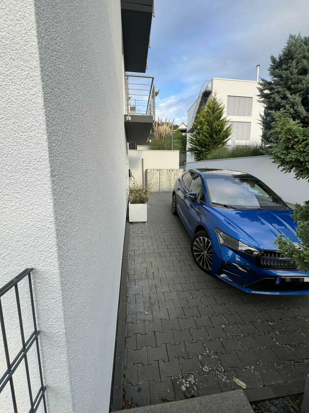Im 2. OG befinden sich ein Arbeitszimmer, ein Kinderzimmer, ein Gästezimmer sowie ein Sportraum. Im Außenbereich stehen unser Garten, der sowohl vom Schlafzimmer als auch vom Badezimmer direkt zugänglich ist, und die Terrasse, erreichbar vom Wohnzimmer, zur Verfügung. Die zwei Gartenbereiche sind durch eine Außentreppe miteinander verbunden. Nach Absprache dürfen die Räume unseres Hauses umgestaltet werden. Ebenfalls können 3 Pkw-Stellplätze genutzt werden.