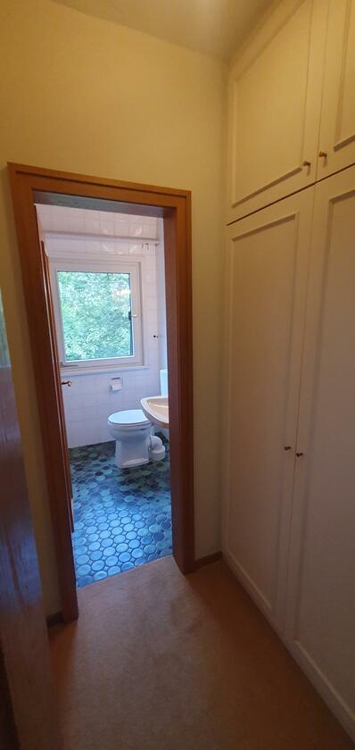 Diese leerstehende Architektenvilla wurde in den 1970er Jahren gebaut und bietet 7 Zimmer, ein Hallenbad, eine Einliegerwohnung und diverse Nebenräume. Die Innenausstattung der Räume ist überwiegend im Original erhalten. Der offene Kamin im Wohnraum ist in Kupfer eingefasst und die dortigen Einbauschränke in Malertechnik petrolfarben gestrichen. Die Fenster im Wohn- und Essbereich im Erdgeschoss können mit Außenjalousien abgedunkelt werden. Im Obergeschoss befinden sich 4 Schlafräume, 3 Bäder, sowie ein WC. Der Innenpool ist derzeit entleert, kann jedoch nach Absprache befüllt werden. Die separat zugängliche 3-Zimmer Einliegerwohnung kann gut als Crew-Aufenthalt genutzt werden, Küche und Badezimmer sind dort ebenfalls vorhanden. Das eingewachsenes Grundstück bietet alten Baumbestand und einen großen parkartigen Garten. Die große Terrasse mit Granitboden öffnet sich zum Garten. Das Gebäude ist nach Süden ausgerichtet. Die Zufahrt zum Gebäude erfolgt über eine ansprechende Auffahrt. Für größere Fahrzeuge bzw. Anlieferungen steht eine rückwärtige Zufahrt ohne Steigung zur Verfügung.