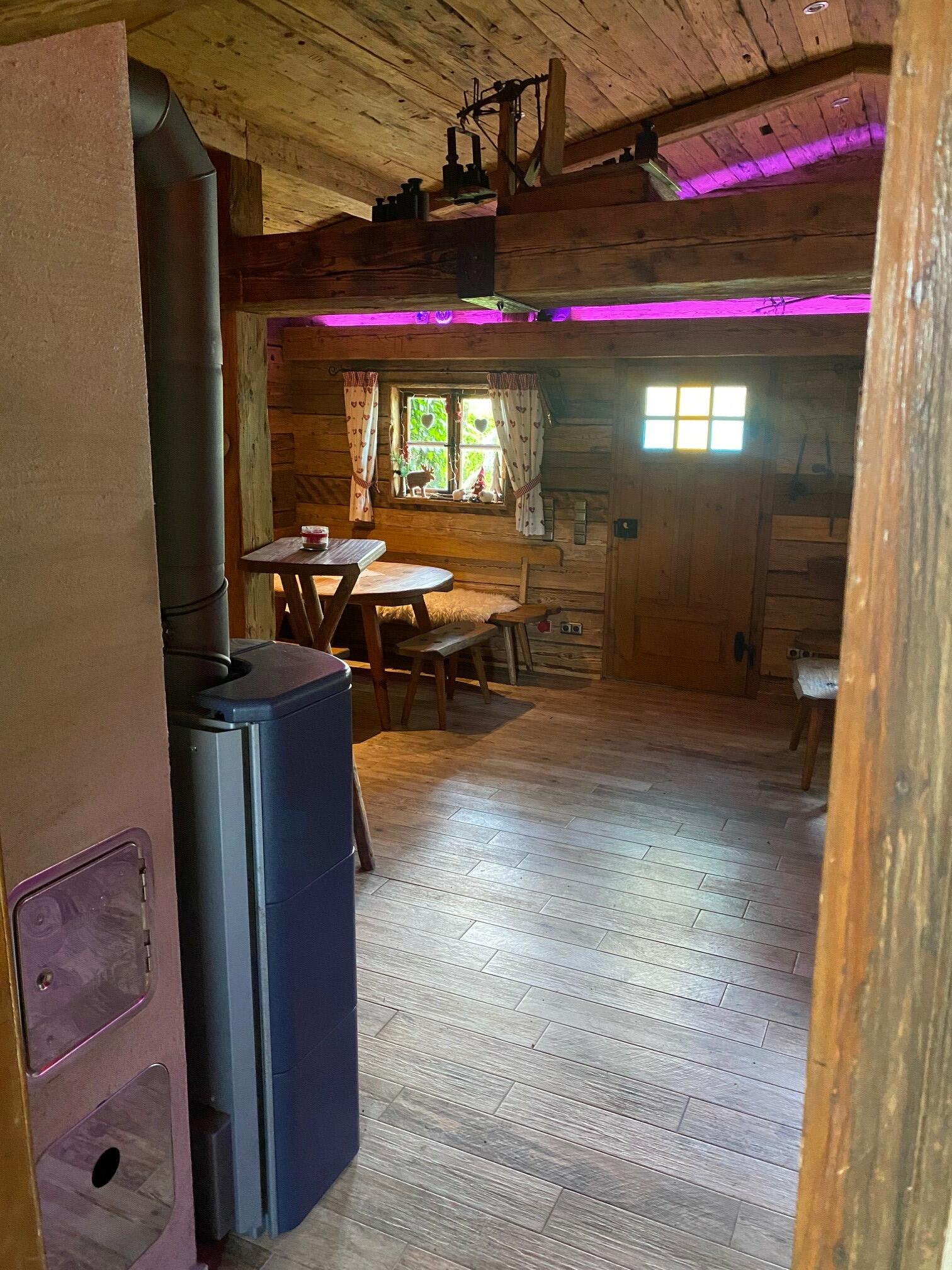 Die sehr charmante Almhütte wurde mit original Altholz aus Tirol liebevoll bis ins Detail aufgebaut. Die größere Stube bietet eine Küche, eine kleine Bar mit Tresen, 3 Tische und einen Holzofen. Der Nebenraum hat einen Essbereich und eine alte Werkbank. Die Hütte hat auch einen Lagerraum. Vor der Hütte gibt es eine Terrasse mit einem überdachten Sitzbereich und großem wunderbar eingewachsenem Garten. In der Umgebung befinden sich Obstbäume und ein großer Hochbeetbereich. Neben der Hütte ist auch noch ein Grillbereich, der mit alten Ziegeln eingefasst ist. Im Wohnhaus nebenan gibt es nutzbare Toiletten. Die Hütte selbst kann mit dem Ofen beheizt werden und hat Warm- und Kaltwasser und LAN-Anschluss.