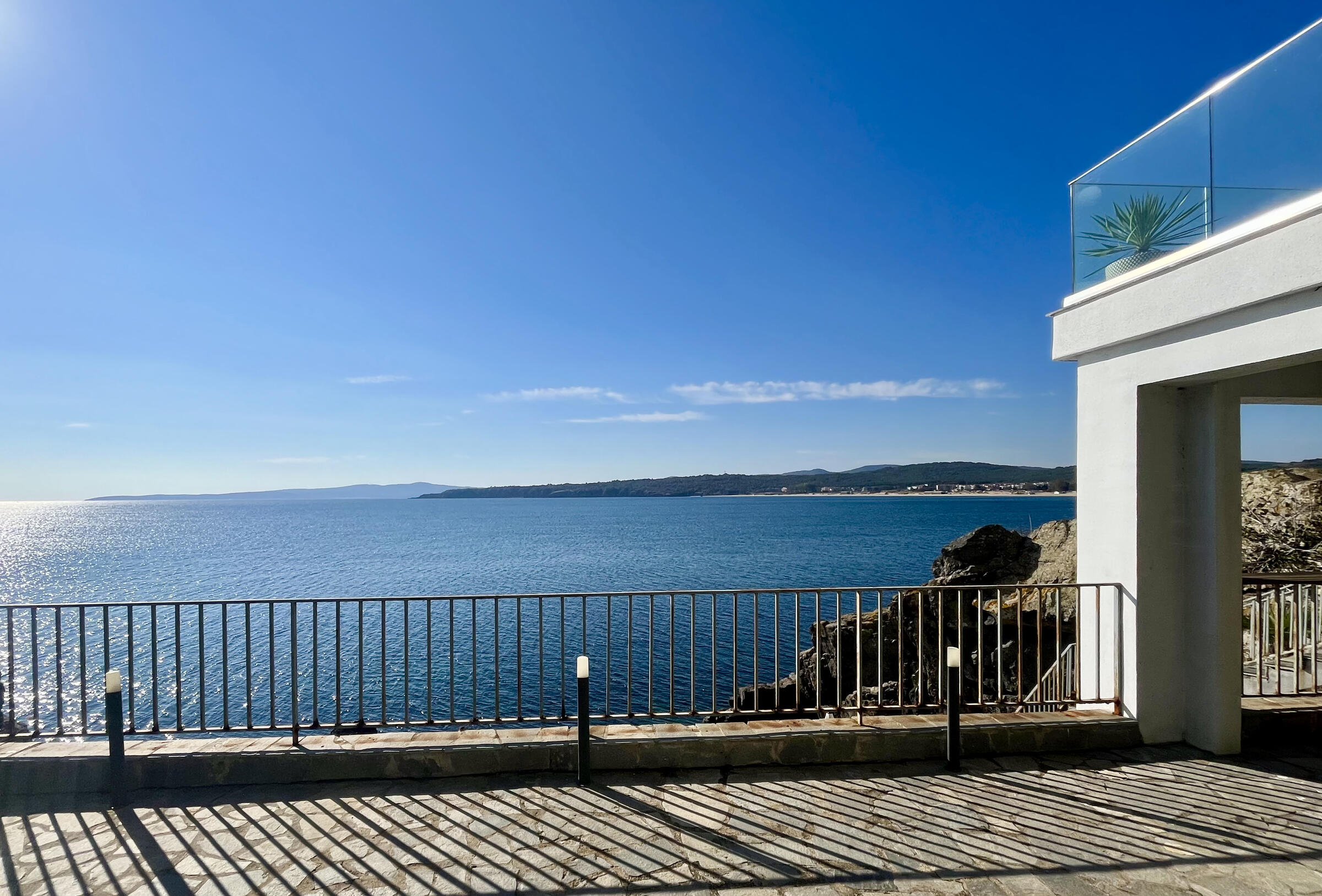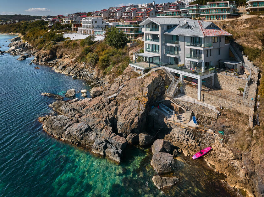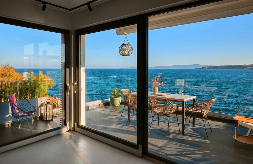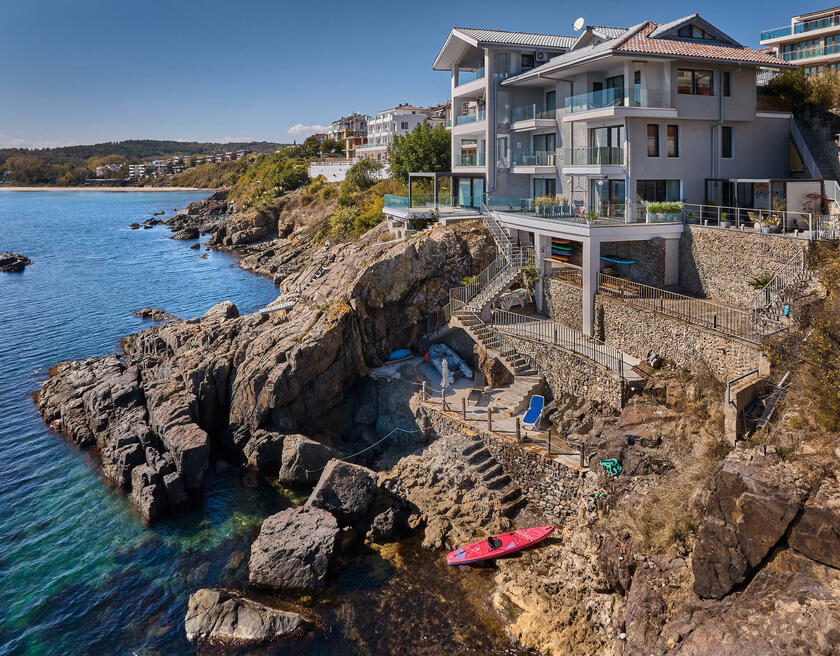 Die ruhig gelegene Ferienwohnung am Schwarzen Meer bietet einen hellen und offen gestalteten Wohnbereich, eine weitläufige Terrasse mit flexibel zu öffnender Pergola sowie einen großen Balkon. Durch die exakte Südausrichtung lassen sich von November bis April sowohl Sonnenaufgang als auch Sonnenuntergang direkt über dem Meer erleben. Die Innenausstattung ist eklektisch-kolonial geprägt und vereint handgefertigte Elemente mit hochwertigen Naturmaterialien. Die maßgefertigte Küche aus poliertem Beton, Stein und Holz bildet das Herzstück der Wohnung, während der beheizbare Betonboden für ein angenehmes Raumklima sorgt. Die teilweise bodentiefen Fenster können mit Vorhängen abgedunkelt werden. Die Wohnung darf nach Absprache umgestaltet werden. Neben der Wohnung können auch sämtliche Außenbereiche auf dem Felsen, einschließlich Buchten, Leitern und felsiger Plateaus, genutzt werden. Ebenfalls können Boote und Yachten direkt vor dem Haus geankert werden. Kostenlose Parkplätze befinden sich auf Straßenniveau. Produktionsausrüstung kann bequem direkt auf dem privaten Hofparkplatz angeliefert werden.