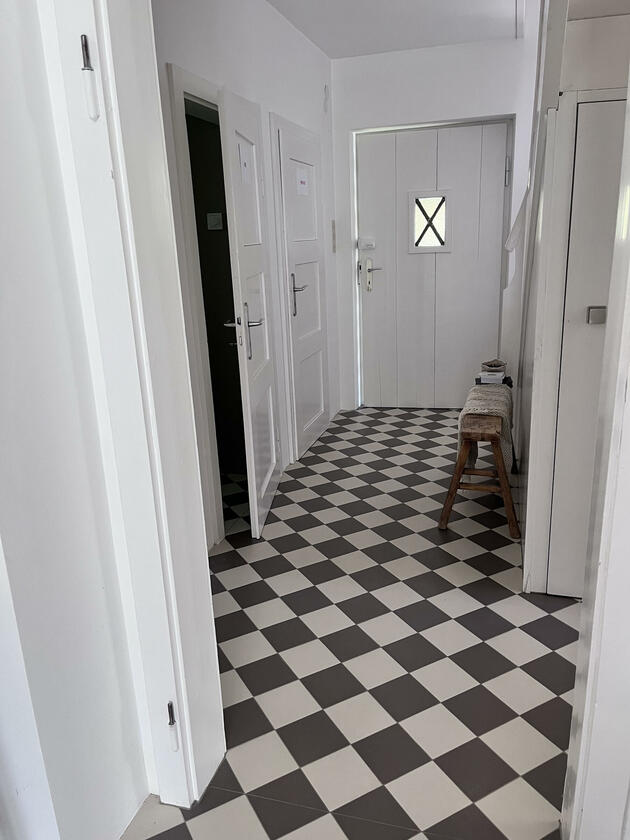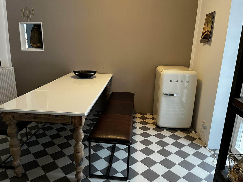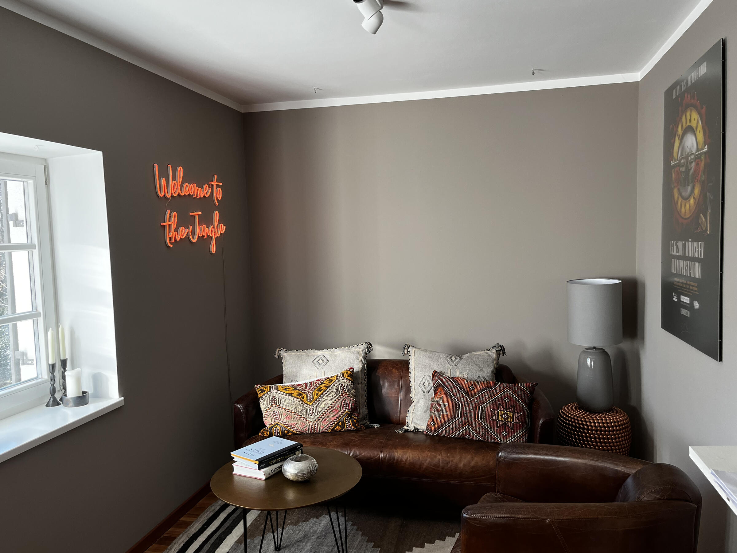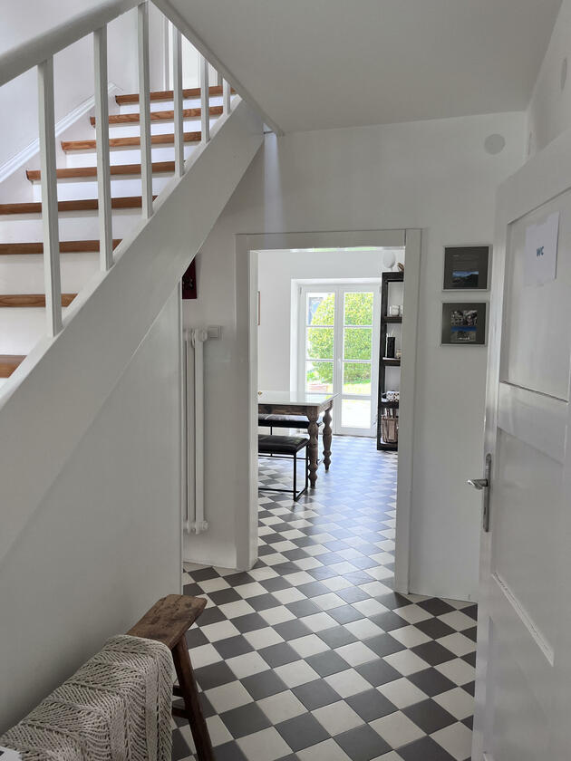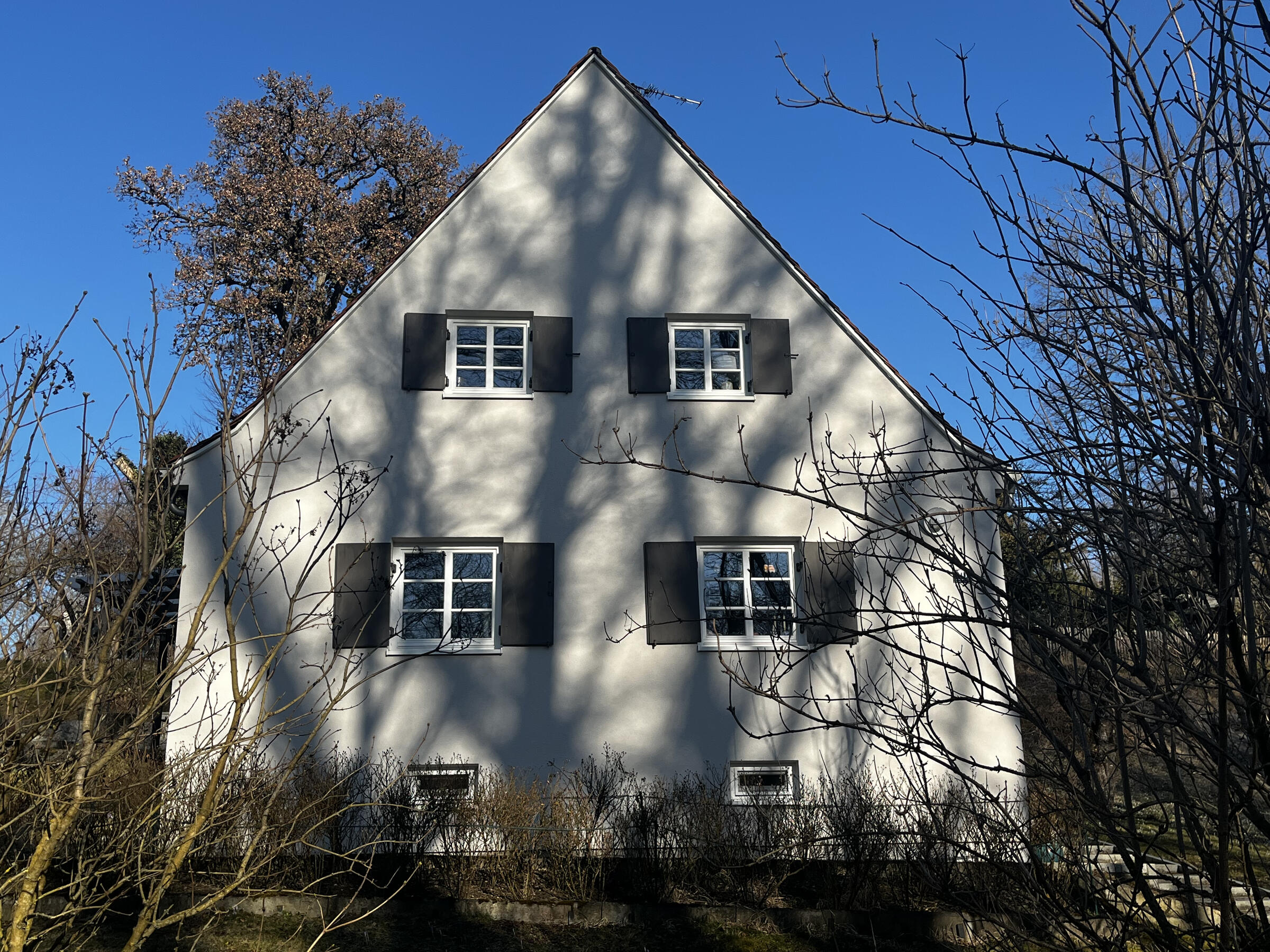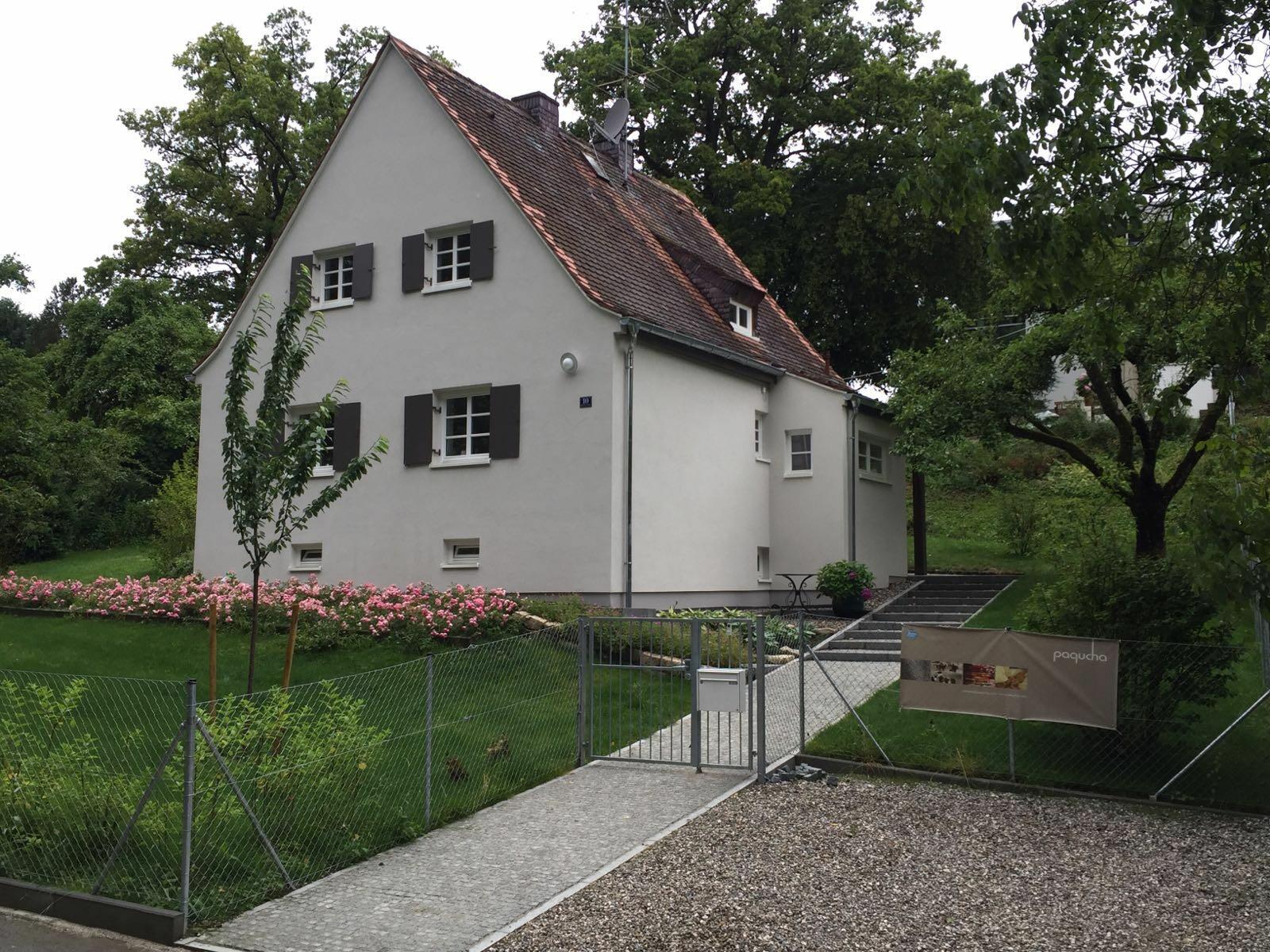 Es handelt sich um ein Einfamilienhaus aus den 1930er Jahren. Umgeben ist es von einem quadratischen, mit Terrassen angeordnetem Garten, der wunderbar eingewachsen ist. Wir haben das Haus eigenhändig mit viel Aufwand renoviert und es mit viel Herzblut individuell eingerichtet und ausgestattet. Das Haus ist sehr modern und minimalistisch gestaltet und eingerichtet. Die Räume sind zwar nicht sehr groß, jedoch wunderbar geschnitten, sodass sie sehr flexibel eingerichtet und verwendet werden können. Die Einrichtungsgegenstände sind sehr hochwertig und an den Wänden hängt moderne Kunst, Metallkunst oder hochwertige Drucke. Die Küche, das Bad und WC sind top eingerichtet und ausgestattet. In Flur, Küche, Bad, WC und Essbereich wurden, dem Altbau angemessen, Fliesen in Schachbrettmuster verlegt. Im Wohnbereich konnte das alte Parkett erhalten werden. Im oberen Stockwerk wurde wertiges Laminat verlegt. Es hat eine sehr besondere und gemütliche Atmosphäre, sodaß sich alle Menschen, die es betreten, sofort wohl fühlen. Wir nutzten das Haus temporär als Pop-up-Store oder für geschäftliche Meetings. Auch wird es als Gästehaus für private Freunde genutzt. Es ist daher wunderbar flexibel einsetzbar, sowohl zeitlich, als auch von der Nutzung her. Drehstrom läßt sich bei unserem Wohnhaus einstecken. Außerdem kann unser 1.600 m² großes Grundstück als Parkfläche mitbenutzt werden.