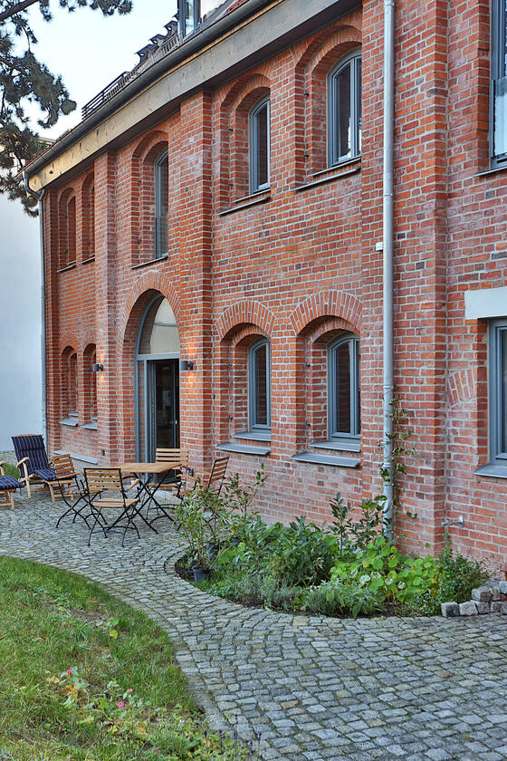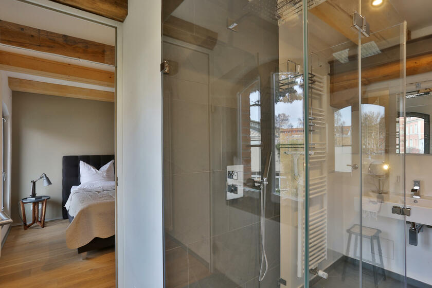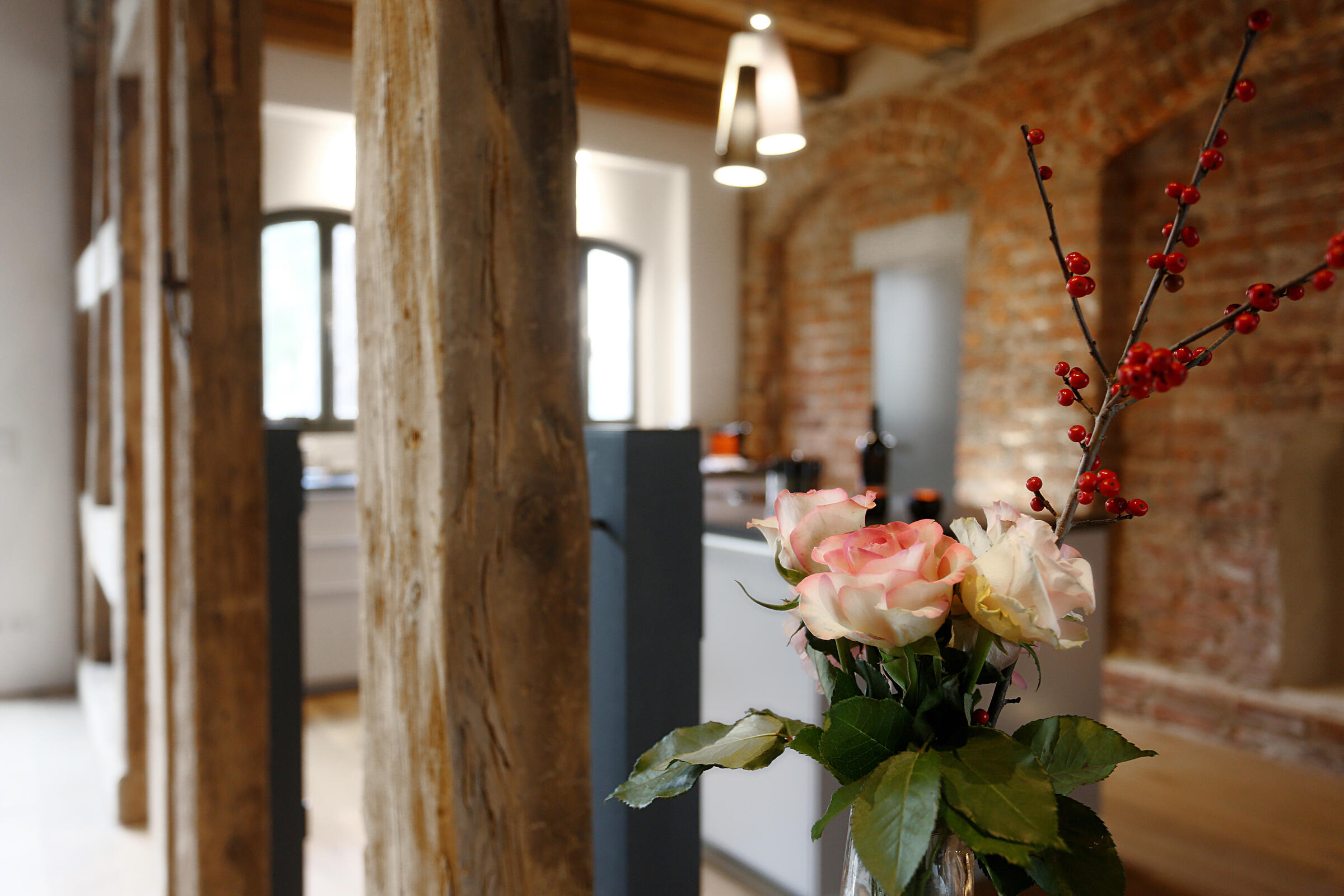 Der Grundcharakter des Gebäudes - ein ehemaliger Getreidespeicher - ist auch nach der Sanierung noch gut erlebbar. Altes Mauerwerk, originale Deckenbalken und alte Fachwerkwände geben den Räumen besonderen Charme. Die Wohnung, die eher einem Haus gleicht, eignet sich für alle, die es großzügig, modern und loftig mögen und das Besondere schätzen.