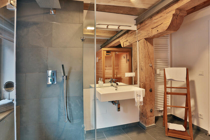Im Obergeschoss befinden sich drei große Schlafzimmer, die alle mit komfortablen Boxspring-Doppelbetten ausgestattet sind. An eines der Schlafzimmer schließt sich ein Bad mit Regendusche und Badewanne an (en-suite Bad), ein weiteres Bad, ebenfalls mit Regendusche, ist vom Flur aus zu erreichen. Hier befindet sich auch eine Sauna für zwei Personen.