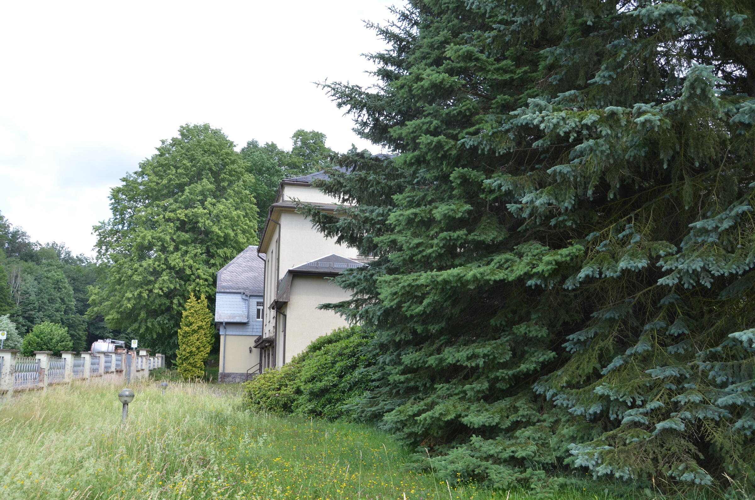 Das Außengelände im hinteren Bereich hat ein Brunnenhaus, eine Grünfläche und eine Schotterfläche, auf der noch einige alte Transformatoren stehen. Zudem befindet sich eine Grünfläche inklusive einem kleinen Wald seitlich des Grundstückes. Der Innenhof ist durch große Fichten und Rhododendron sichtgeschützt. In der Mitten befindet sich ein einfacher Springbrunnen. Das Objekt und dessen Mauer ist ein technisches Denkmal und steht somit unter Denkmalschutz.