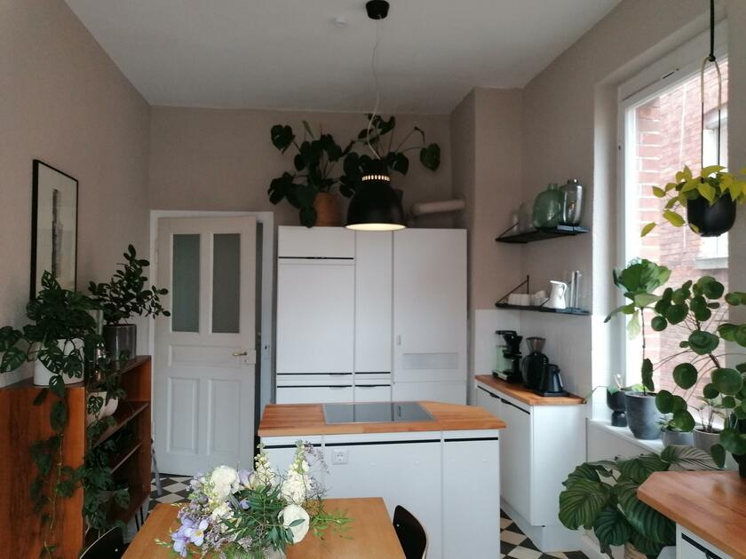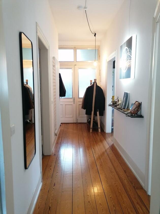 Die Altbauwohnung ist typisch in ihrem Grundriss und in ihrer Raumhöhe - alle Räume sind mit Türen verbunden und gehen vom Flur aus ab. Jeder Raum hat einen anderen Parkettboden, der, typisch für einen Altbau, knarzt. Die Wohnung verfügt über 3 Zimmer (Schlafzimmer, Wohnzimmer, Arbeitszimmer) sowie ein großes Bad, ein Gäste-WC und eine Wohnküche mit angeschlossenem Balkon. Untypisch für einen Altbau ist, dass das Bad neu saniert und sehr groß ist. Es verfügt über eine bodentiefe Glasdusche mit Regendusche sowie separater Badewanne, Doppelwaschtisch und Toilette. Die große Küche verfügt über eine freistehende Kochinsel mit Blick auf den anschließenden Balkon. Die Wohnung ist komplett möbliert und geschmackvoll eingerichtet.