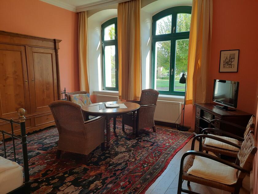 Das Gutshaus wurde im 19. Jahrhundert im Biedermeierstil erbaut und 1998 restauriert und zu neuem Leben erweckt. Im Gutshaus, das idyllisch am Ende einer kopfsteingepflasterten Allee liegt, befinden sich eine historische Dorfschänke, 3 individuell gestaltete Zimmer, die für Produktionen zur Verfügung stehen, ein Kaminsaal mit Bechstein Flügel, ein gemütlicher Salon mit Blick in den beeindruckenden Gutshauspark, 2 Gasträume und eine kleine Bibliothek. Unsere rustikale Zirbenholz-Sauna liegt versteckt am Ende eines kleinen Birkenwaldes. Auf dem Gut gibt es Schafe, Enten und 1 Katze. Unsere Möbel und Innenausstattung bestehen vollständig aus restaurierten Antiquitäten (Biedermeier, teilweise Gründerzeit). Im Gutshaus befindet sich eine Ferienwohnung, die für Teamaufenthalte und Lagerung von Equipment genutzt werden kann. Es stehen ca. 15 Pkw-Parkplätze sowie eine große Stellfläche (ca. 6 x 4 m) zur Verfügung. Eine Wäschekammer ist nutzbar. Starkstromanschluss ist vorhanden.