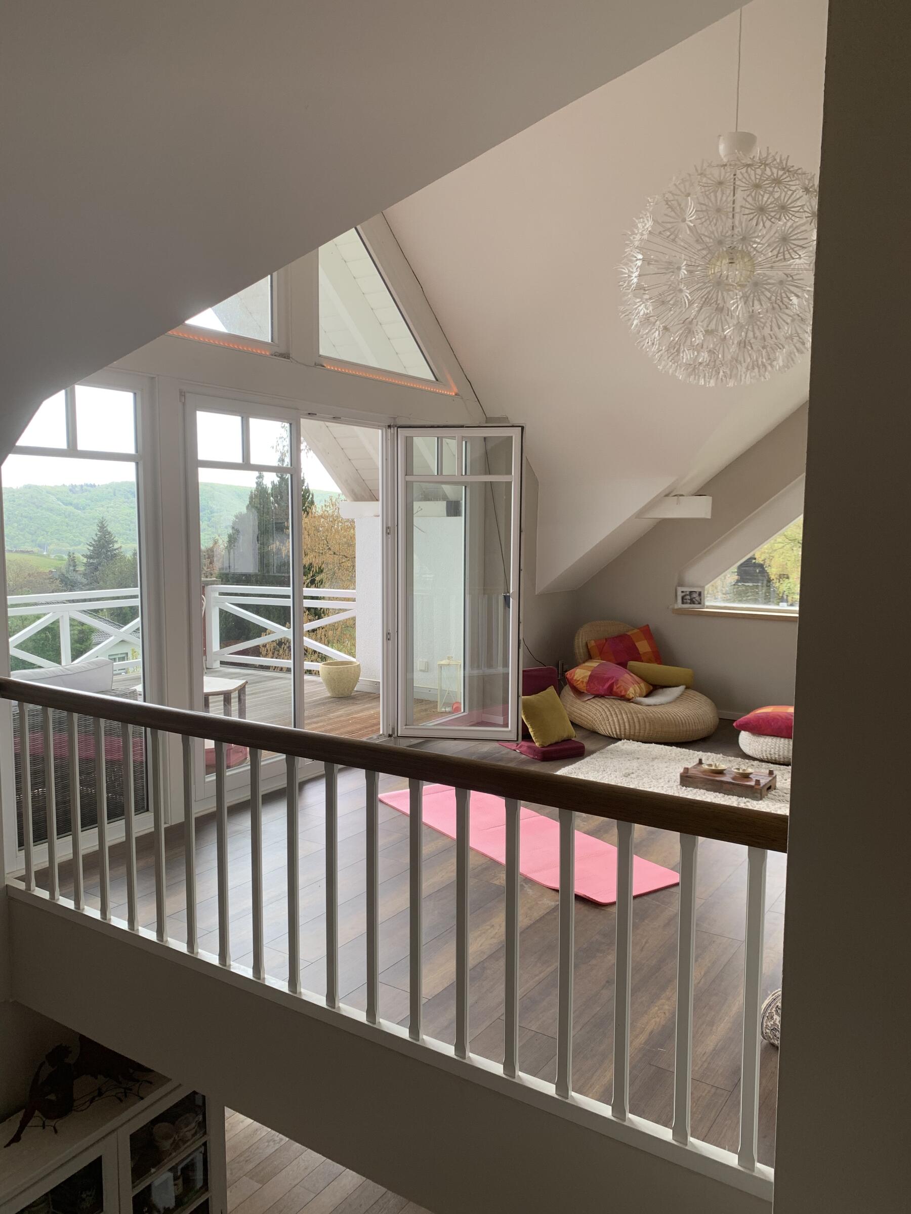 Über eine offene Holztreppe gelangt man in den oberen Bereich des Hauses. Hier befinden sich zwei Schlafräume und ein großzügiges Badezimmer mit freistehender Badewanne. Die lichtdurchflutete Galerie schließt sich an und macht den Blick auf die Dachterrasse frei, von wo man einen wunderschönen Blick in die Weinberge und angrenzende Wälder erhält.