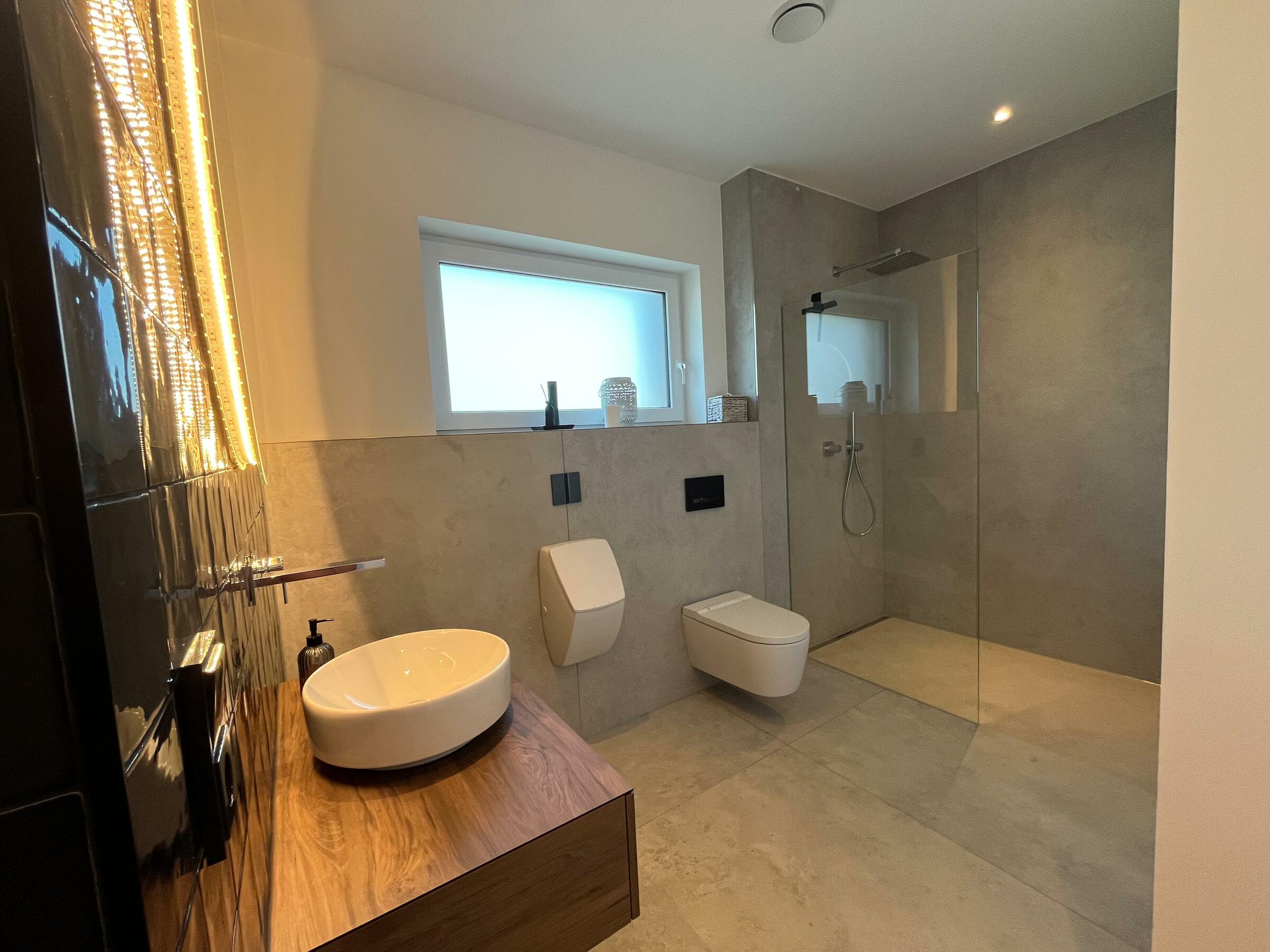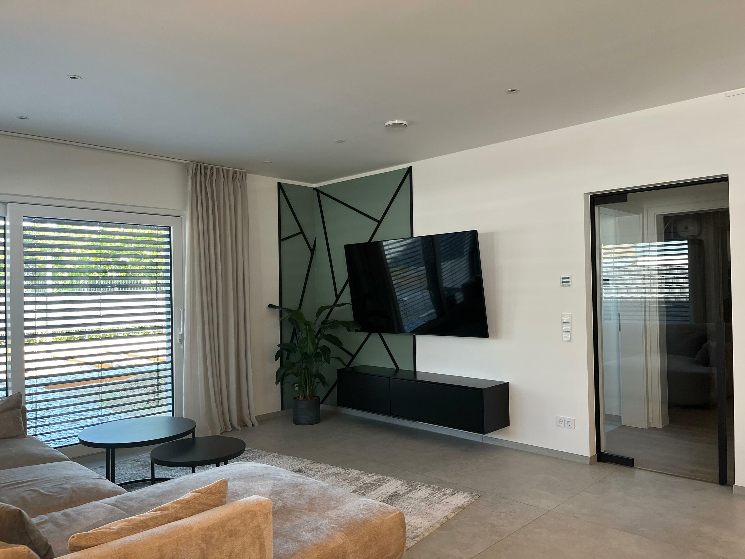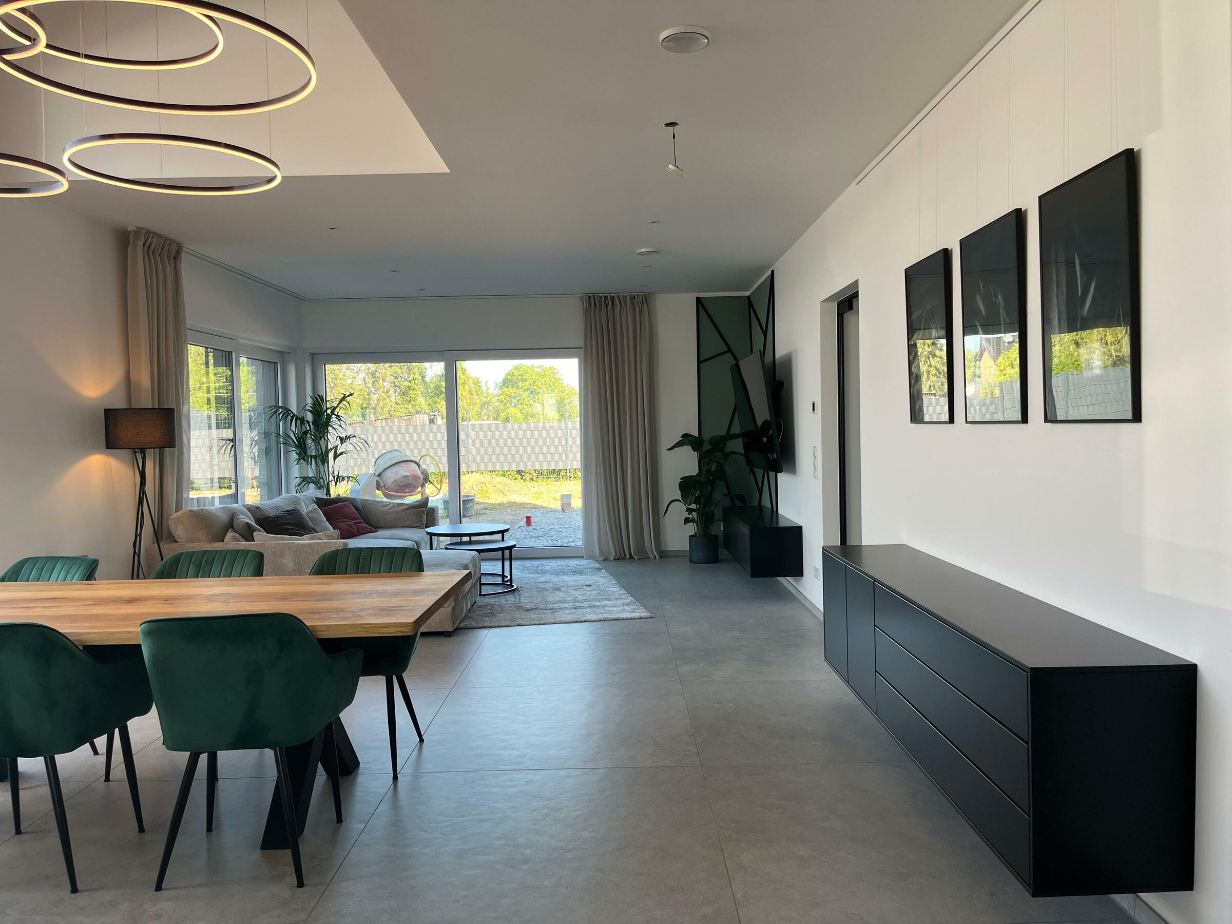 Unser Haus wurde im Jahr 2022 erbaut und befindet sich in einem ruhigen Neubaugebiet an einem Wendehammer. Die Räume des Hauses sind modern und hochwertig möbliert und ausgestattet. Aufgrund der großen und teilweise bodentiefen Fensterflächen fällt viel Tageslicht in die Räume. Alle Fenster im Erdgeschoss können mit Hilfe von Raffstoren abgedunkelt werden. Die Fenster im Obergeschoss sind mit Rollläden ausgestattet. Die moderne Küche verfügt über eine freistehende Kücheninsel. Im Außenbereich kann eine Terrasse und ein Garten für Produktionen genutzt werden. Es stehen 2 private Parkplätze zur Verfügung. Das Haus ist nur ca. 30 Autominuten von Köln entfernt.