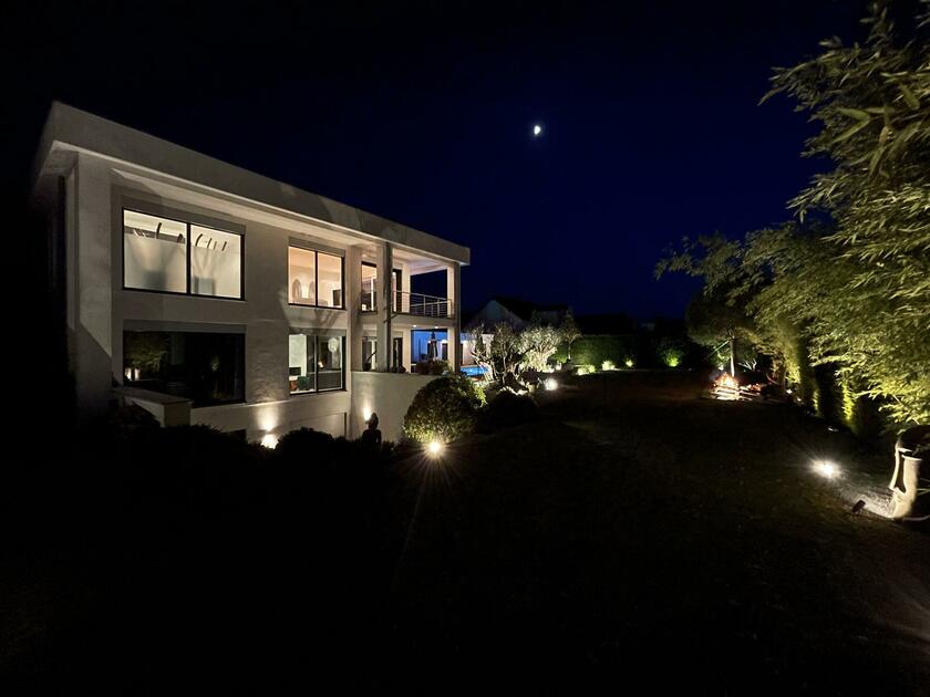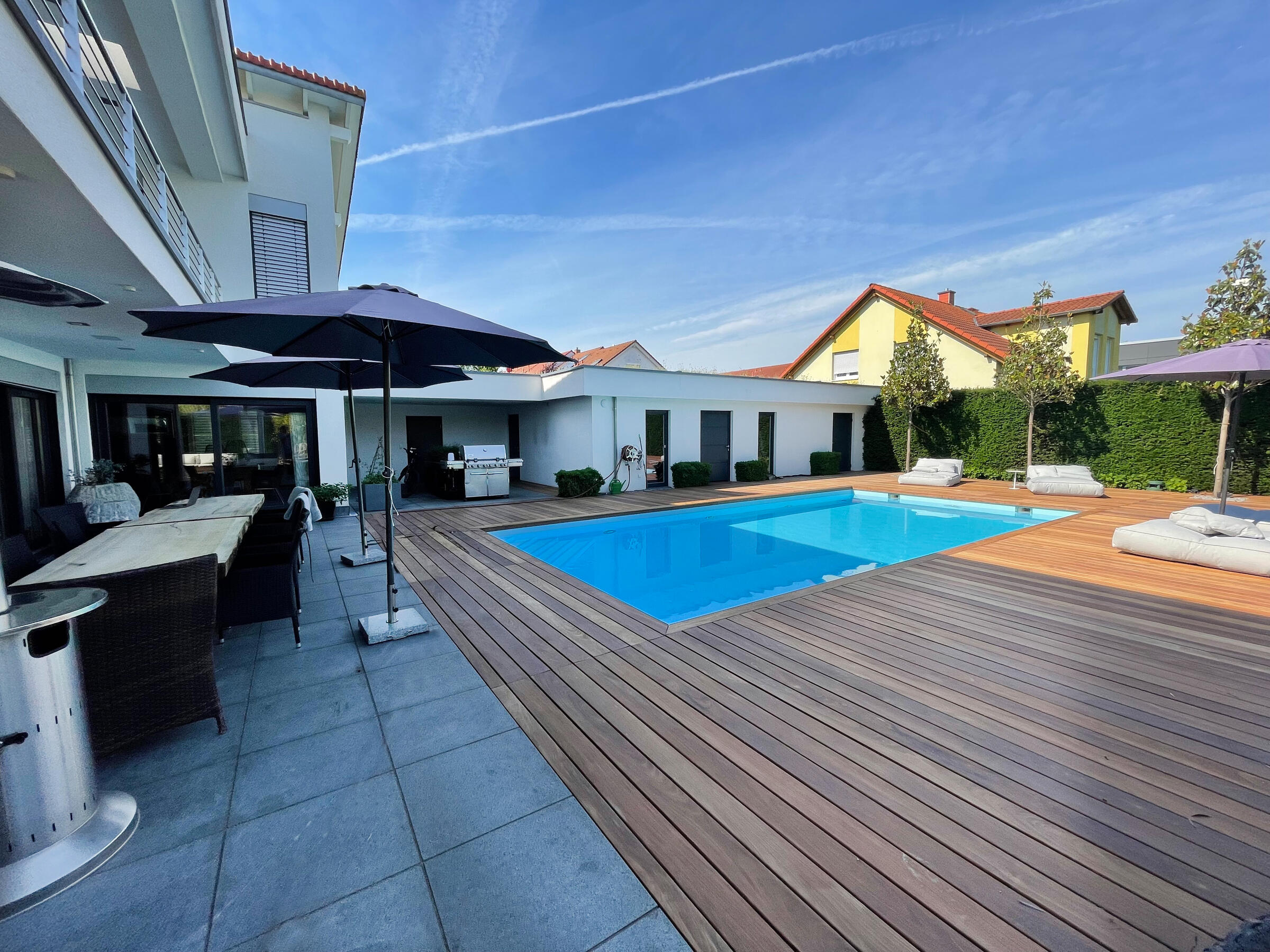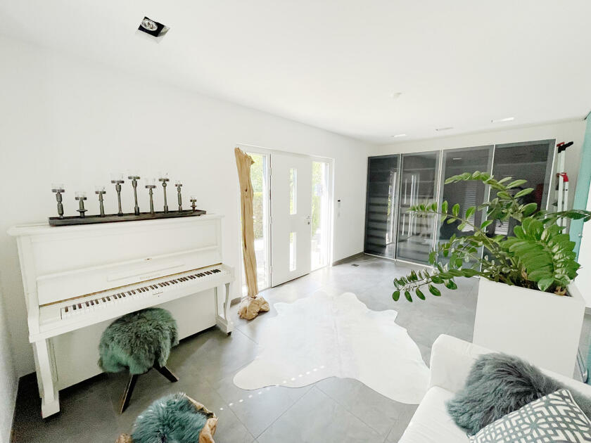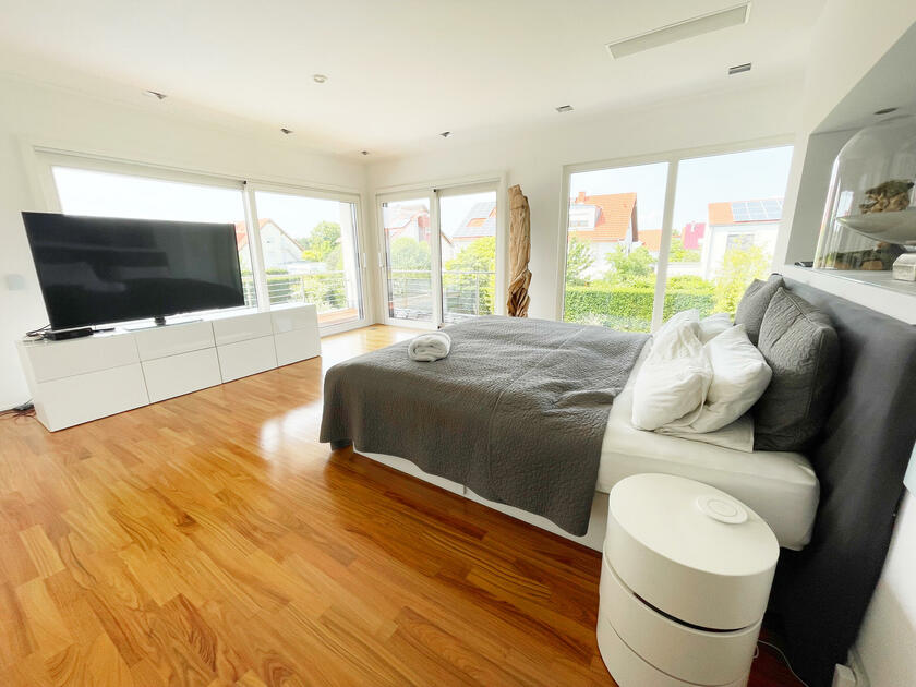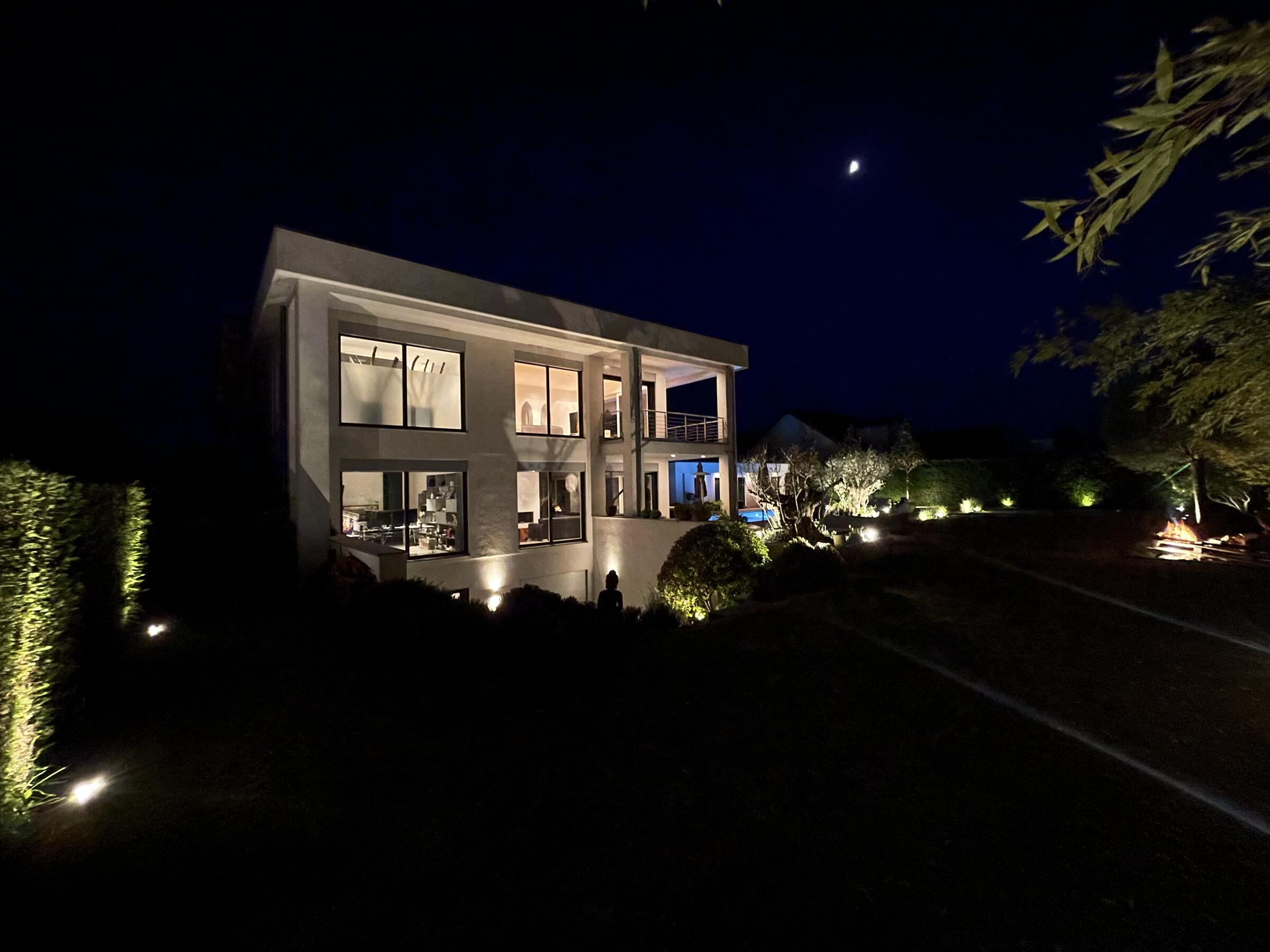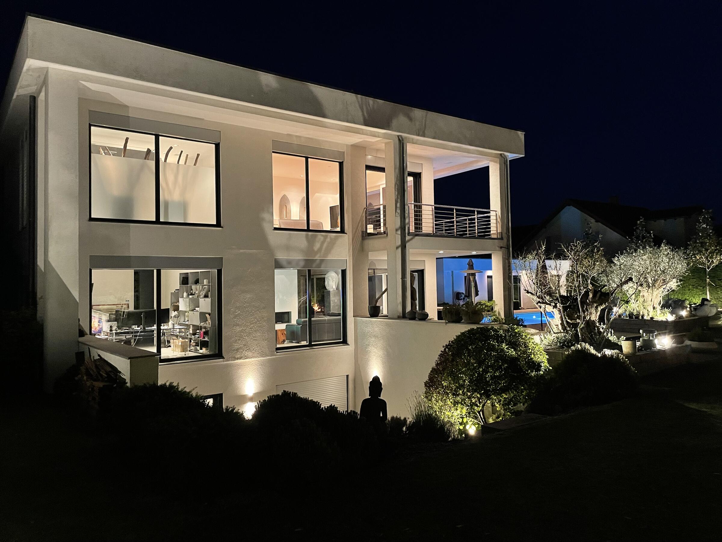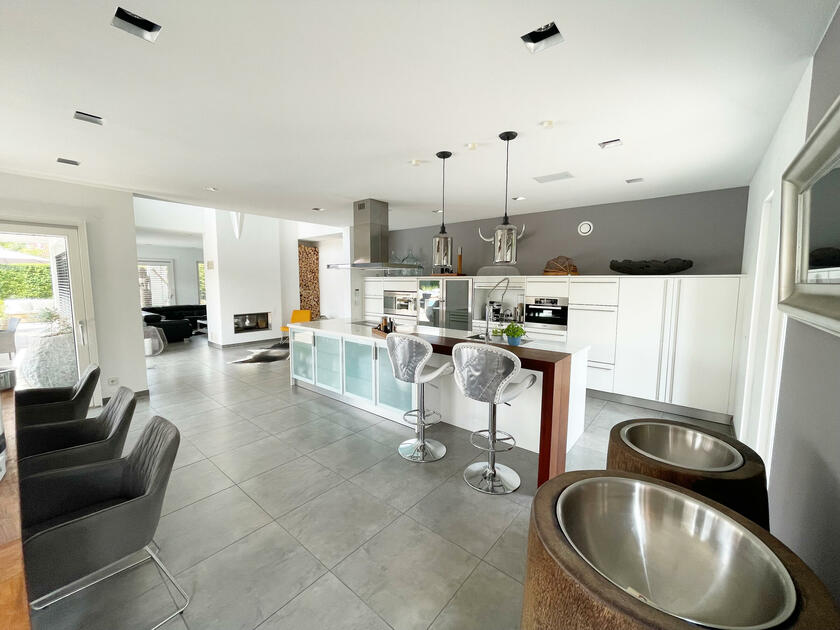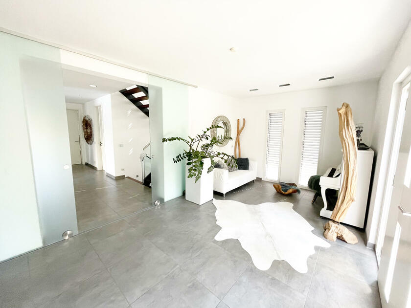 Die helle, moderne und im Bauhausstil gebaute Villa befindet sich auf einem 1.300 m² großem Grundstück in der Metropolregion Rhein-Neckar. Die Villa bietet 540 m² Wohnfläche und besticht durch luxuriösen Wohnkomfort und offen gestaltete und lichtdurchflutete Räume. Eine moderne Küche, ein Fitnessstudio, mehrere Schlafzimmer, Badezimmer und zwei Terrassen gehören ebenso zur Ausstattung der Villa, wie auch ein eigenes Kino. Der 10 m x 5 m große illuminierte Außenpool ist selbstverständlich beheizt und rundet den gepflegten und sichtgeschützten Garten des Grundstückes ab. Darüber hinaus stehen auch Garagen für Produktionen zur Verfügung.