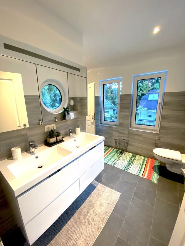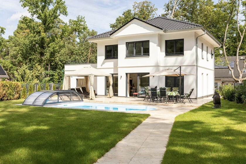 Unser Einfamilienhaus liegt idyllisch im Herzen von Wandlitz, nahe des Liepnitzsee in entspannter und bevorzugter Wohnlage nur 30 km von Berlin entfernt. 2020 im ländlichen Stil erbaut, bietet dieses Haus auf fast 200 m² Wohnfläche den Landhaus-Charme par excellence mit einem offen gestalteten Wohnbereich mit angrenzender großflächiger Außenterrasse. Der gesamte Poolbereich ist großzügig gestaltet und mit Naturstein verlegt. Hier finden Sie Relax-Liegen, einen Pavillon, sowie einen BBQ Grill. Der mit einer Salzanlage betriebene Pool kann sowohl überdacht als auch offen benutzt werden. Auf der Doppelgarage gibt es eine große Dachterrasse. Zum Haus gehört ebenfalls ein großzügig begrünter Garten.