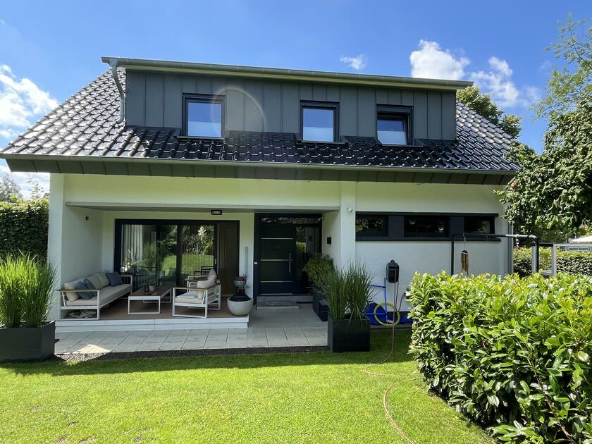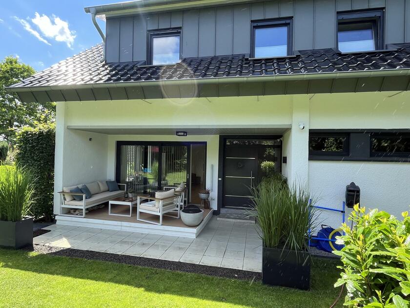 Das Haus liegt in einer ruhigen Einfamilienhaussiedlung aus den 1950er Jahren. Es ist lichtdurchflutet und bietet etwa 190 m² Wohnfläche. Die moderne Einrichtung orientiert sich an Bauhaus- und Jugendstil-Elementen. Das Gebäude wurde 1964 erbaut und 2019 umfassend saniert. Der Haupteingang befindet sich auf der Rückseite, was ideale Bedingungen für Filmaufnahmen im Eingangsbereich schafft. Auch Balkon- und Garagenaufnahmen zur Straßenseite sind gut umsetzbar.