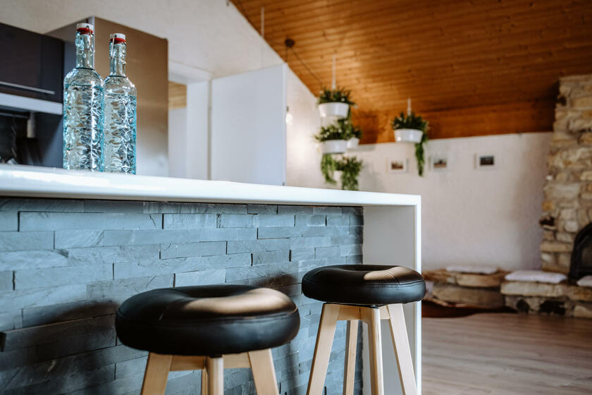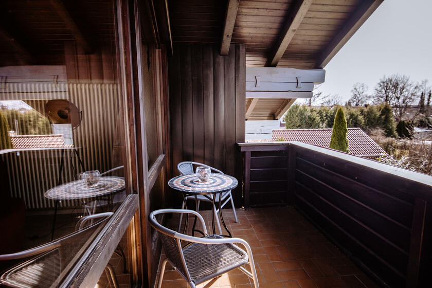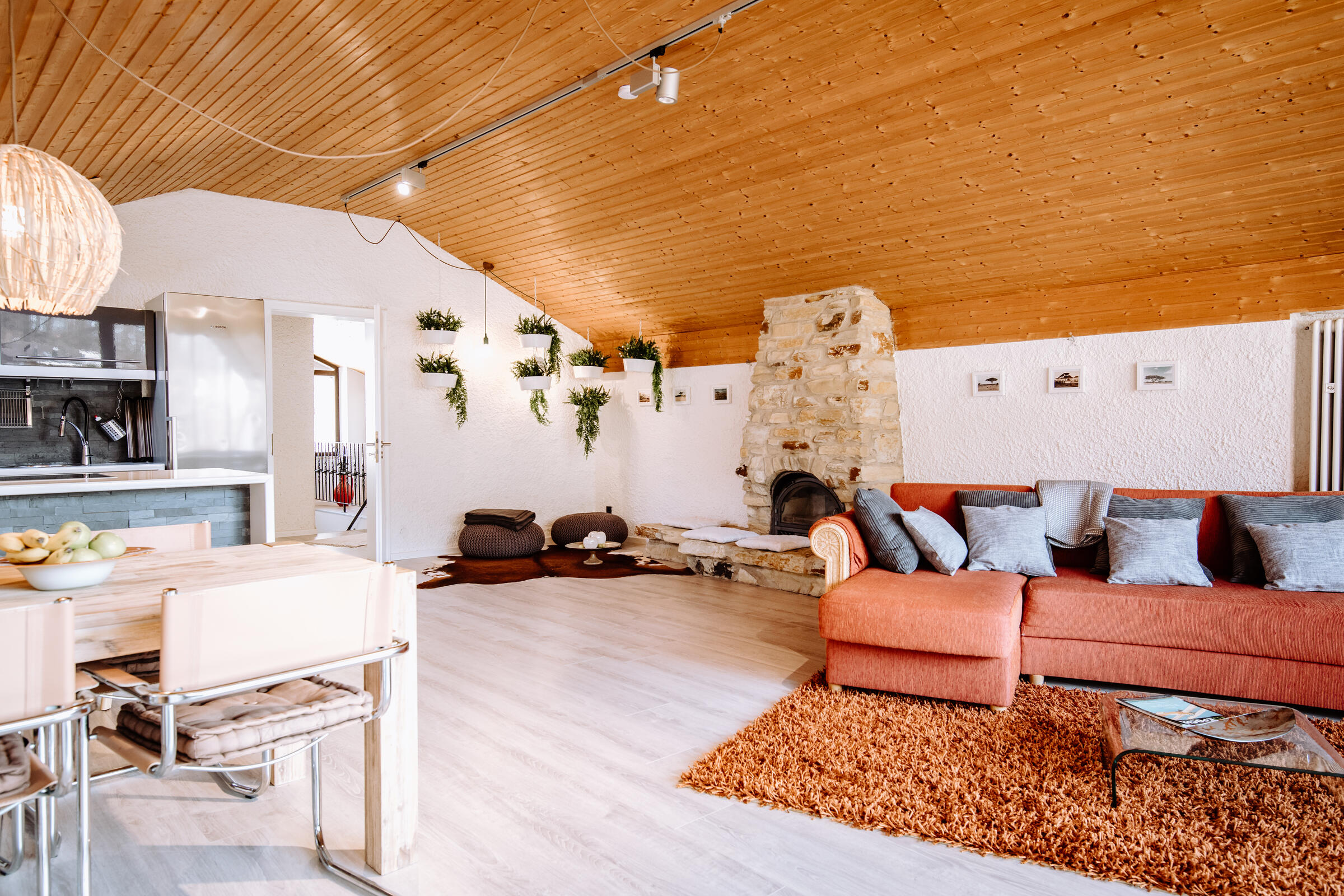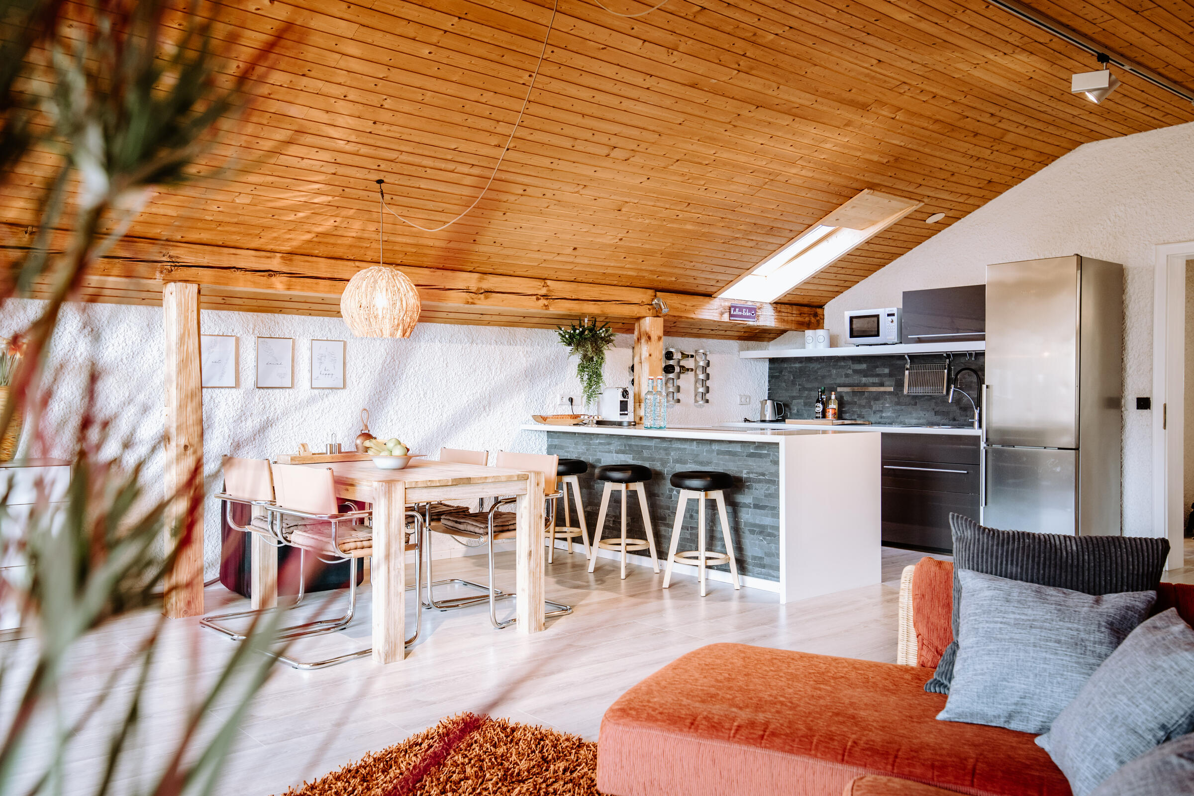 Die idyllische 2-Zimmer-Wohnung befindet sich separiert im Dachgeschoss unseres Einfamilienhauses. Der großzügige Wohn- und Essbereich mit integrierter Kochinsel sorgt für ein angenehmes Raumgefühl. Ein doppelflügeliger Balkonzugang lässt den Raum noch größer erscheinen. Der Balkon ist mit Mosaik-Tischchen und Stühlen möbliert. Eine kleine Chill-Ecke lädt zum Verweilen ein. Sie bietet Sitzgelegenheiten, ebenso die Kaminbank aus Jurakalk-Naturstein. Der Schlafbereich gen Osten lässt Morgensonne ins Bett fallen. Ein Eichenboden mit Teppichen verschafft ein wohnliches Klima. Die Ausblicke sind in alle Richtungen unverbaut.