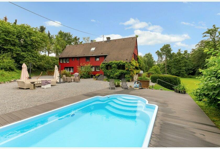 Im Außenbereich befindet sind ein beheizter Pool (ca. 10 x 4 m), ein kleines Saunahaus und ein Jacuzzi. Ebenfalls befindet sich hier eine Fuhrwerksscheune, die beispielsweise zum Unterstellen von Requisiten genutzt werden kann. Die A 46 ist in wenigen Minuten zu erreichen und Düsseldorf in ca. 30 Minuten.