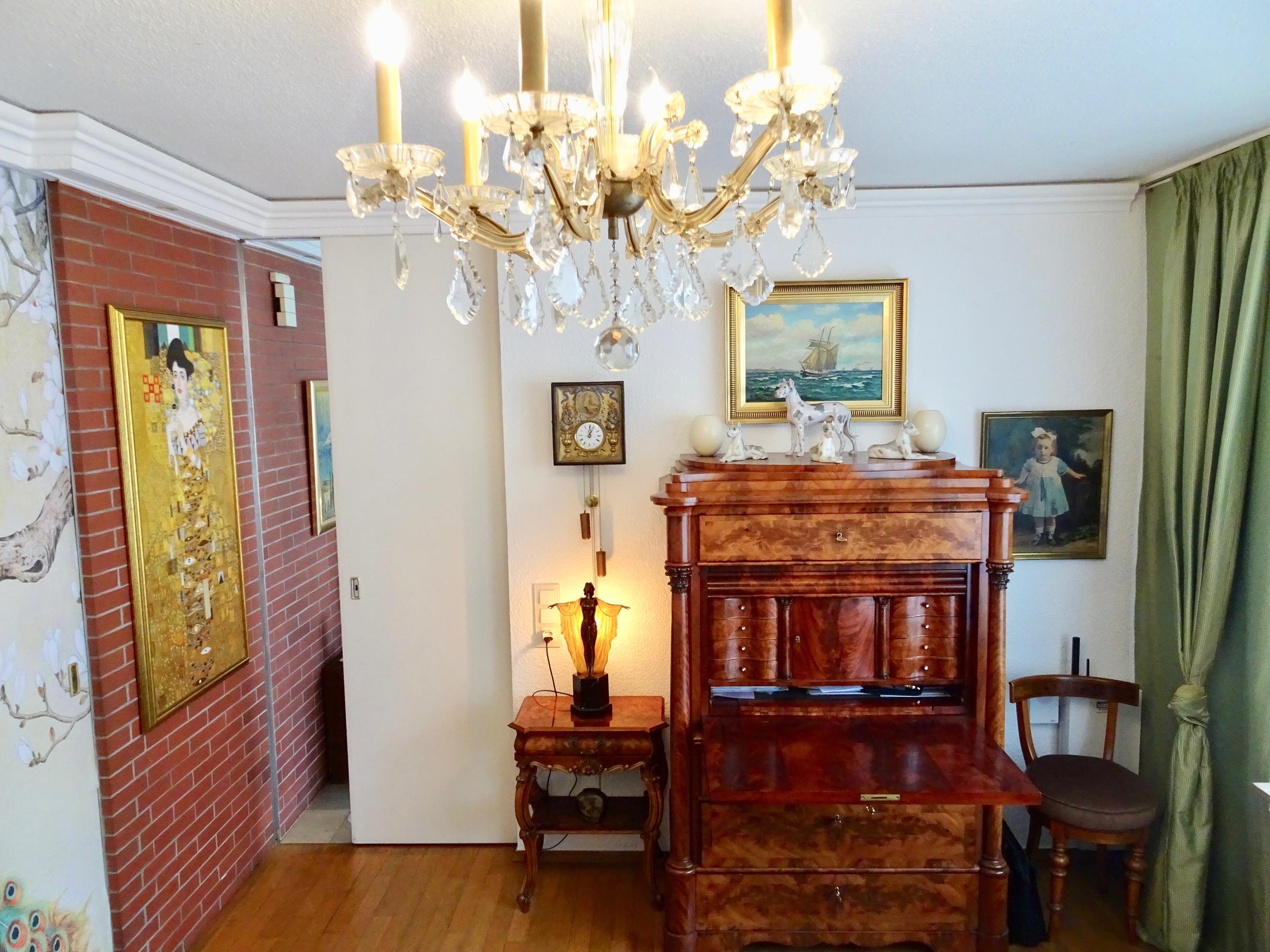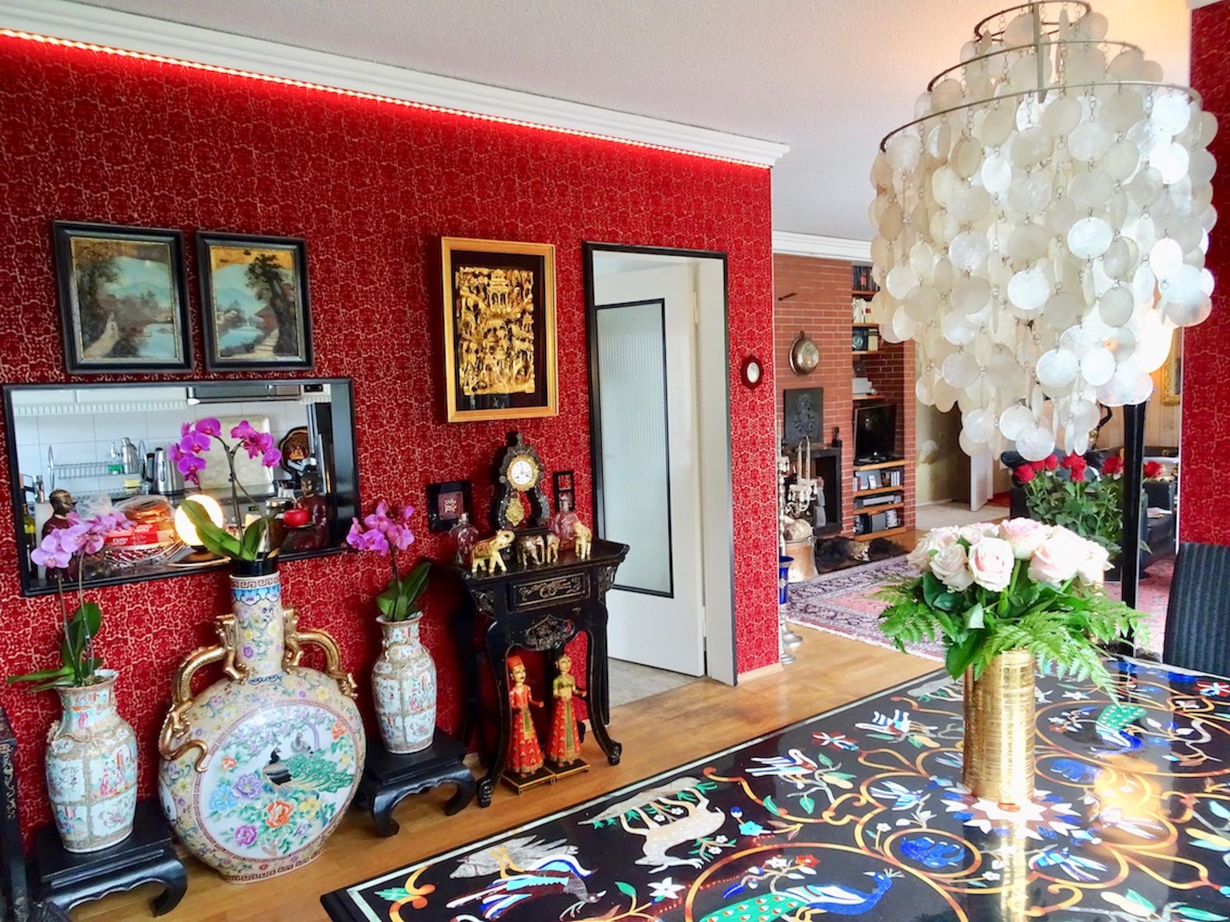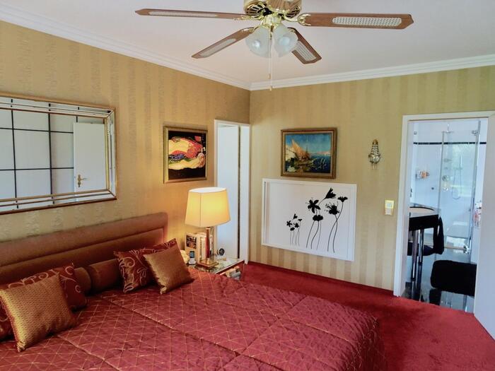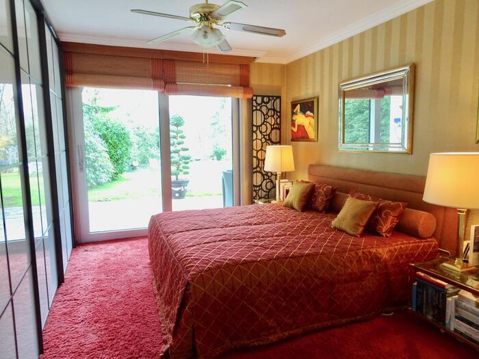 Das freistehende Haus in Wuppertal wurde Anfang der 60er Jahre erbaut und steht auf einem großen, parkähnlichen Grundstück von ca. 2000 m². Die Innenbereiche sind extravagant eingerichtet. Die meisten Räume können über große Schiebetüren miteinander verbunden werden. Der Eingangsbereich ist durch die typischen Glasbausteine sehr hell. Im Erdgeschoss befindet sich das große Wohnzimmer mit offenem Kamin, von hier hat man Zugang auf die Terrasse und einen schönen Blick in den Garten mit kleinem Mosaikpool (inklusive Schwalldusche und farbiger Beleuchtung). An das Wohnzimmer schließt sich das offene Esszimmer an - von hier gelangt man auch in die Küche (Durchreiche vorhanden). Ebenfalls vom Wohnzimmer aus gelangt man durch eine Tapetentür ins Schlafzimmer - ebenfalls mit Zugang zur Terrasse - und einem en suite Badezimmer aus Granit mit Dusche und Badewanne. Ein Gäste-WC ist ebenso vorhanden wie ein Ankleidezimmer. Das Haus ist voll unterkellert und bietet auch hier viel Platz. Die typische Bar darf ebenso wenig fehlen, wie der Weinkeller, ein großes Kinozimmer, Gästezimmer, mehrere Wirtschaftsräume sowie ein weiteres Granitbad mit Dusche. Der Garten ist nicht einsehbar und grenzt an ein kleines Waldgebiet. Der Vorgarten ist mit asiatischen Gewächsen ebenfalls ansprechend gestaltet. Zum Haus gehören zwei Garagen. Zudem ist genügend Parkraum vor dem Haus vorhanden.