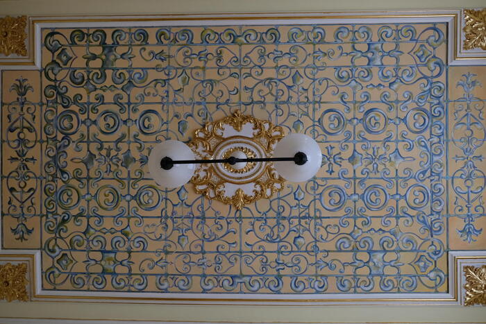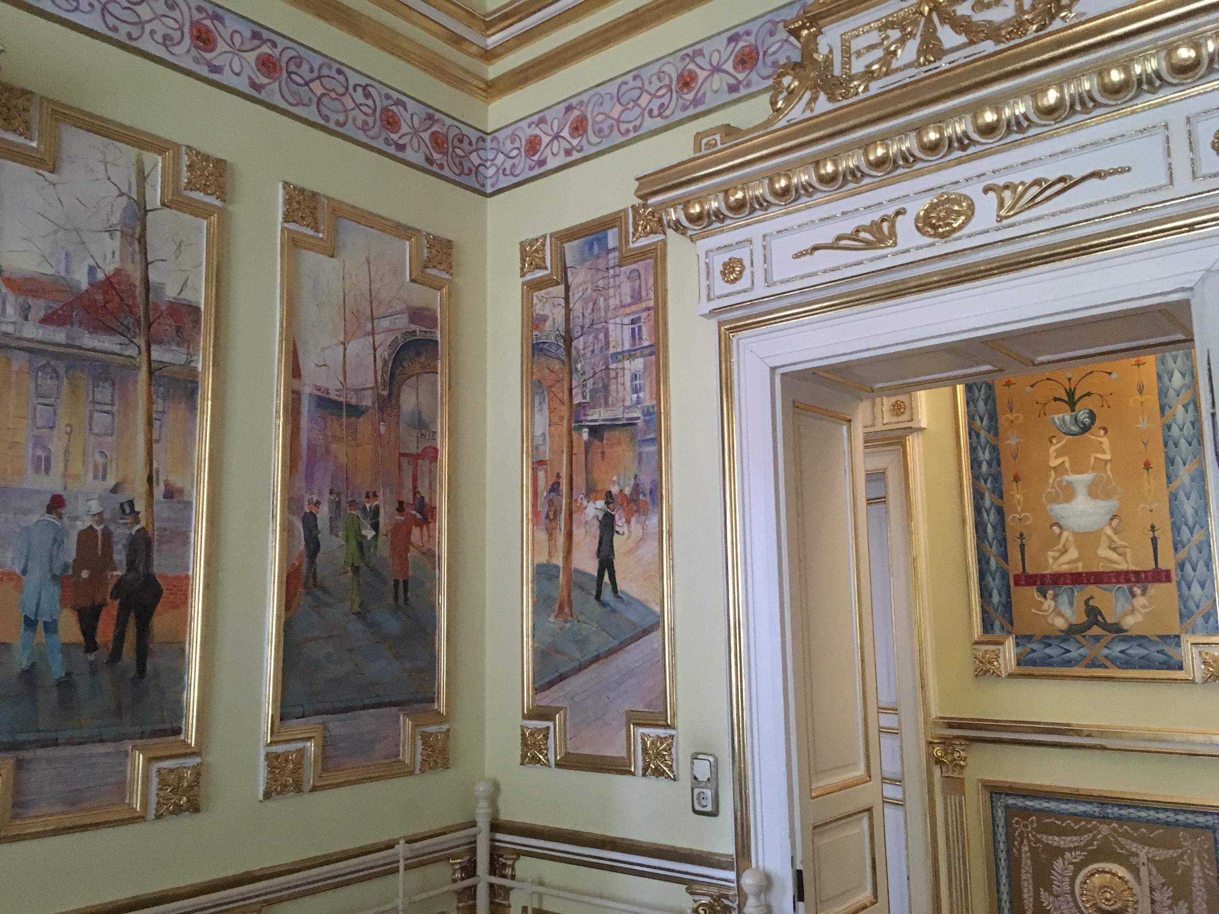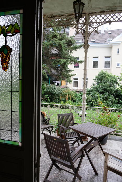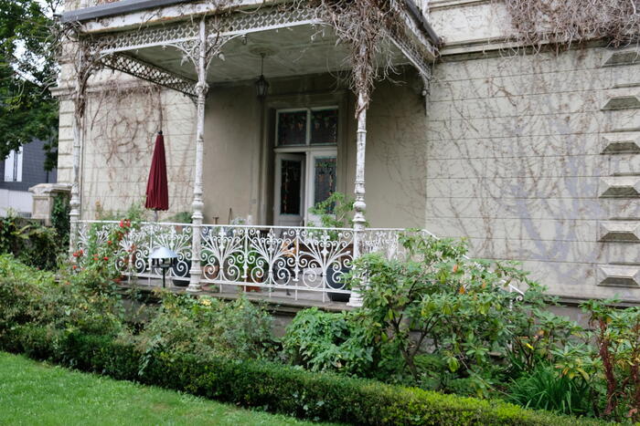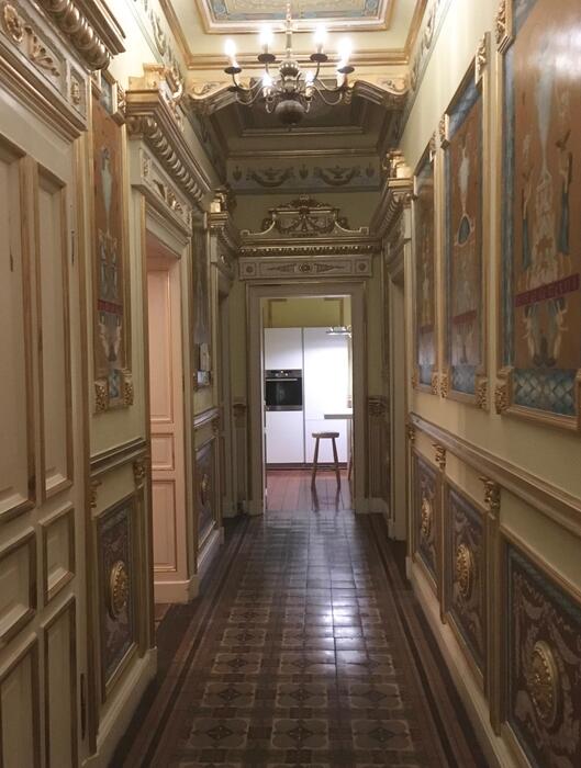 Bei dieser Wohnung in Nordrhein-Westfalen handelt es sich um das gesamte Parterre sowie die überdachte Veranda einer Fabrikantenvilla aus der Gründerzeit. Die Villa umgibt ein großzügiger straßenabgewandter Garten, in dem ein hölzernes originales Kutschenhaus aus der Zeit 1878 steht. Das Haupthaus steht unter Denkmalschutz, seine Fassade sieht aber durch einen ehemaligen flächendeckenden Efeubewuchs heute verwunschen aus. Betritt man durch den üppig verzierten Hauseingang die Wohnung, so tritt man in einen langen Flur mit für die Zeit typischen Musterkacheln am Boden, von dem aus linker Hand Gäste-, Ess- und Wohnzimmertür abgehen. Diese drei Räume sind ausserdem jeweils miteinander verbunden, was durch alle Räume interessante Durchblicke ermöglicht. Küche, Schlafzimmer und Bad liegen gegenüber und haben jeweils ihren Fensterblick in den Garten. Die gesamten Wände der Wohnung sind reichhaltig mit Blattgold, Stuckelementen und Wandmalereien verziert. Jeden Raum schmückt dabei eine andere, individuelle und sehr detailreiche Wandbemalung und Deckenornamentik. Lassen die Motive im Schlafzimmer und Bad die Malerei der Wiener Sezession um die Jahrhundertwende anklingen, so zitieren andere Räume teils Motive des Pariser Impressionismus, Klassizismus oder des Orients. Die Einrichtung der Wohnung mischt antike mit modernen Möbeln, teils Designerstücken, die Deckenlampen sind dem jeweiligen Charakter des Raumes individuell angepasst. Im Wohnzimmer befindet sich ein Flügel der Marke Steinway im viktorianischen Stil , Baujahr 1876. Zu der Wohnung gehört ein abschließbarer Kellerraum von ca. 25 m² der gegebenenfalls auch als Zwischenlager für Equipment zu nutzen wäre.