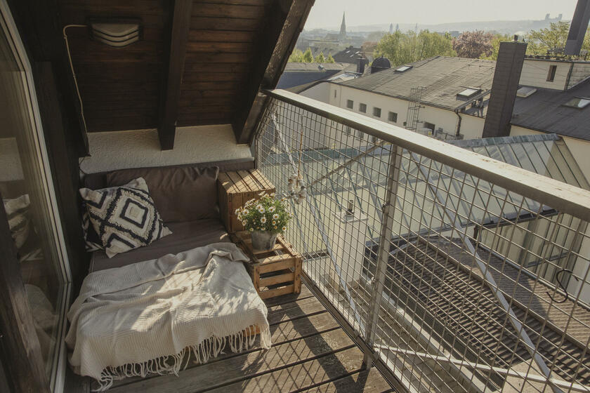 Die große Fensterfront mit dem Balkon ist nach Süden gelegen, hier scheint die Sonne von Sonnenaufgang bis Nachmittags direkt hinein. Die Fenster im Bad und im Küchen- und Schlafbereich sind in Richtung Westen. Ein Personenaufzug ist vorhanden, somit auch ein barrierefreier Zugang (ausgenommen der Schlafebene).