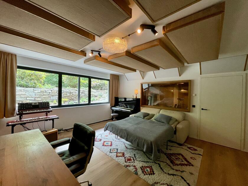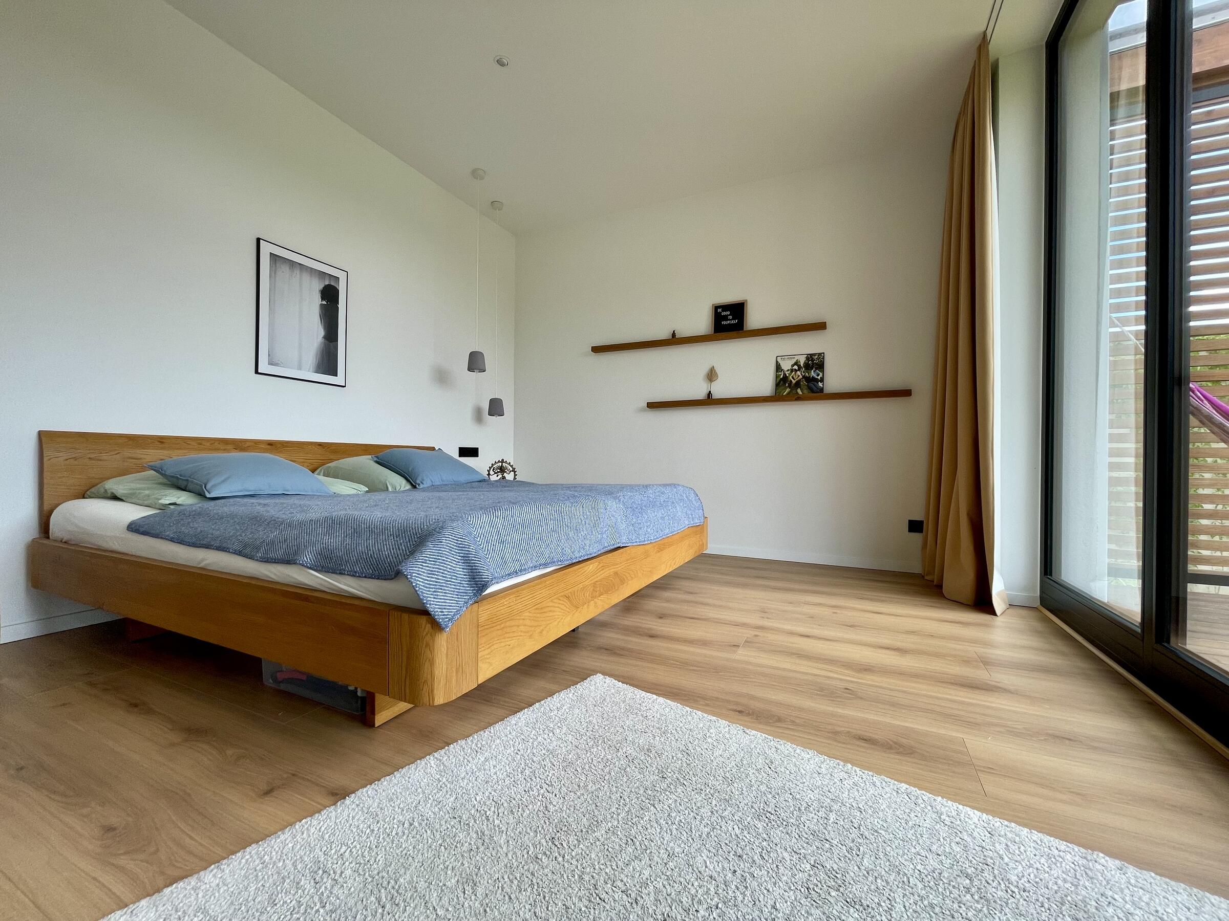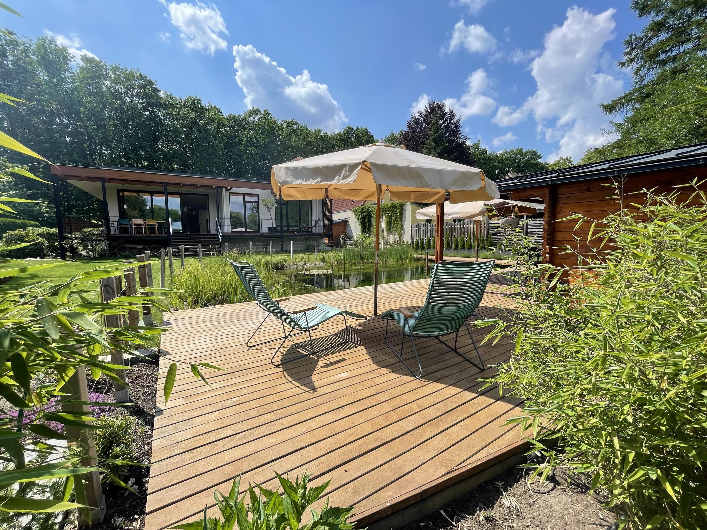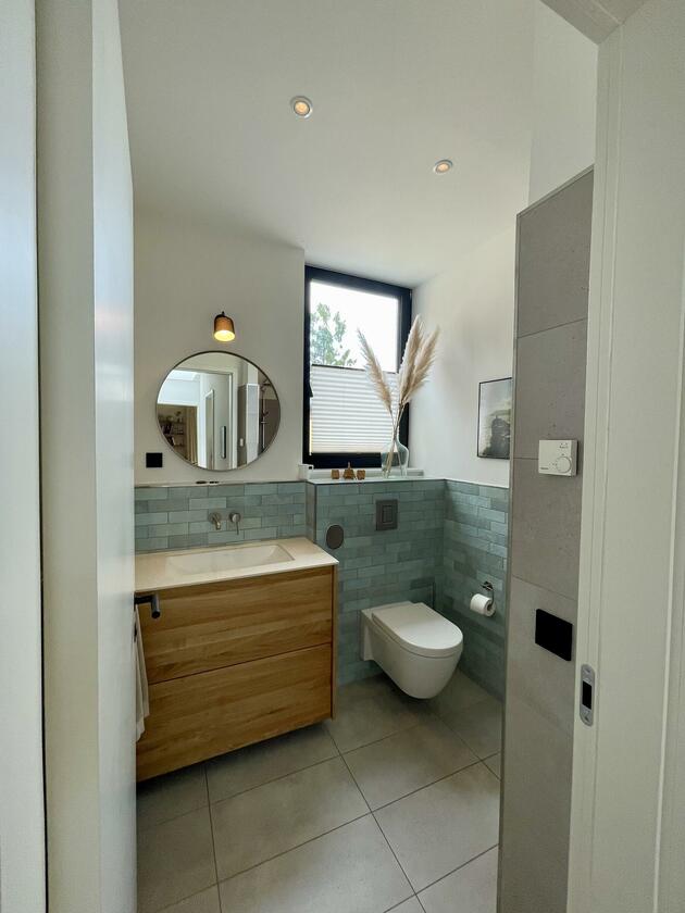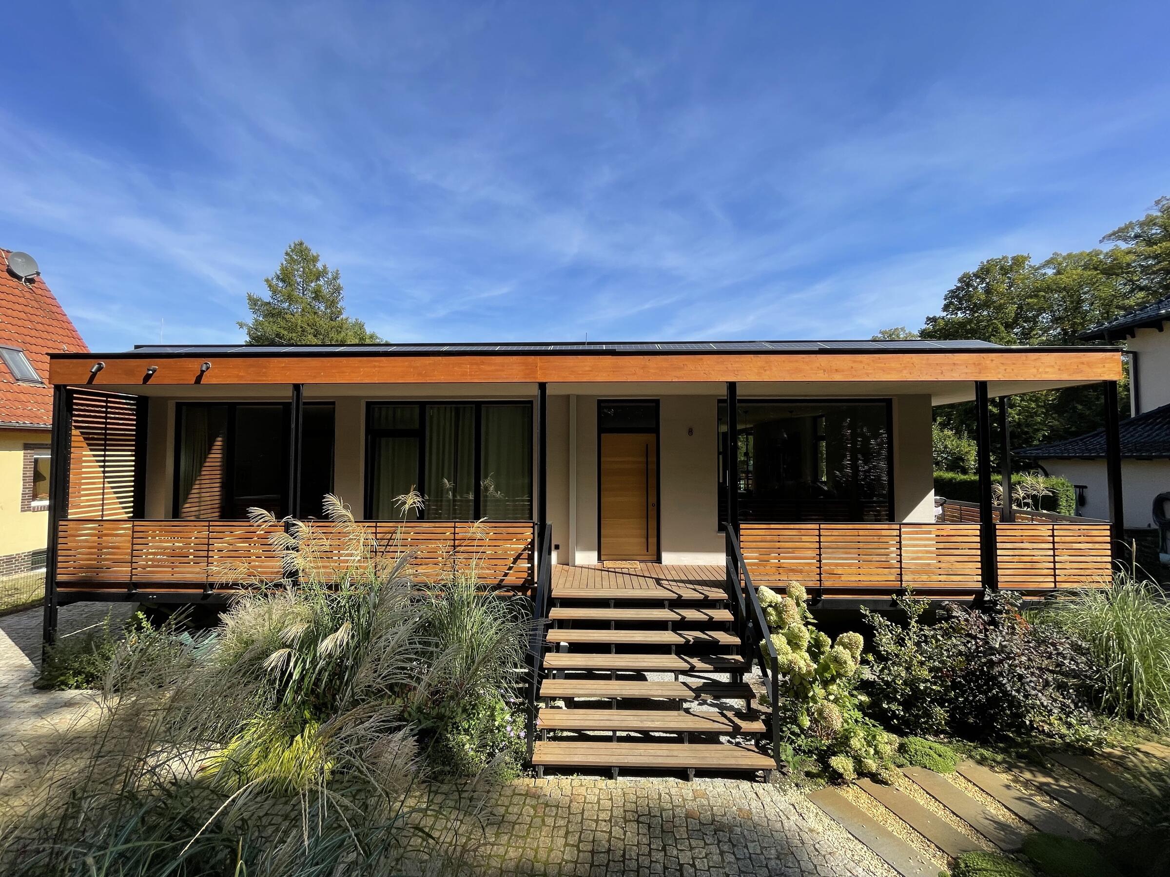 Das im Jahr 2019 im Bauhausstil errichtete Haus befindet sich in einer ruhigen Wohngegend. Der große Wohn- und Essbereich ist offen gestaltet und geht direkt in die modern ausgestattete Küche über. Durch die bodentiefen Fenster fällt viel Tageslicht in die Wohnräume. Die Fenster der Gästezimmer, des Schlafzimmers und des Musikstudios sind mit Blackout-Vorhängen ausgestattet. Die Fenster im Wohnbereich haben lichtdurchlässige Vorhänge. Die Möbel der Räume, außer des Musikstudios, dürfen ausgeräumt bzw. ausgetauscht werden. Im Außenbereich des Hauses gibt es einen Schwimmteich, einen Naturgarten, ein Saunahaus und eine umlaufende Terrasse, die alle Räume im Erdgeschoss miteinander verbindet. Auf dem Grundstück stehen 2 Pkw-Parkplätze zur Verfügung. Weitere Parkplätze gibt es auf der Straße vor dem Grundstück.