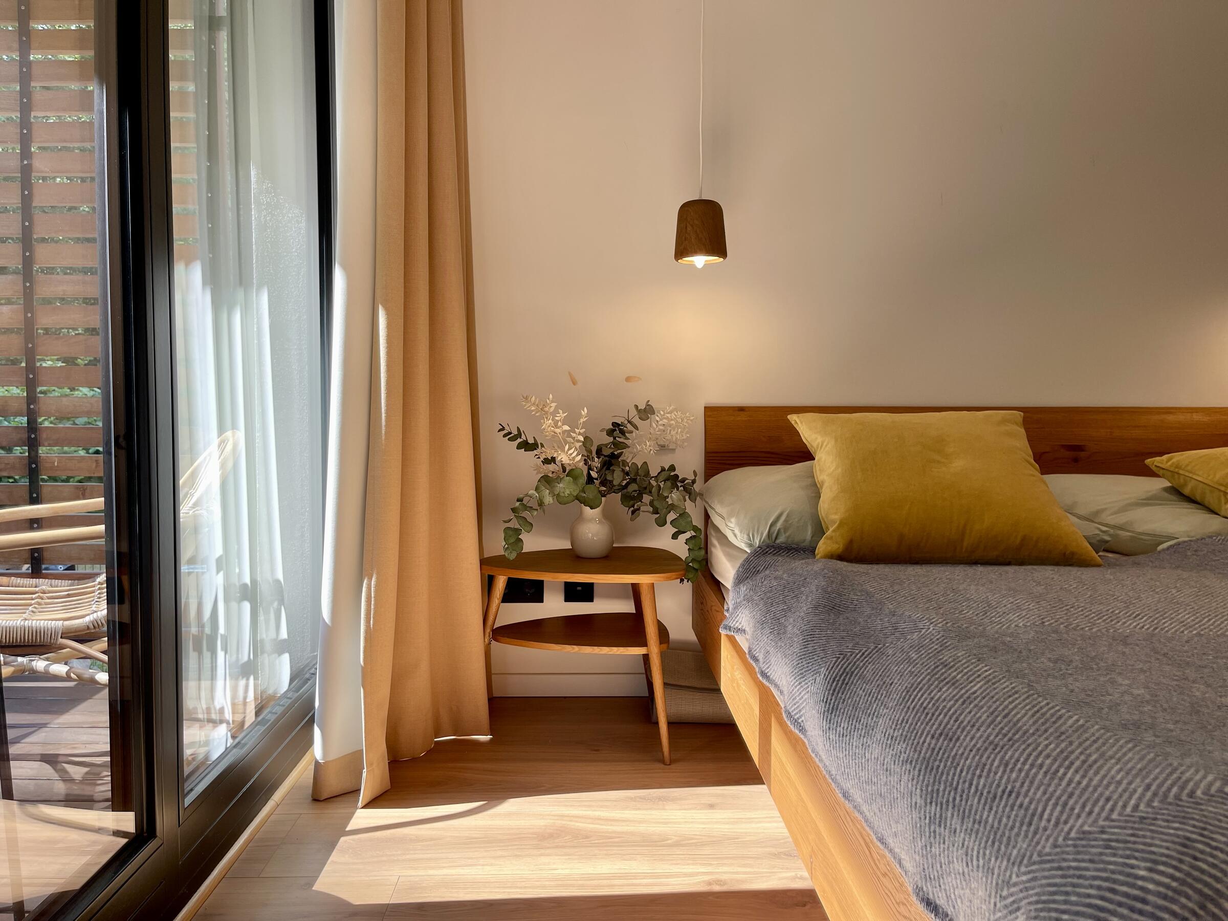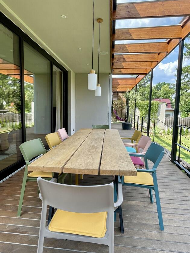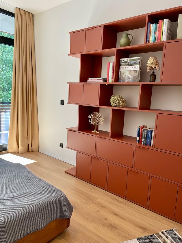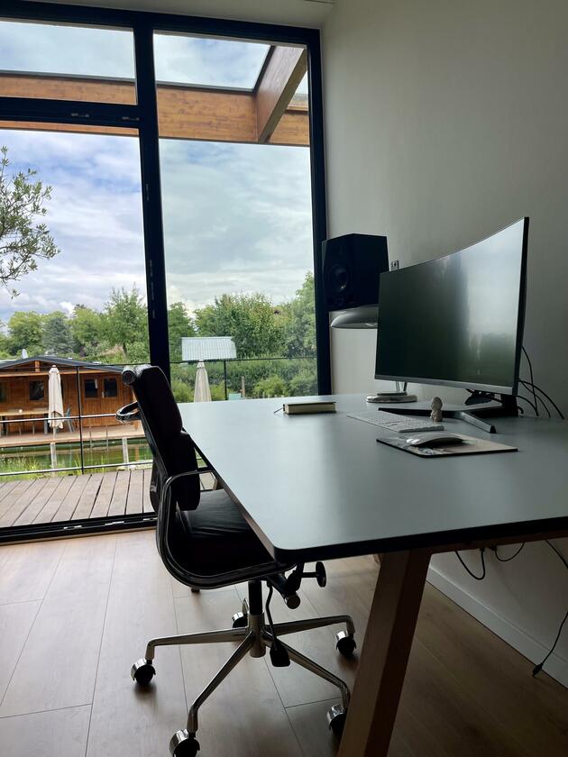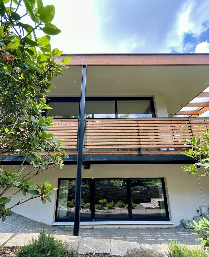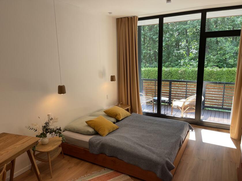 Das im Jahr 2019 im Bauhausstil errichtete Haus befindet sich in einer ruhigen Wohngegend. Der große Wohn- und Essbereich ist offen gestaltet und geht direkt in die modern ausgestattete Küche über. Durch die bodentiefen Fenster fällt viel Tageslicht in die Wohnräume. Die Fenster der Gästezimmer, des Schlafzimmers und des Musikstudios sind mit Blackout-Vorhängen ausgestattet. Die Fenster im Wohnbereich haben lichtdurchlässige Vorhänge. Die Möbel der Räume, außer des Musikstudios, dürfen ausgeräumt bzw. ausgetauscht werden. Im Außenbereich des Hauses gibt es einen Schwimmteich, einen Naturgarten, ein Saunahaus und eine umlaufende Terrasse, die alle Räume im Erdgeschoss miteinander verbindet. Auf dem Grundstück stehen 2 Pkw-Parkplätze zur Verfügung. Weitere Parkplätze gibt es auf der Straße vor dem Grundstück.