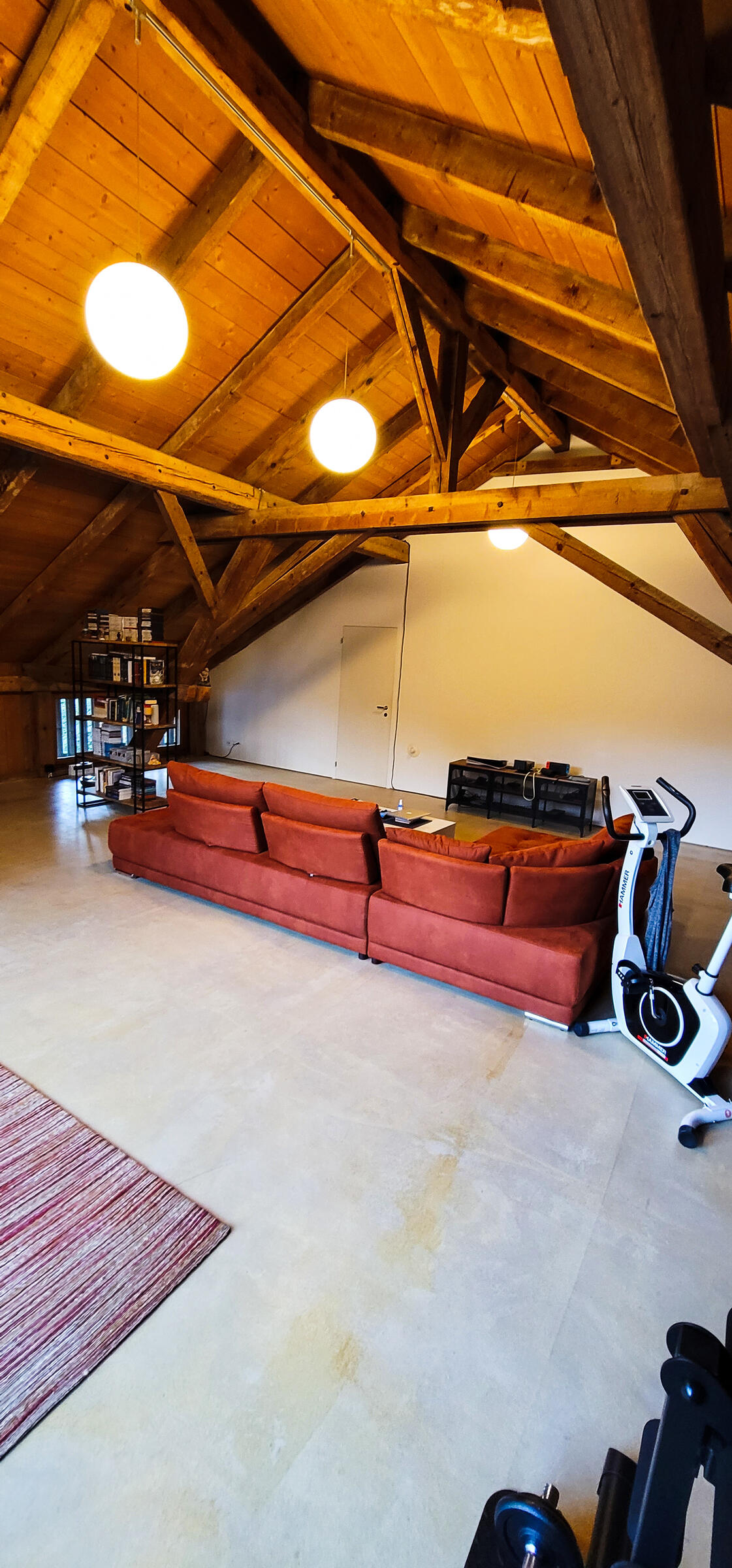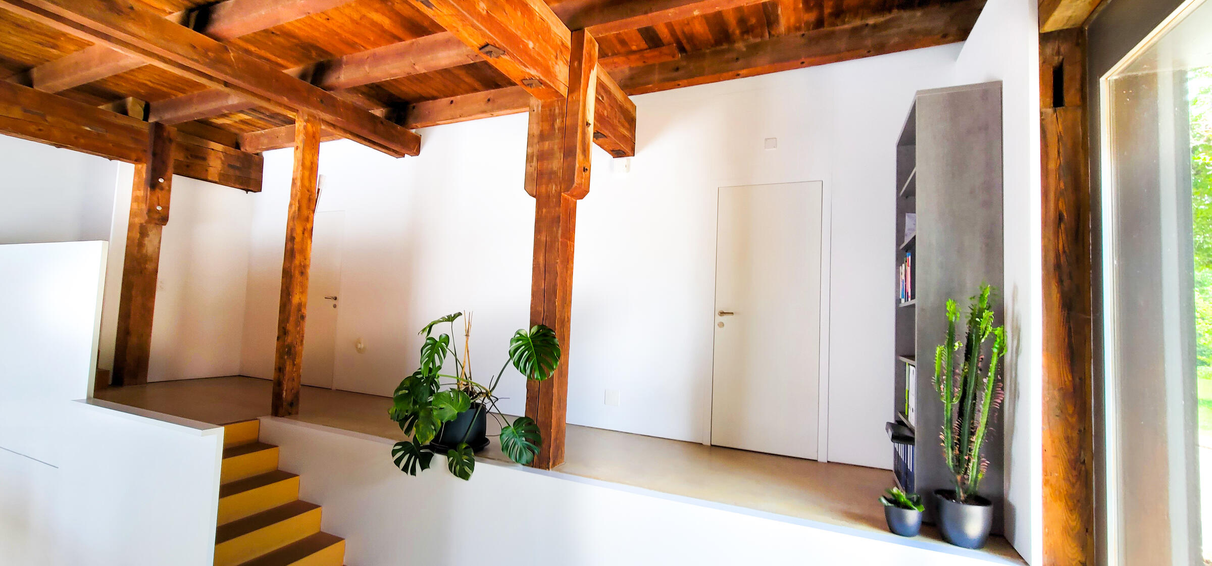 Meine Wohnung verteilt sich auf Erdgeschoss und 1. Obergeschoss. Im Erdgeschoss befinden sich ein grosszügiger Eingangsbereich, an welchem direkt die offene Küche anschliesst. Auf einer Zwischentage befinden sich zwei separate Zimmer. Von einem der Zimmer aus, kann direkt das Badezimmer mit WC und Dusche erreicht werden. Eine Holztreppe führt die zweite Etage, auf der sich ein zweites Bad mit Badewanne und ein grosszügiges Wohnzimmer befinden. Alle Räume verfügen über einen steinölversiegelten Anhydritboden und grosse bodentiefe Fenster (mit Ausnahme des Bades im 1. Stock, welches über ein Dachfenster verfügt) und damit über Tageslicht. Die Wohnung war ursprünglich Teil einer Brennerei, welche im Jahre 2004 umgebaut wurde. Die gesamte Balkenlage von damals wurde erhalten und gibt der Wohnung ihren Charme. Direkt vor dem Hauseingang befindet sich Platz für drei Parkplätze.