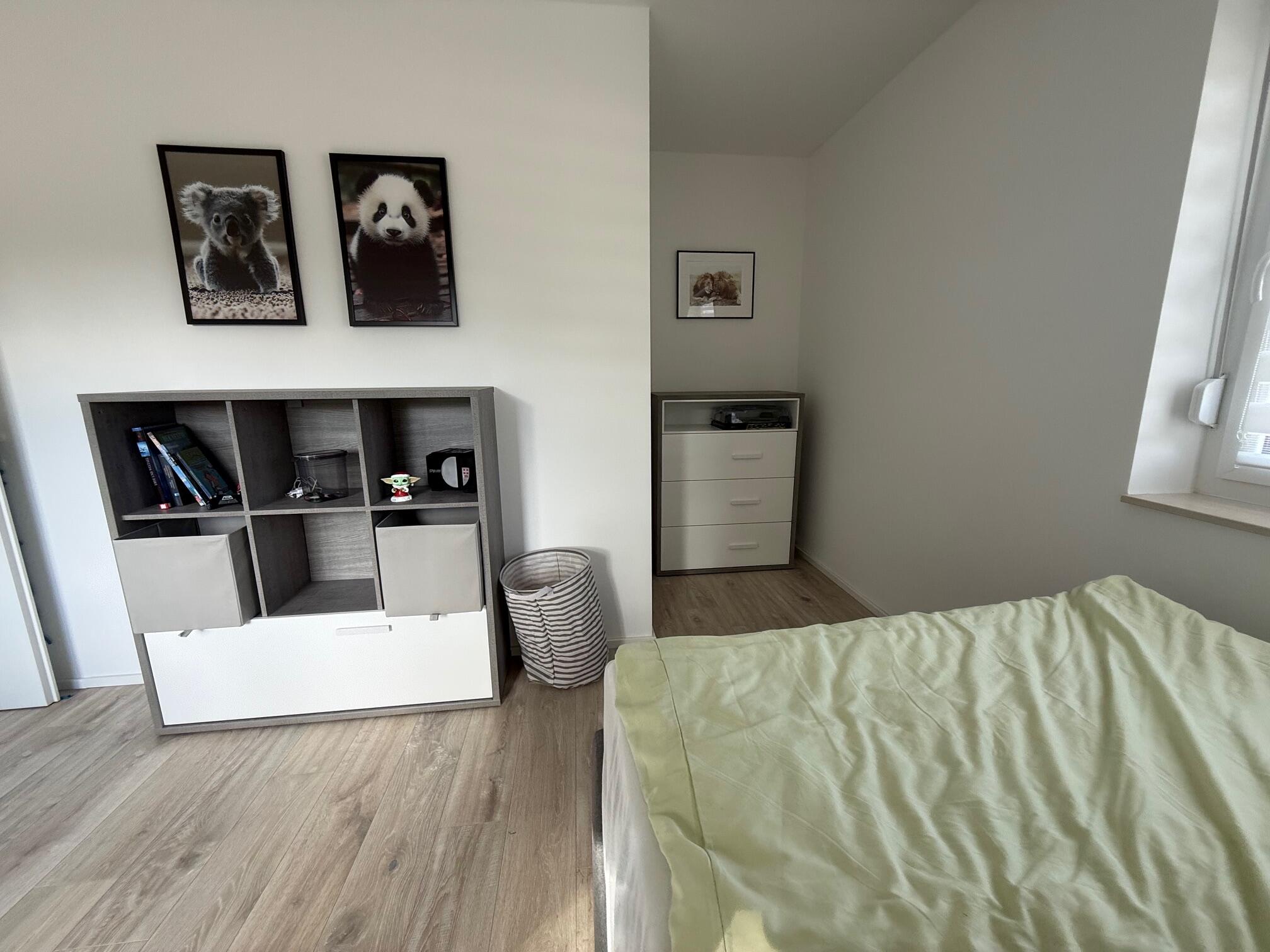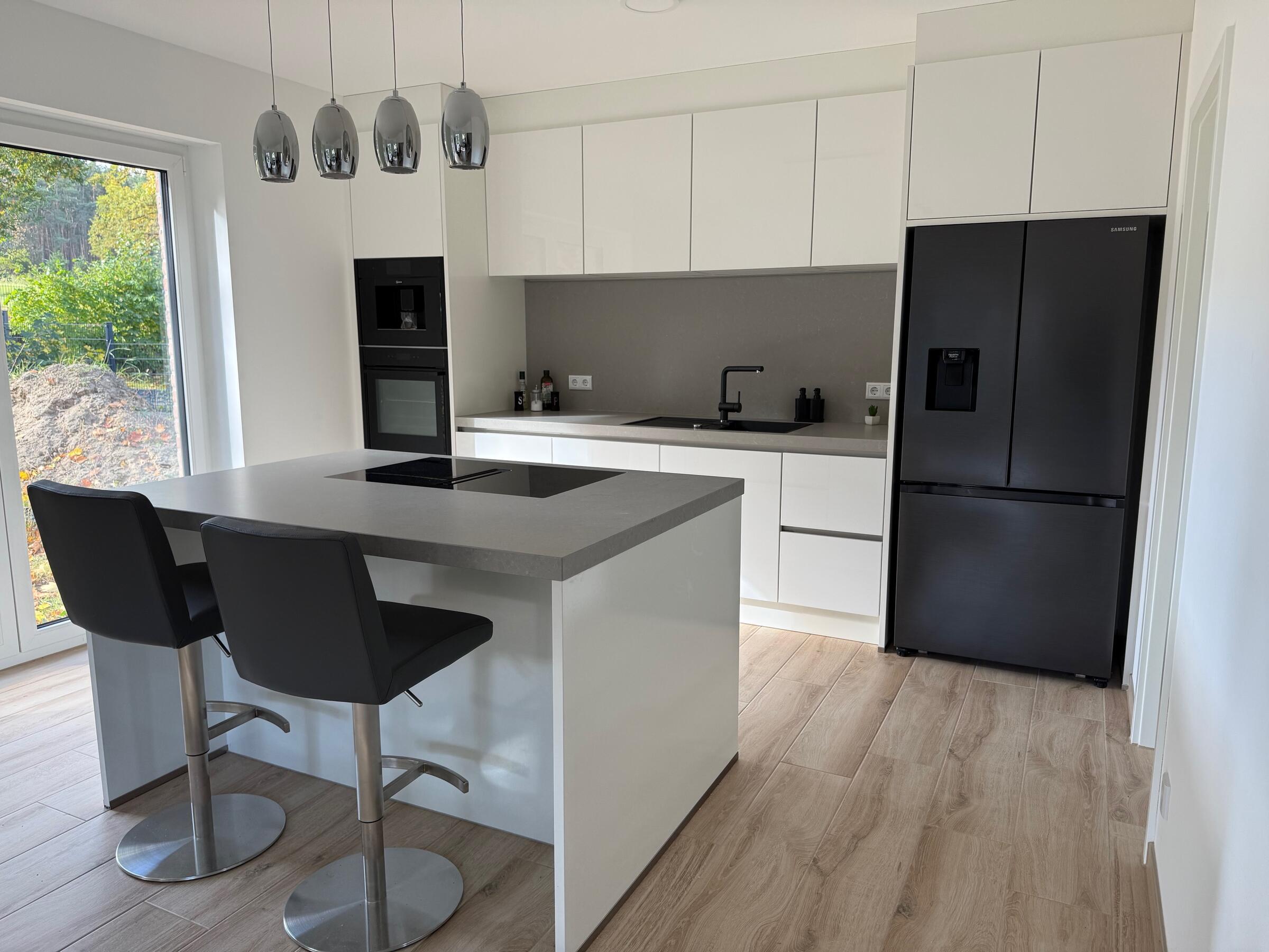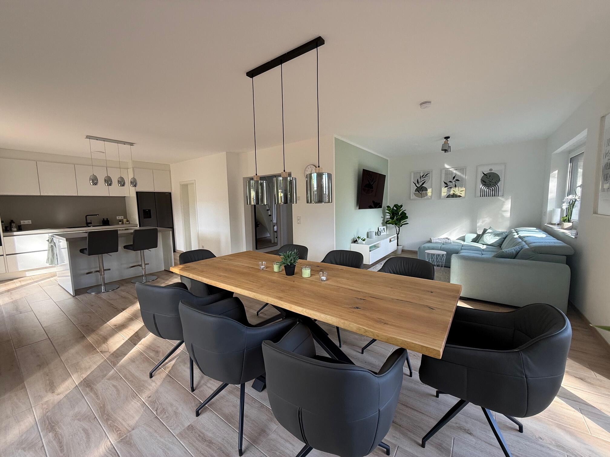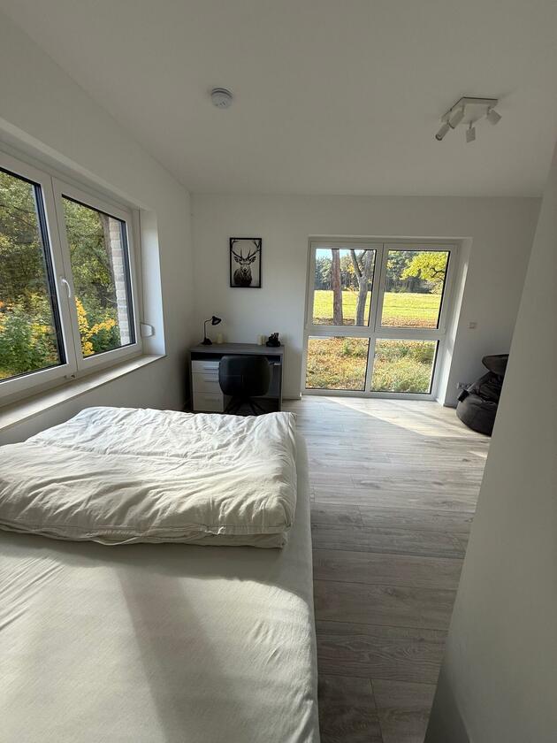 Unser Einfamilienhaus, ein moderner Neubau aus dem Jahr 2025, besticht durch seine helle und freundliche Atmosphäre. Große Fensterflächen sorgen ganztägig für eine angenehme natürliche Belichtung und lassen viel Sonnenlicht in die großzügige Küchen-, Ess- und Wohnlandschaft strömen. Die Räume sind offen gestaltet und bieten viel Platz für gemeinsame Aufenthalte oder kreative Arbeitsphasen. Das Haus ist mit hochwertigen Materialien ausgestattet: helle Böden, moderne Einbauten in der Küche und eine stilvolle, klare Linie prägen das Gesamtbild. Alle Fenster sind mit Jalousien ausgestattet, sodass die Räume bei Bedarf abgedunkelt werden können. Neben dem großen Wohnbereich stehen weitere Zimmer zur Verfügung, darunter ein Arbeitszimmer im Obergeschoss, das aktuell nicht möbliert ist und gern als Abstell- oder Vorbereitungsraum genutzt werden darf. Insgesamt bietet das Haus ein modernes, lichtdurchflutetes und komfortables Umfeld, das vielseitig genutzt werden kann.