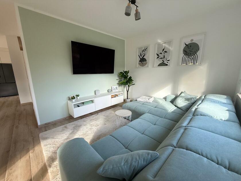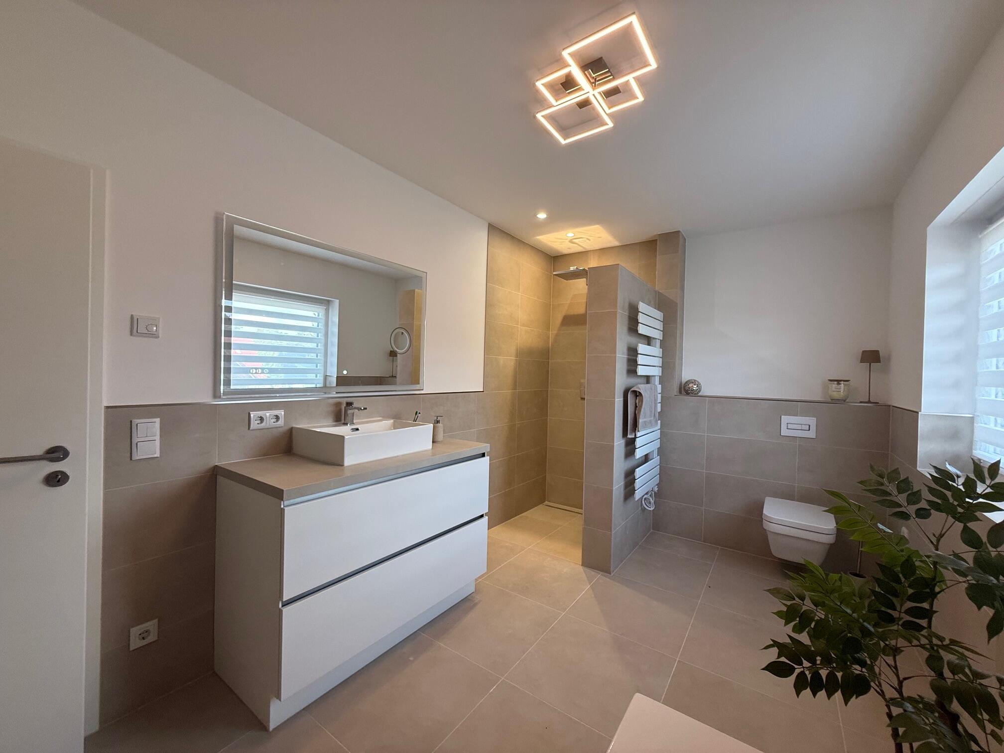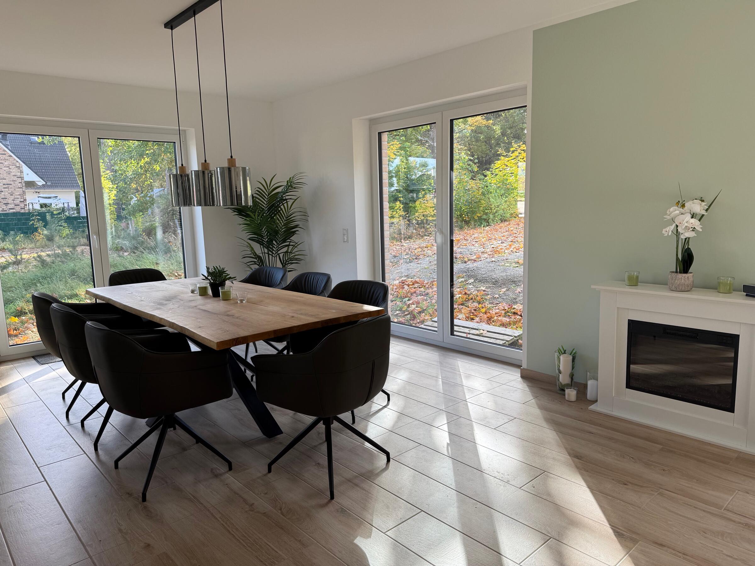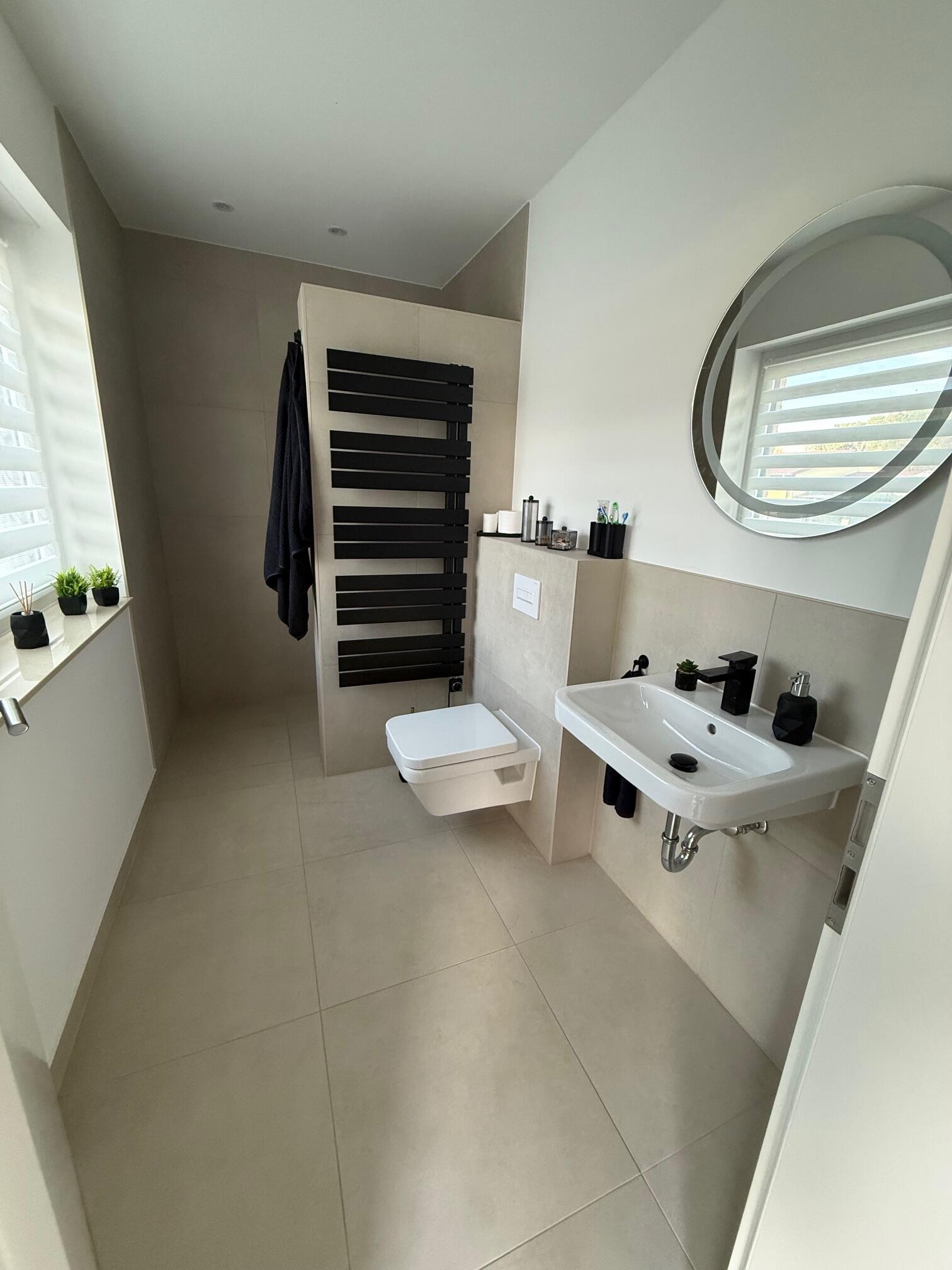 Unser Einfamilienhaus, ein moderner Neubau aus dem Jahr 2025, besticht durch seine helle und freundliche Atmosphäre. Große Fensterflächen sorgen ganztägig für eine angenehme natürliche Belichtung und lassen viel Sonnenlicht in die großzügige Küchen-, Ess- und Wohnlandschaft strömen. Die Räume sind offen gestaltet und bieten viel Platz für gemeinsame Aufenthalte oder kreative Arbeitsphasen. Das Haus ist mit hochwertigen Materialien ausgestattet: helle Böden, moderne Einbauten in der Küche und eine stilvolle, klare Linie prägen das Gesamtbild. Alle Fenster sind mit Jalousien ausgestattet, sodass die Räume bei Bedarf abgedunkelt werden können. Neben dem großen Wohnbereich stehen weitere Zimmer zur Verfügung, darunter ein Arbeitszimmer im Obergeschoss, das aktuell nicht möbliert ist und gern als Abstell- oder Vorbereitungsraum genutzt werden darf. Insgesamt bietet das Haus ein modernes, lichtdurchflutetes und komfortables Umfeld, das vielseitig genutzt werden kann.